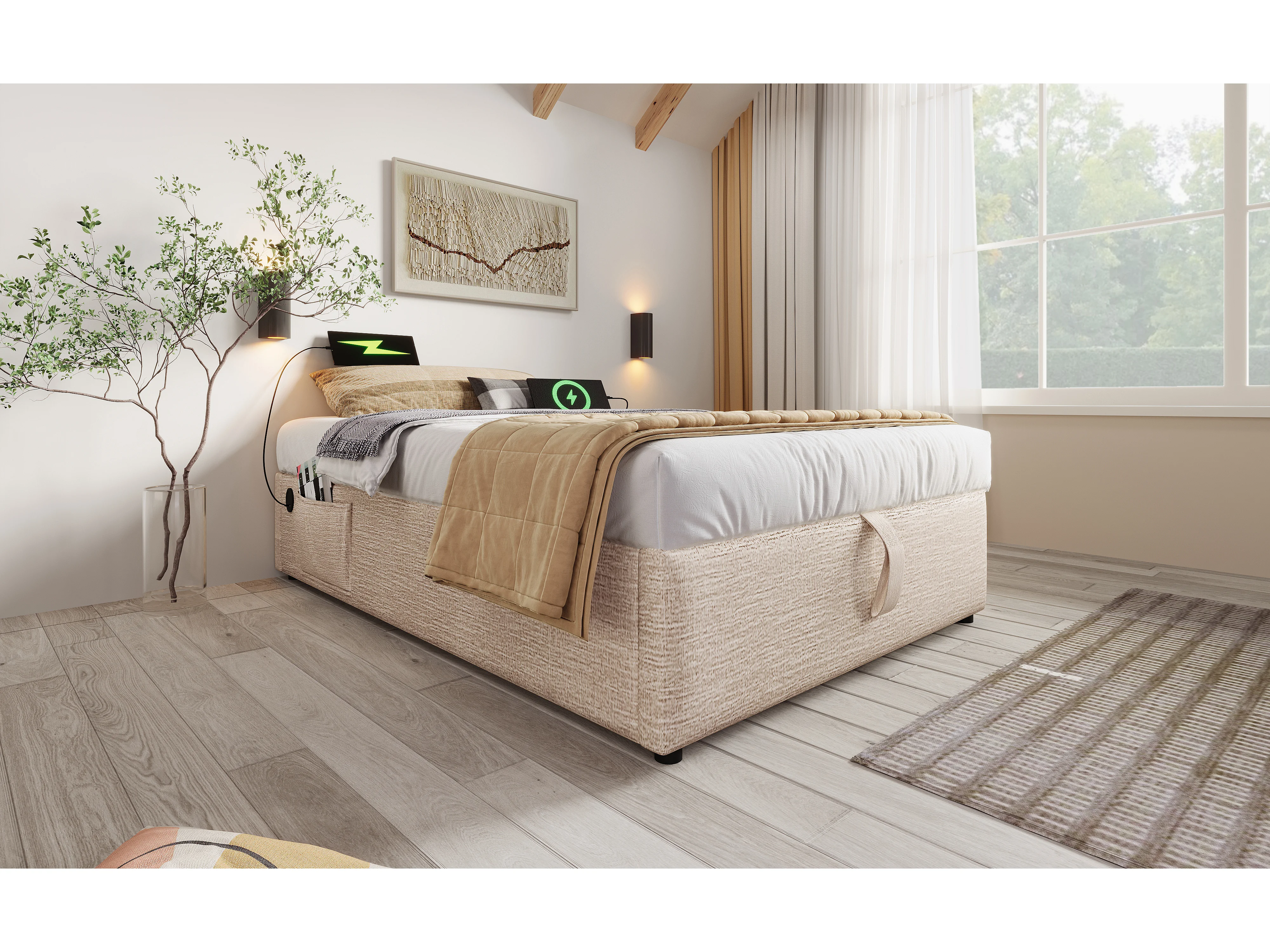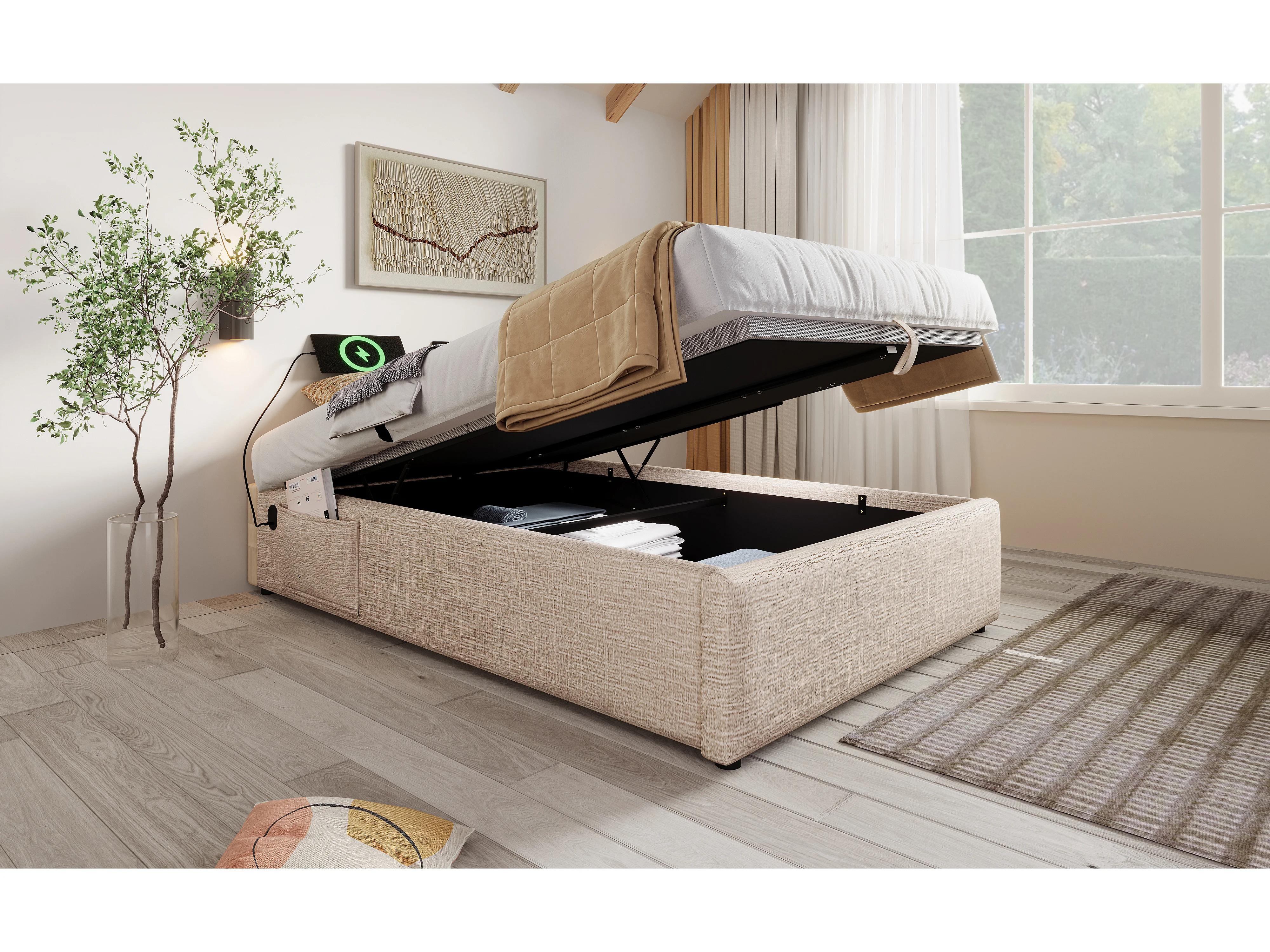 Lit simple 90×200 cm en lin naturel avec rangement hydraulique et ports USB intégrés