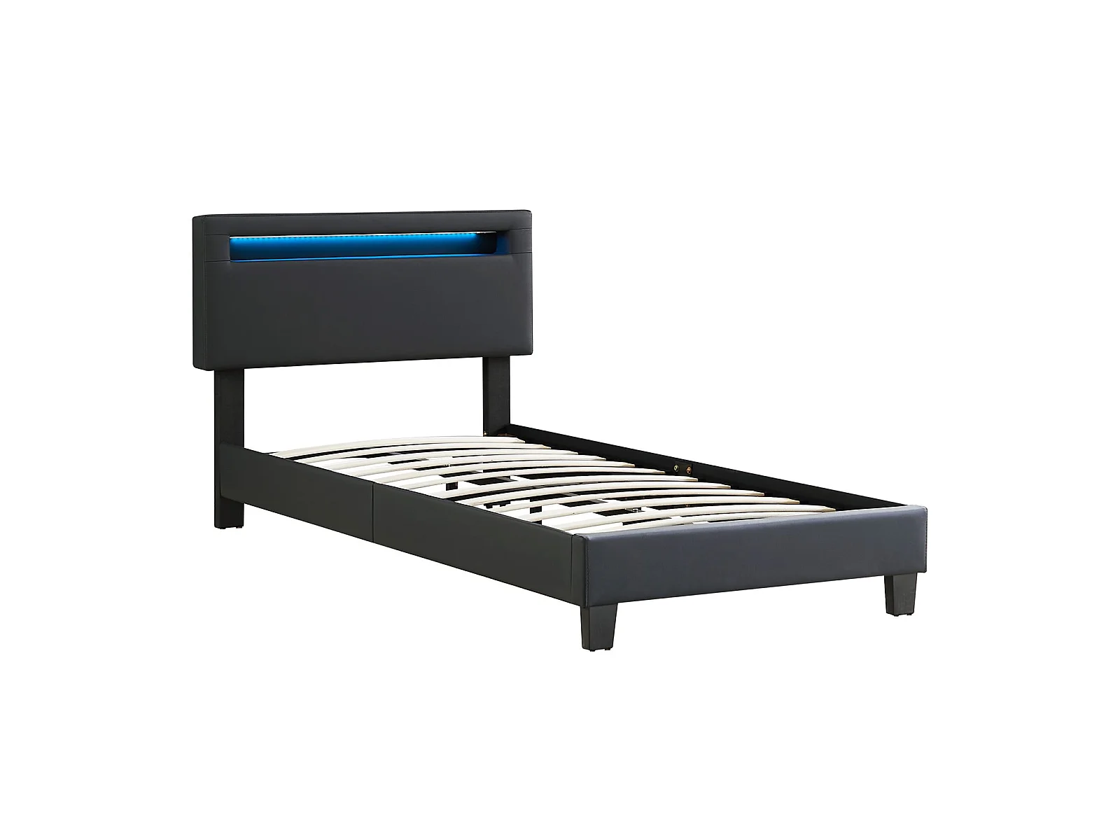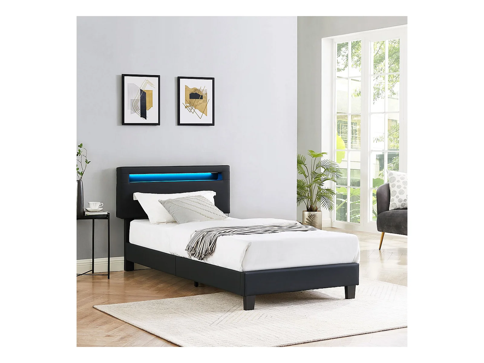 Lit LED simple 90x190 cm avec sommier, tête de lit réglable en hauteur, en synthétique noir, EVAN