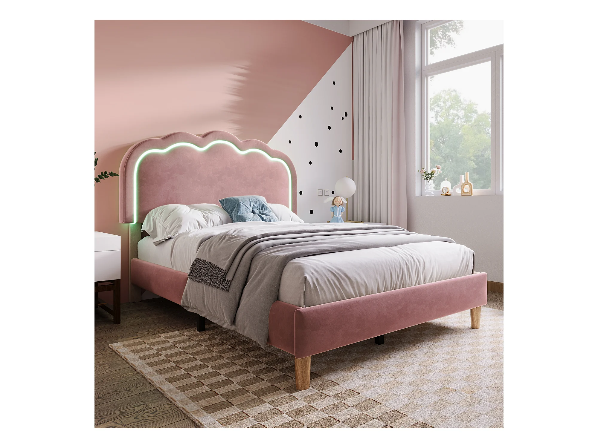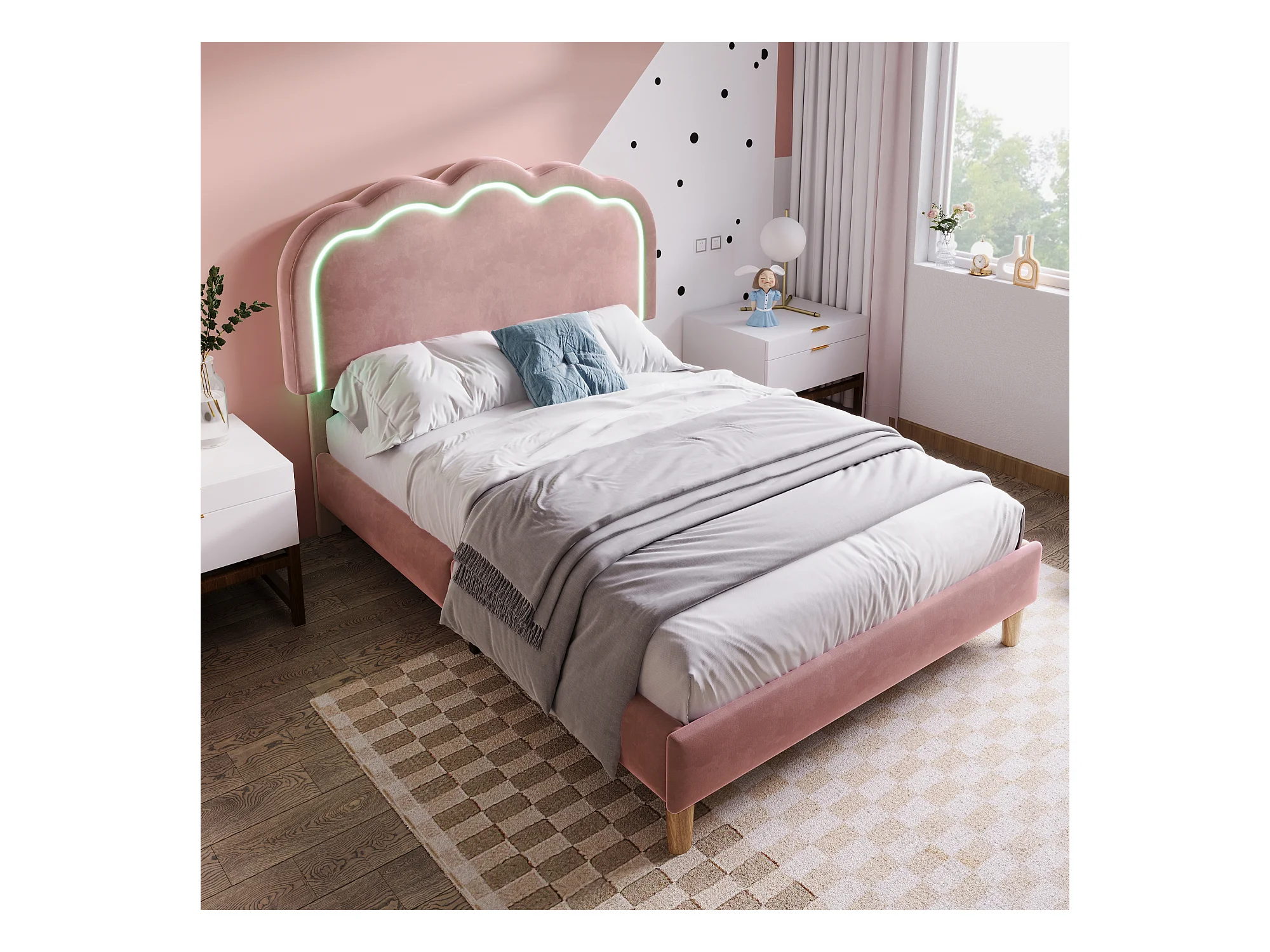 Lit simple 90x200 cm - Lit enfant avec tête de lit réglable - éclairage LED - velours rose