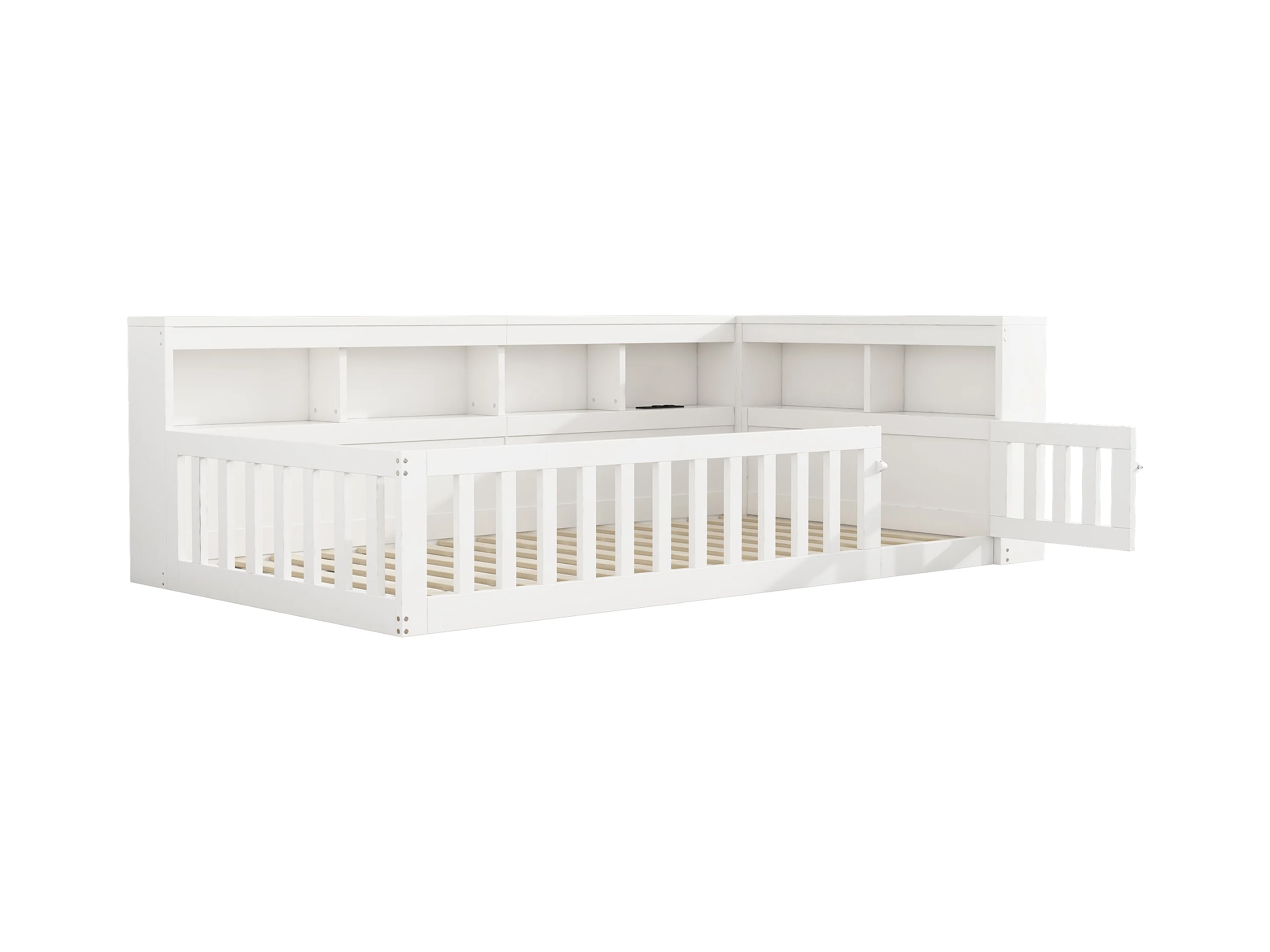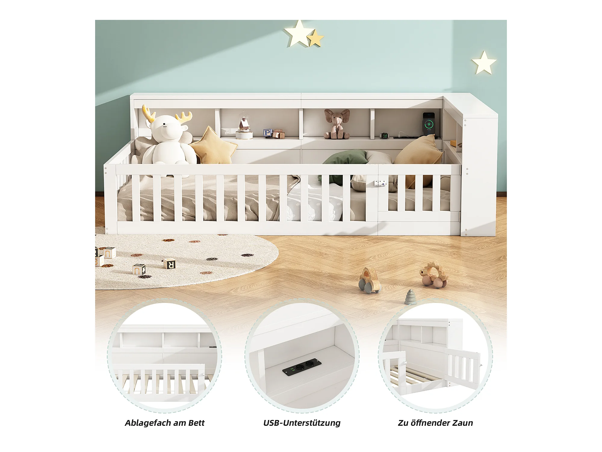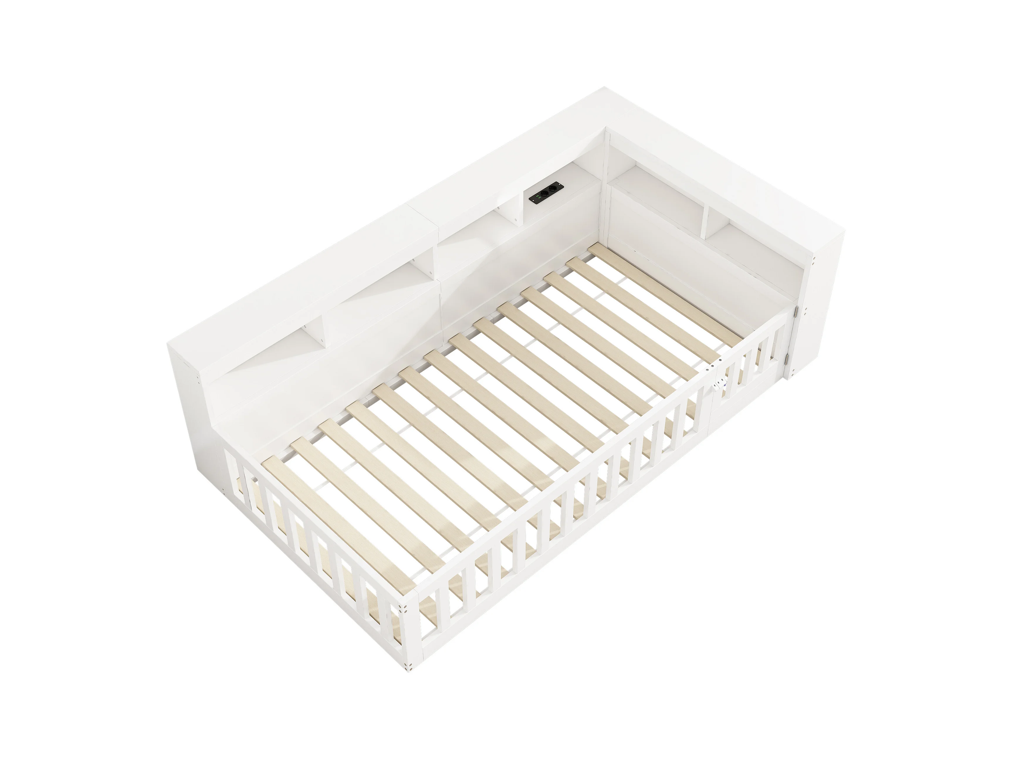 Lit simple pour enfant - 90 x 200 cm - chevet avec rangements + prise + USB - avec sommier à lattes - aggloméré - blanc