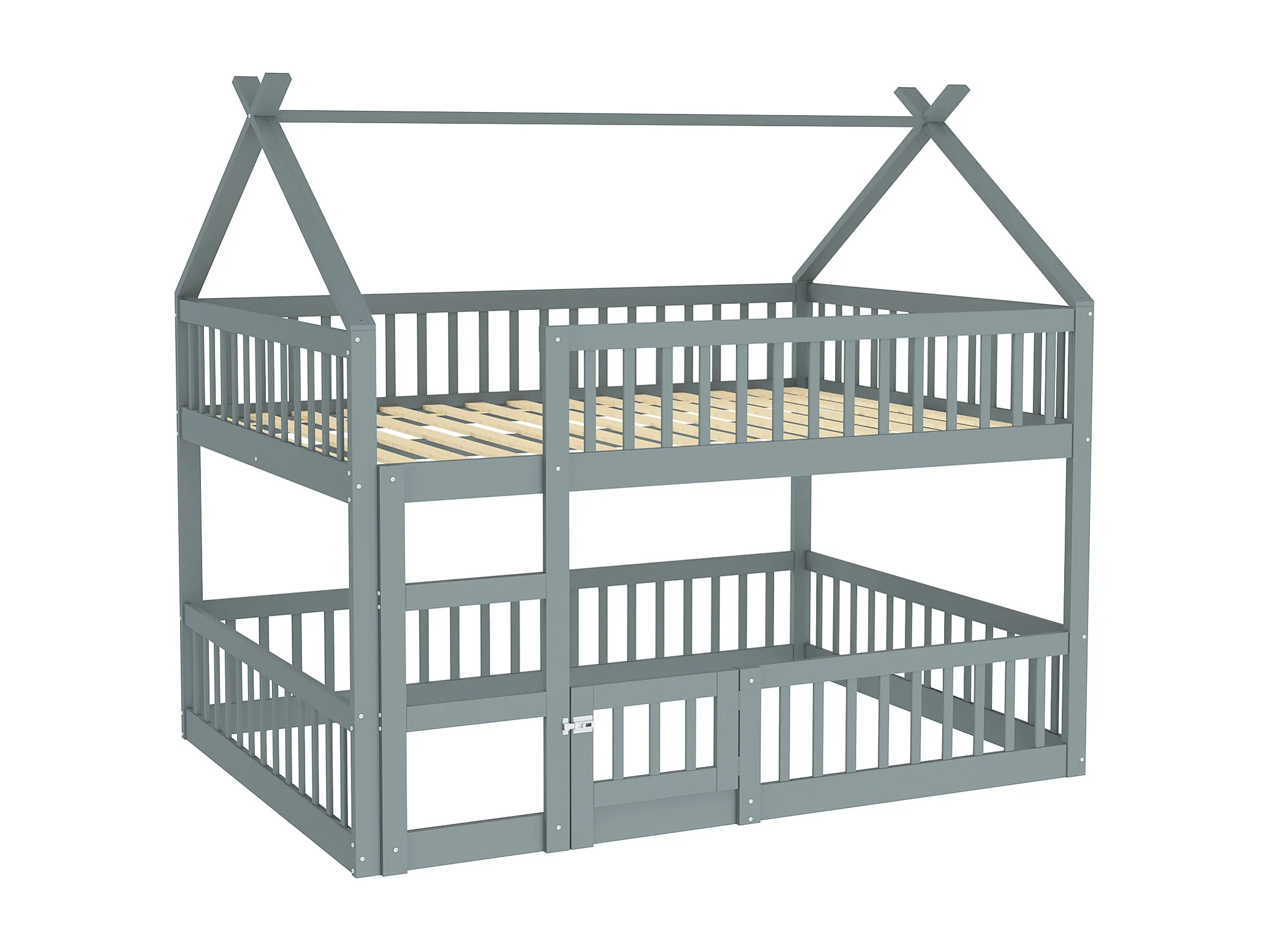 Lit superposé 140x200 cm, design loft avec échelle, cadre en bois massif, idéal pour enfants et familles, couleur grise, robuste et spacieux.