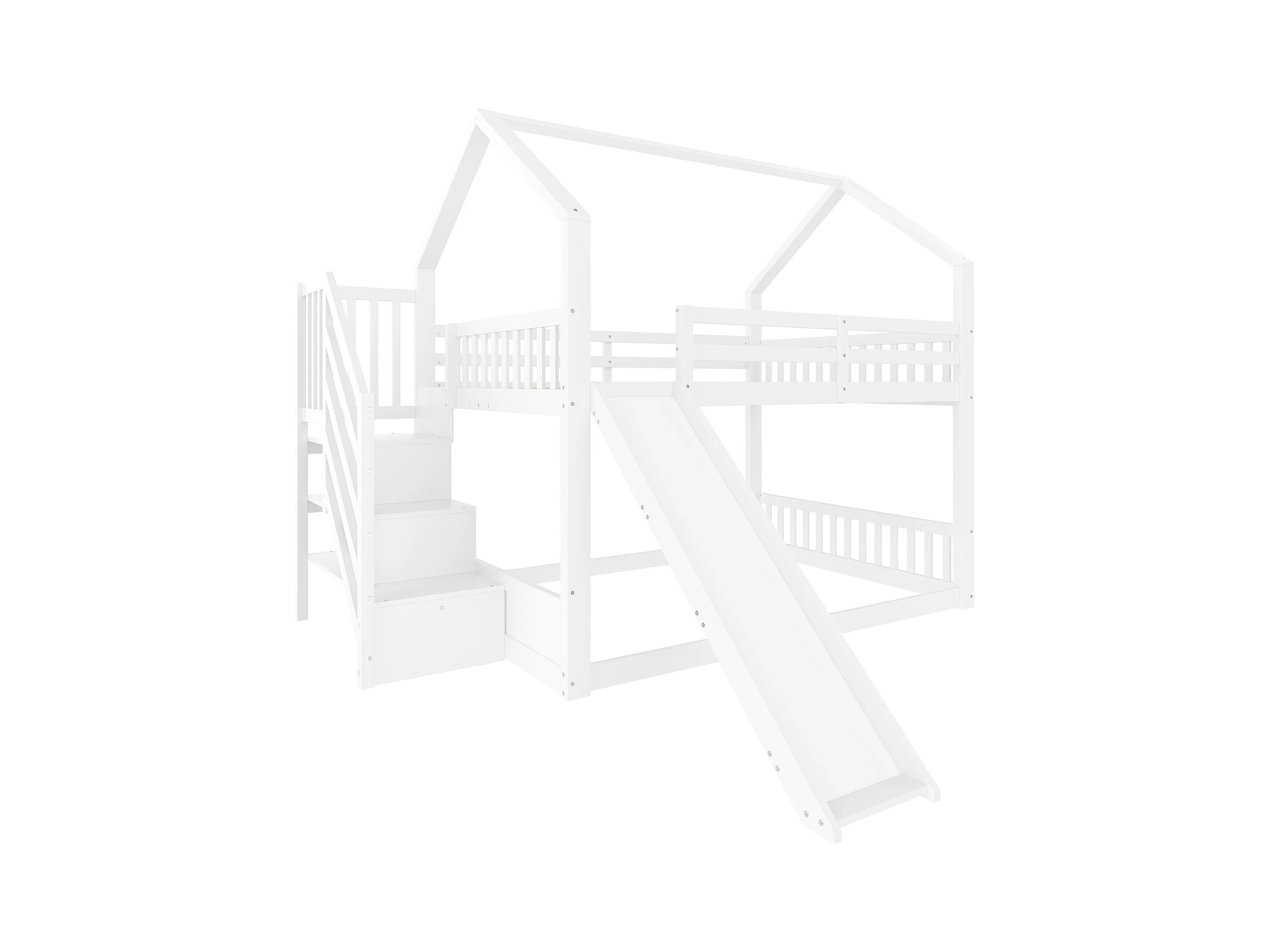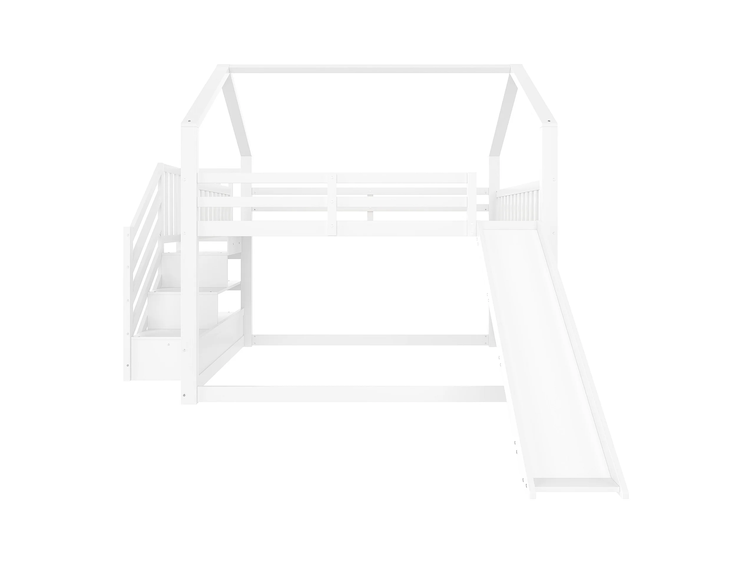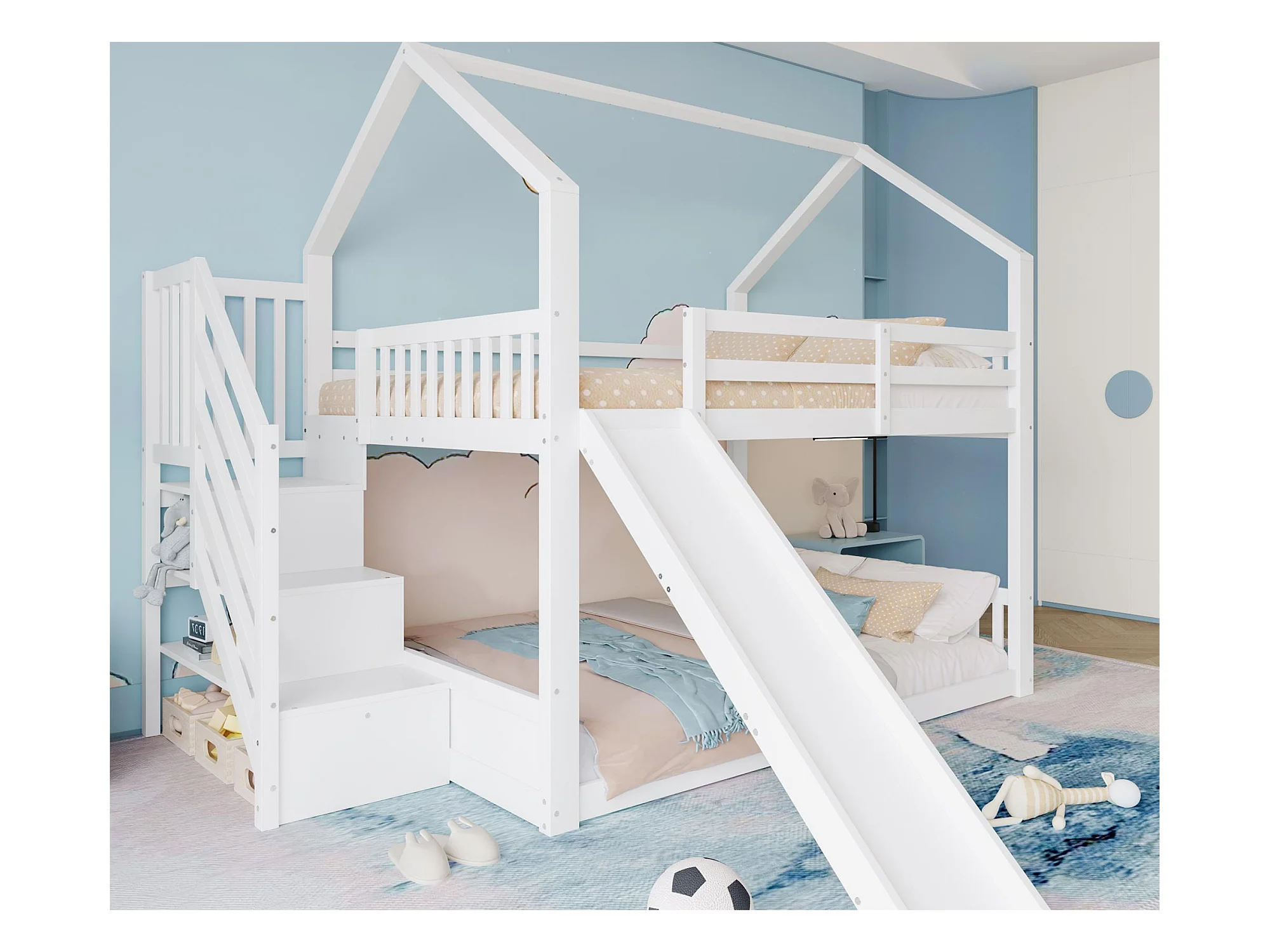 Lit superposé 140x200cm en bois - avec barrières + escalier de rangement + toboggan - Blanc