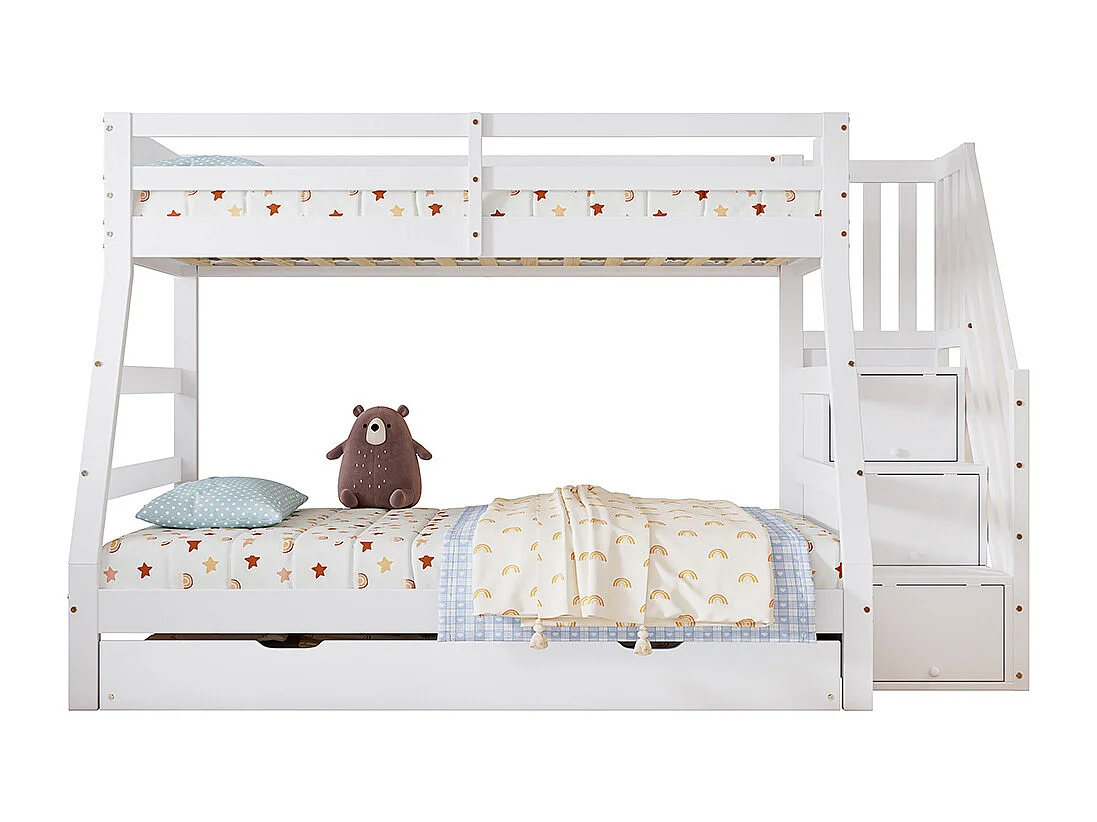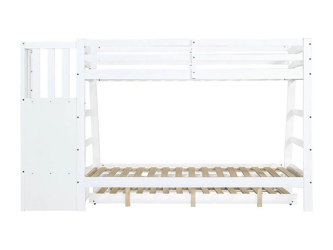 Lit superposé 90/120x200CM avec lit gigogne, lit enfant avec armoire échelle et main courante, blanc