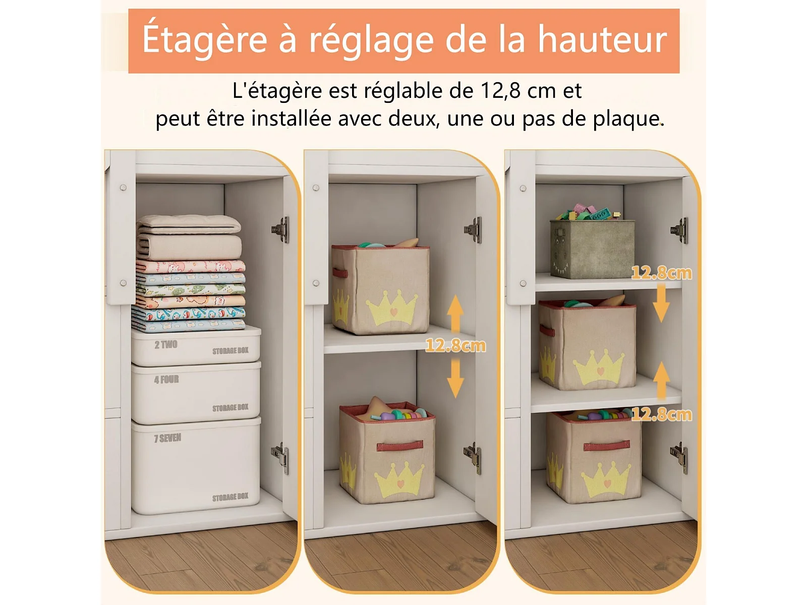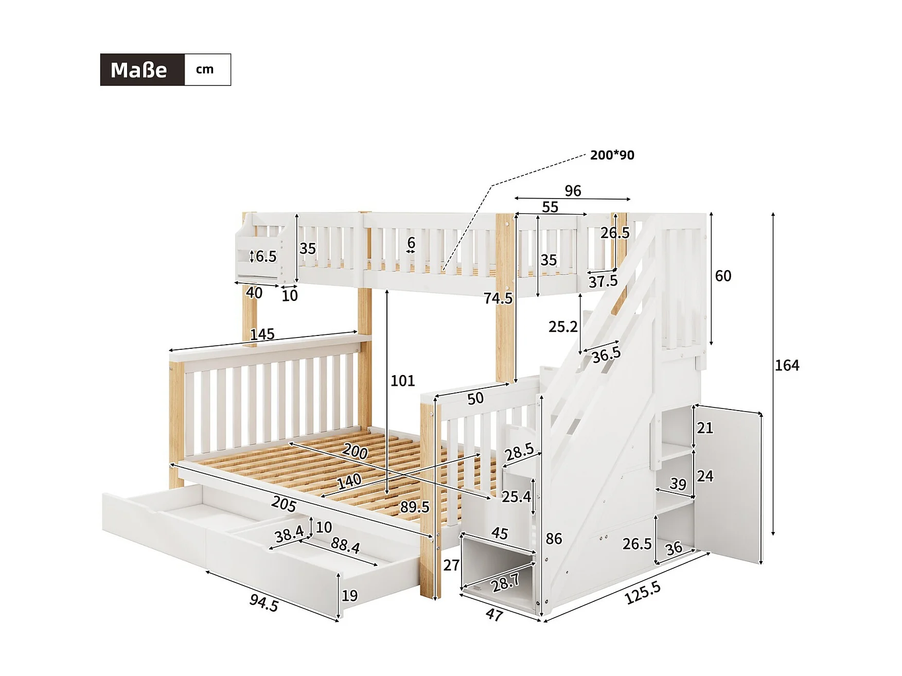 Lit superposé 90 x 200 cm + 140 x 200 cm - cadre en bois - Avec rangements et escalier - Blanc et naturel