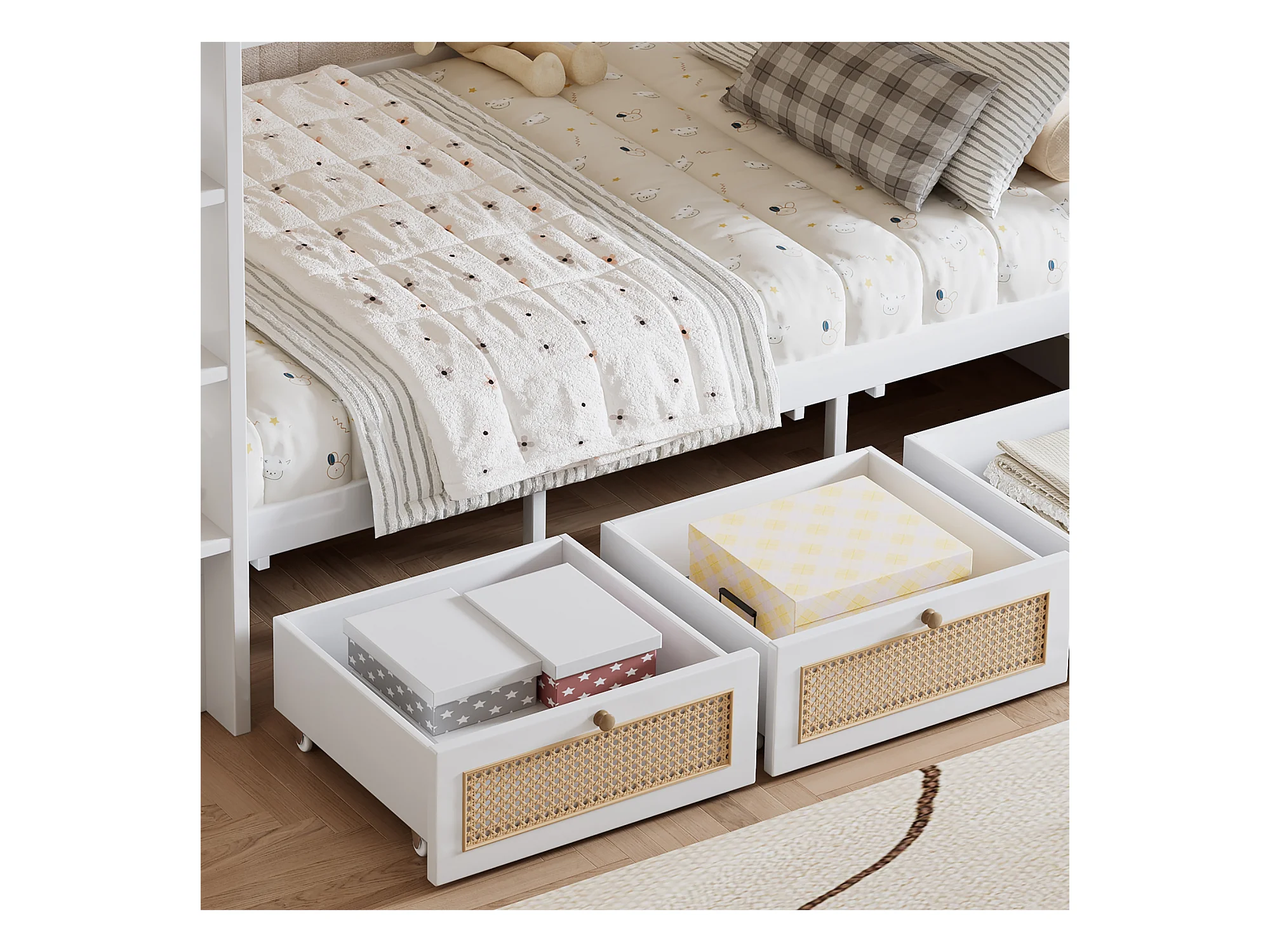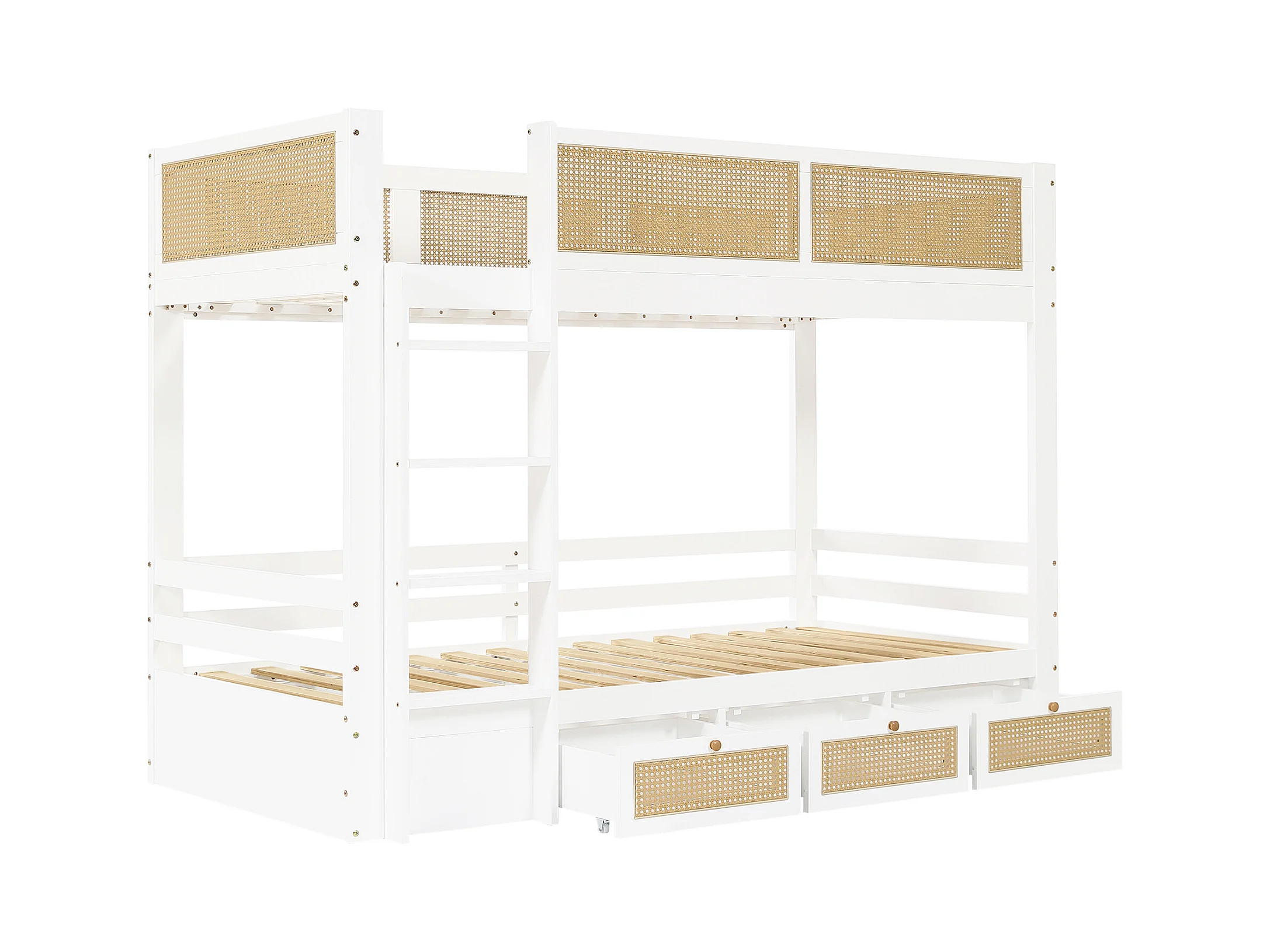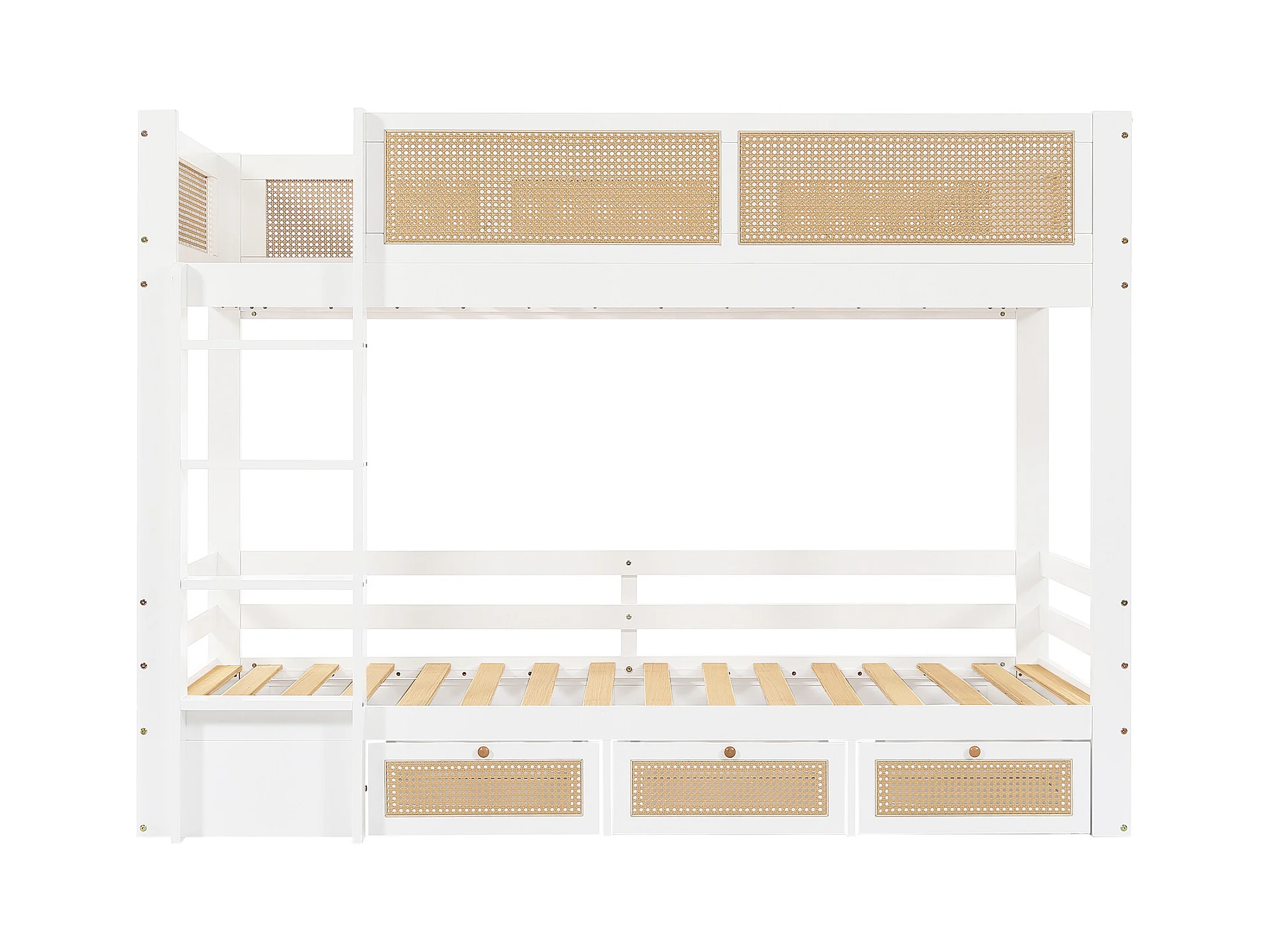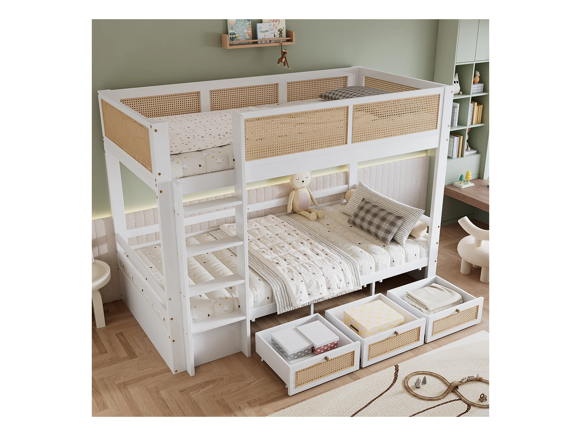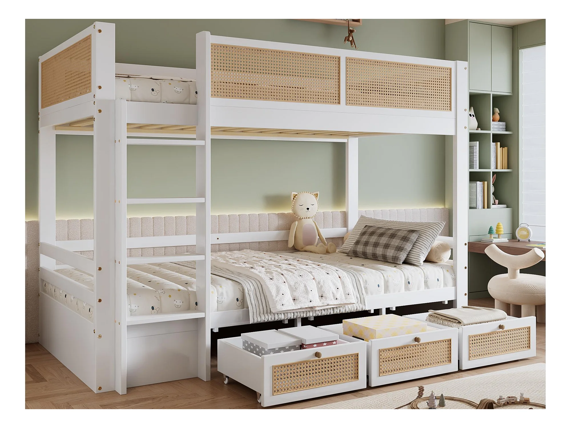 Lit superposé 90x200 cm - avec 3 tiroirs - avec échelle de sécurité - avec clôture en rotin - Bois massif + MDF - Blanc + Naturel