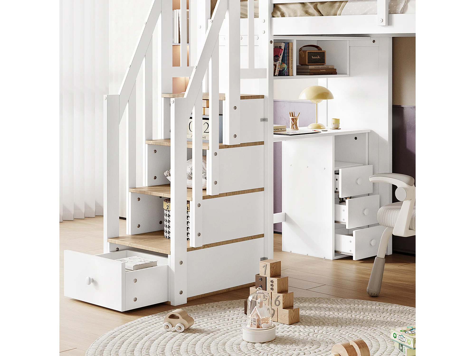 Lit superposé 90x200 cm, Bureau avec 3 tiroirs, armoires à 4 marches, étagères Ouvertes, Blanc