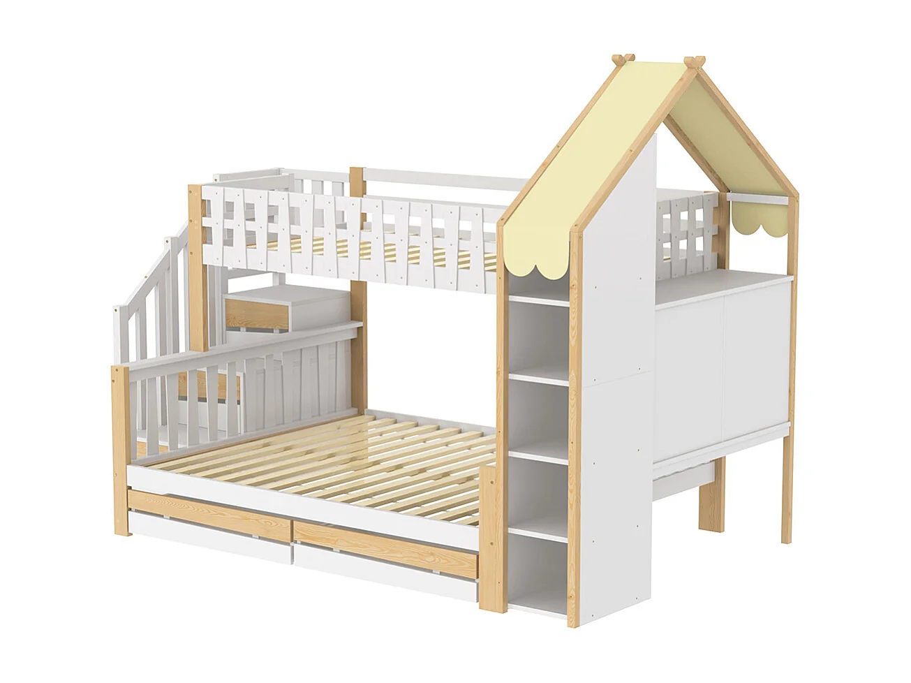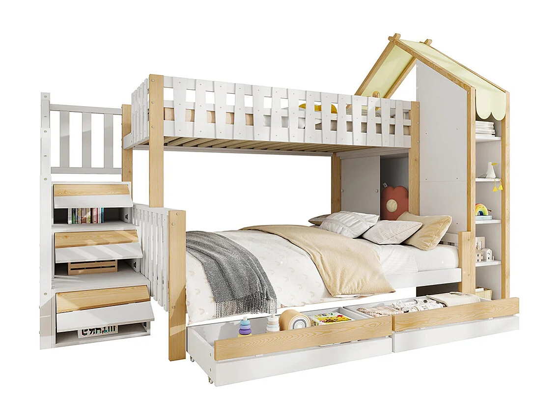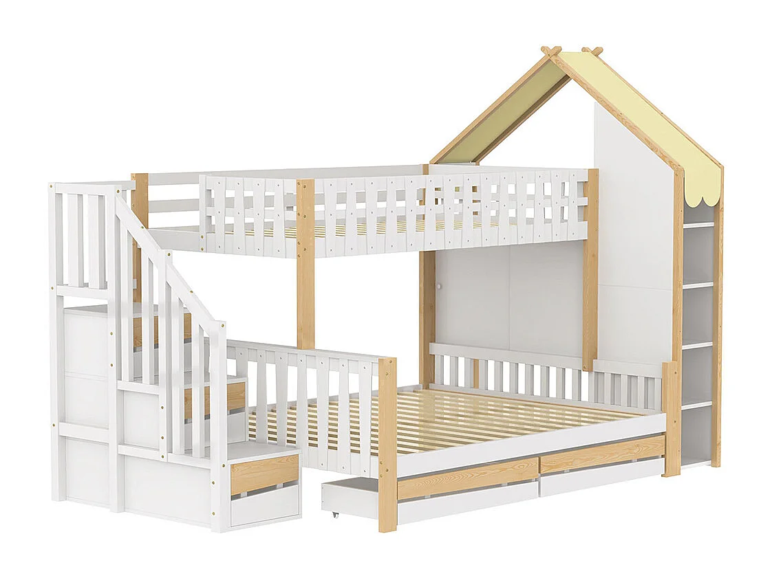 Lit superposé 90x200 cm et 140x200 cm barrières échelle rampe 2 tiroirs sans matelas blanc naturel