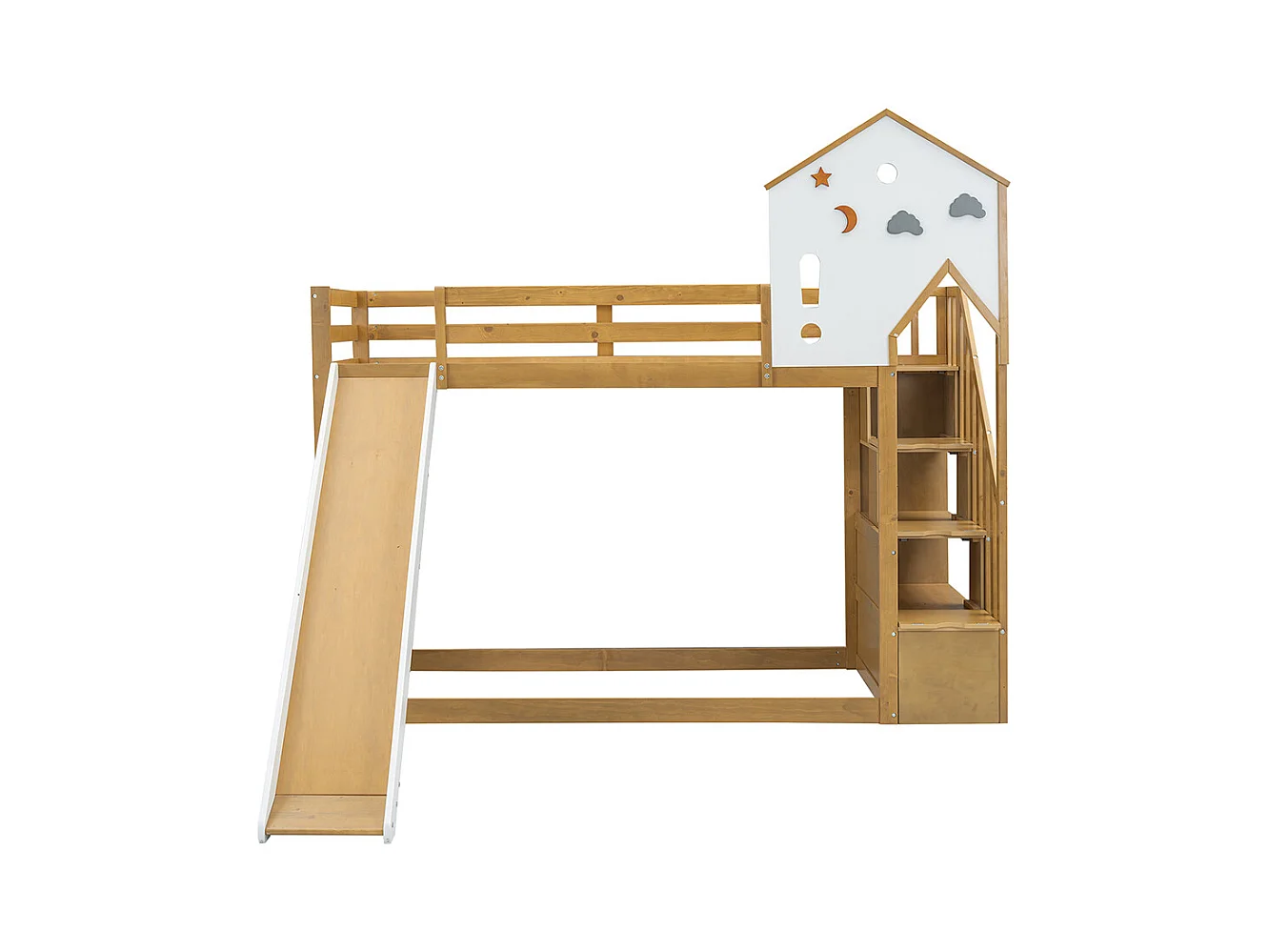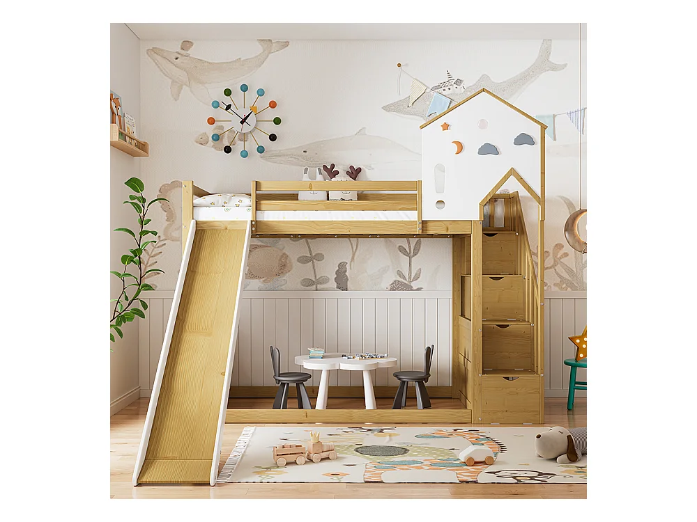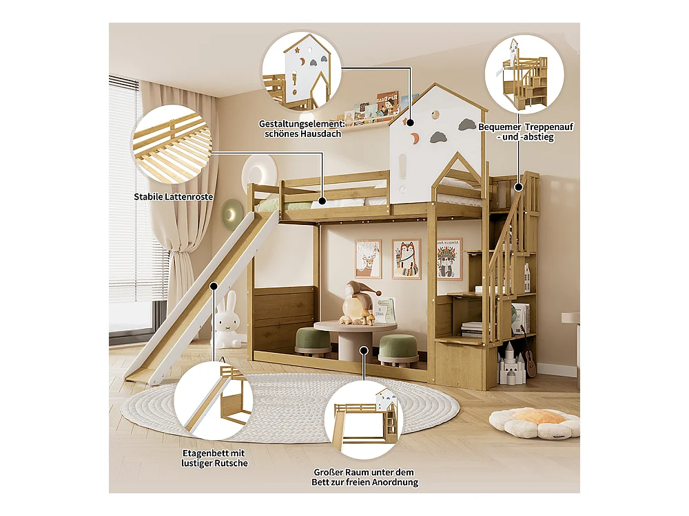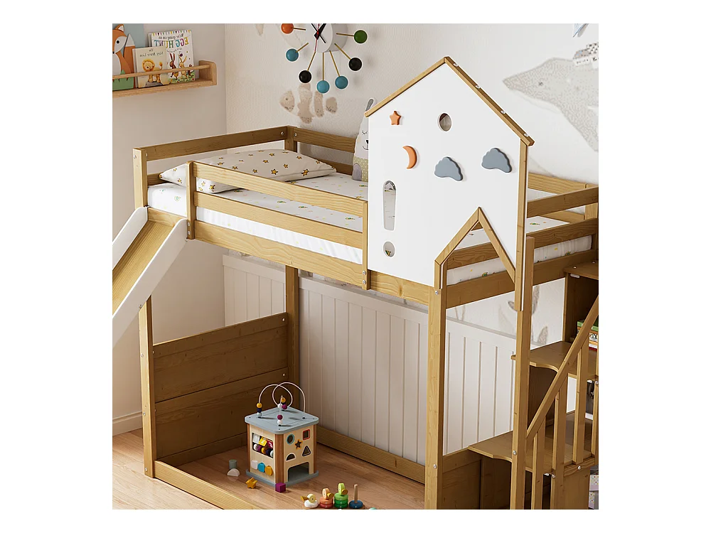 Lit superposé 90x200 cm Lit d'enfant Lit avec escalier d'angle avec toit et fenêtre avec 3 casiers dans l'escalier Blanc+Naturel