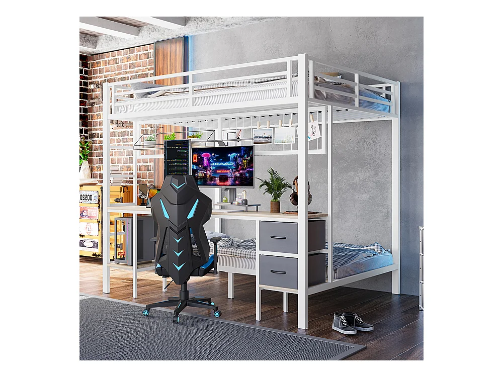 Lit superposé 90x200 et 140x200 blanc avec tiroirs étagères bureau port USB LED 7 couleurs et grille suspendue