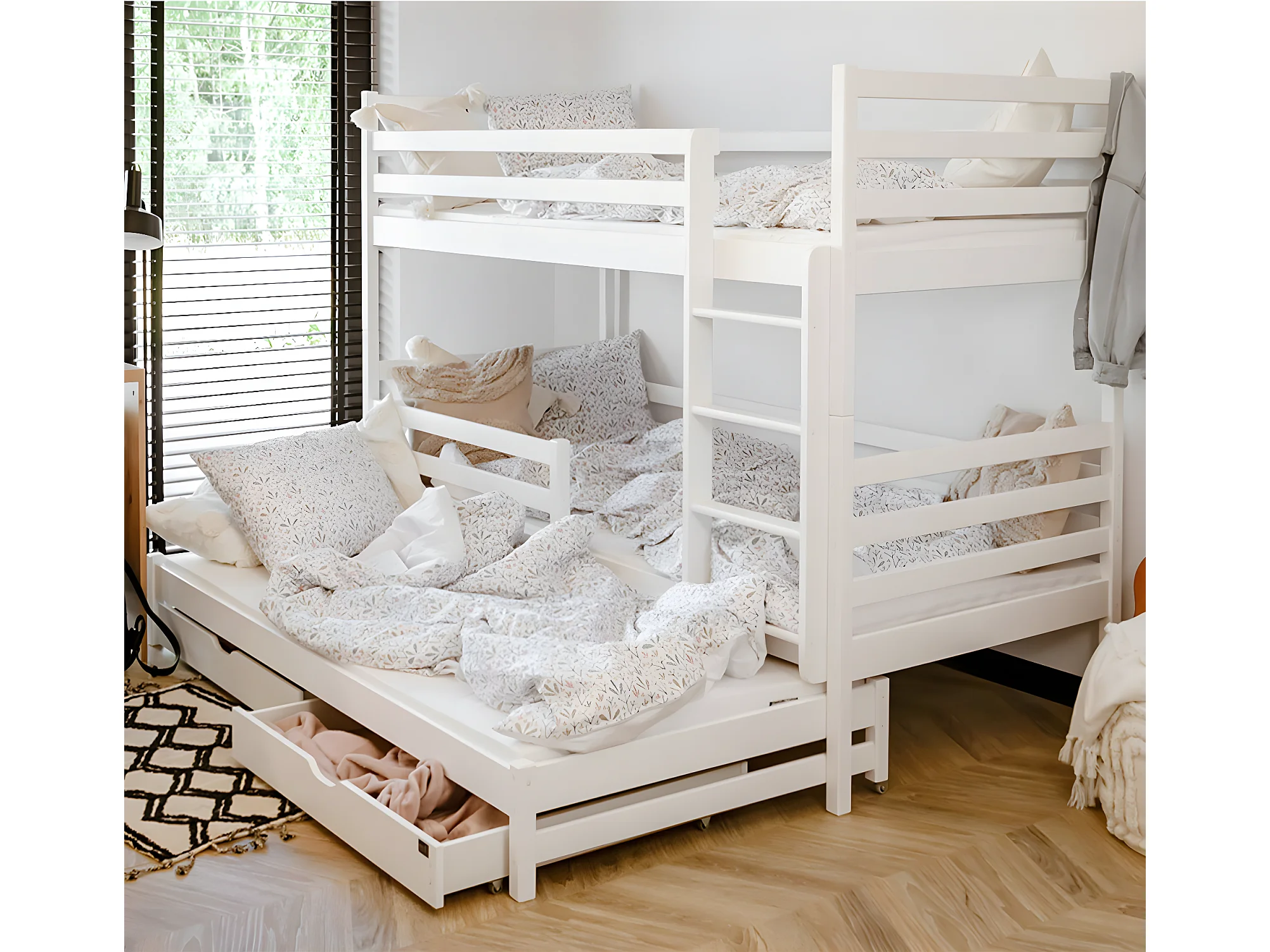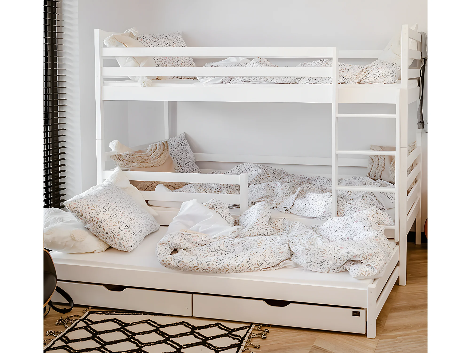 Lit superposé 90x200 sommier lit gigogne et tiroirs inclus Léo Blanc