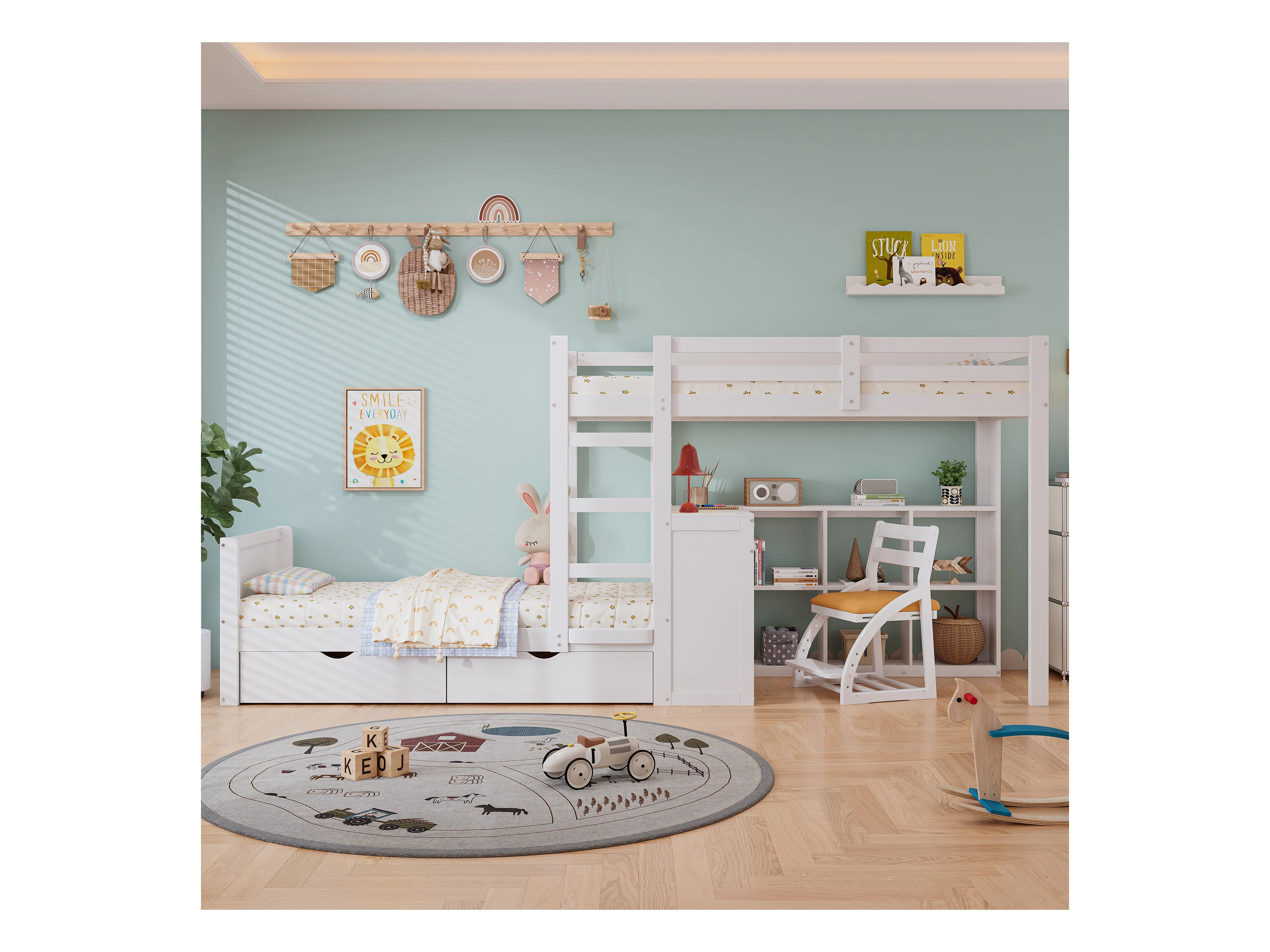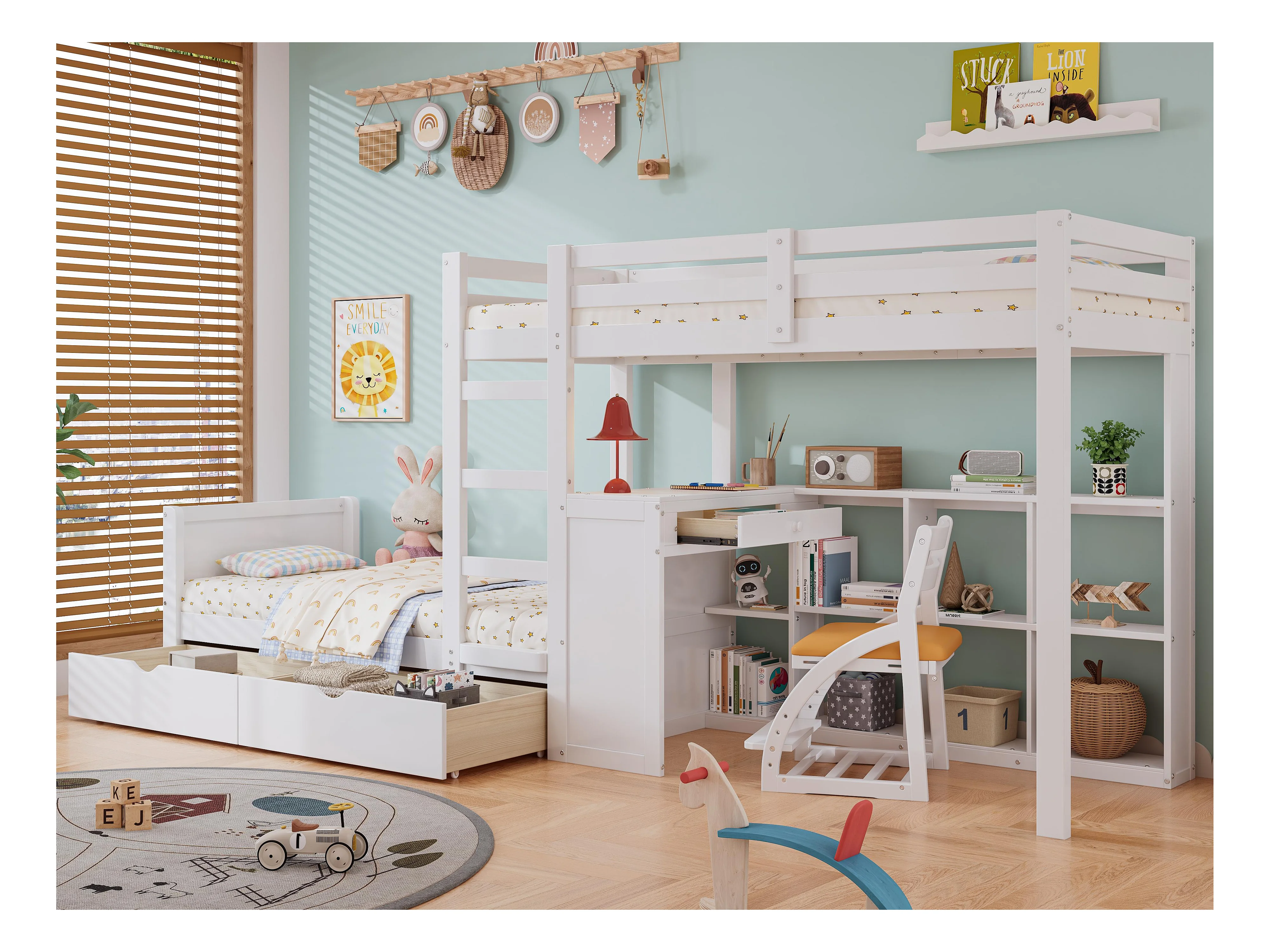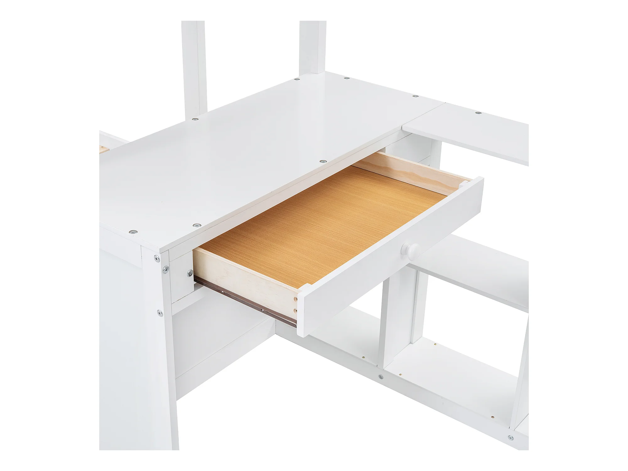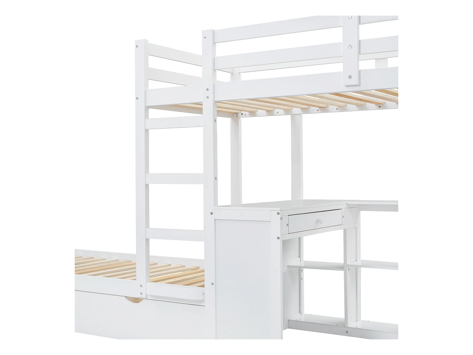 Lit superposé 90x200cm - avec bureau & étagères ouvertes & 2 tiroirs - en bois de pin et MDF - Blanc