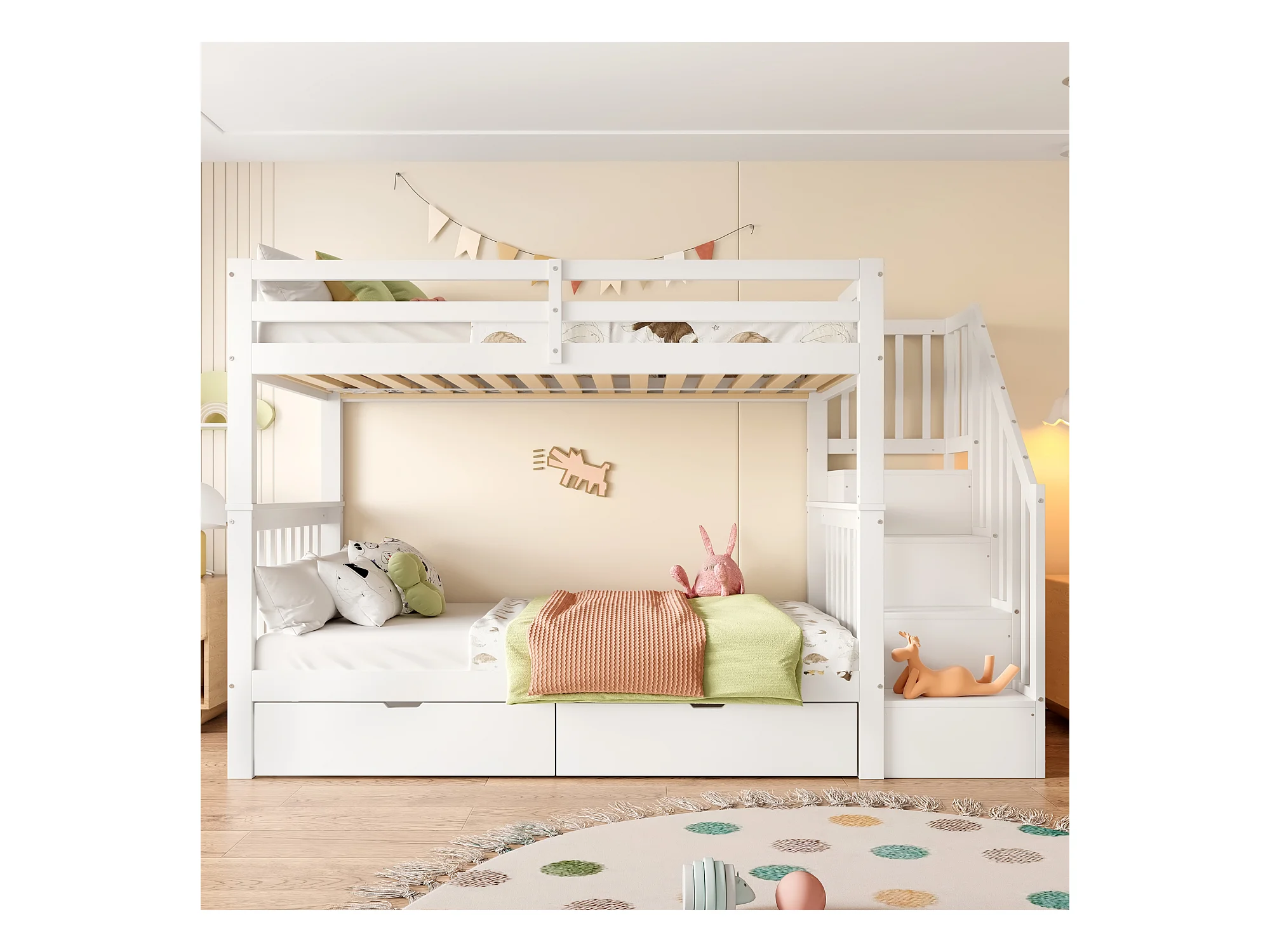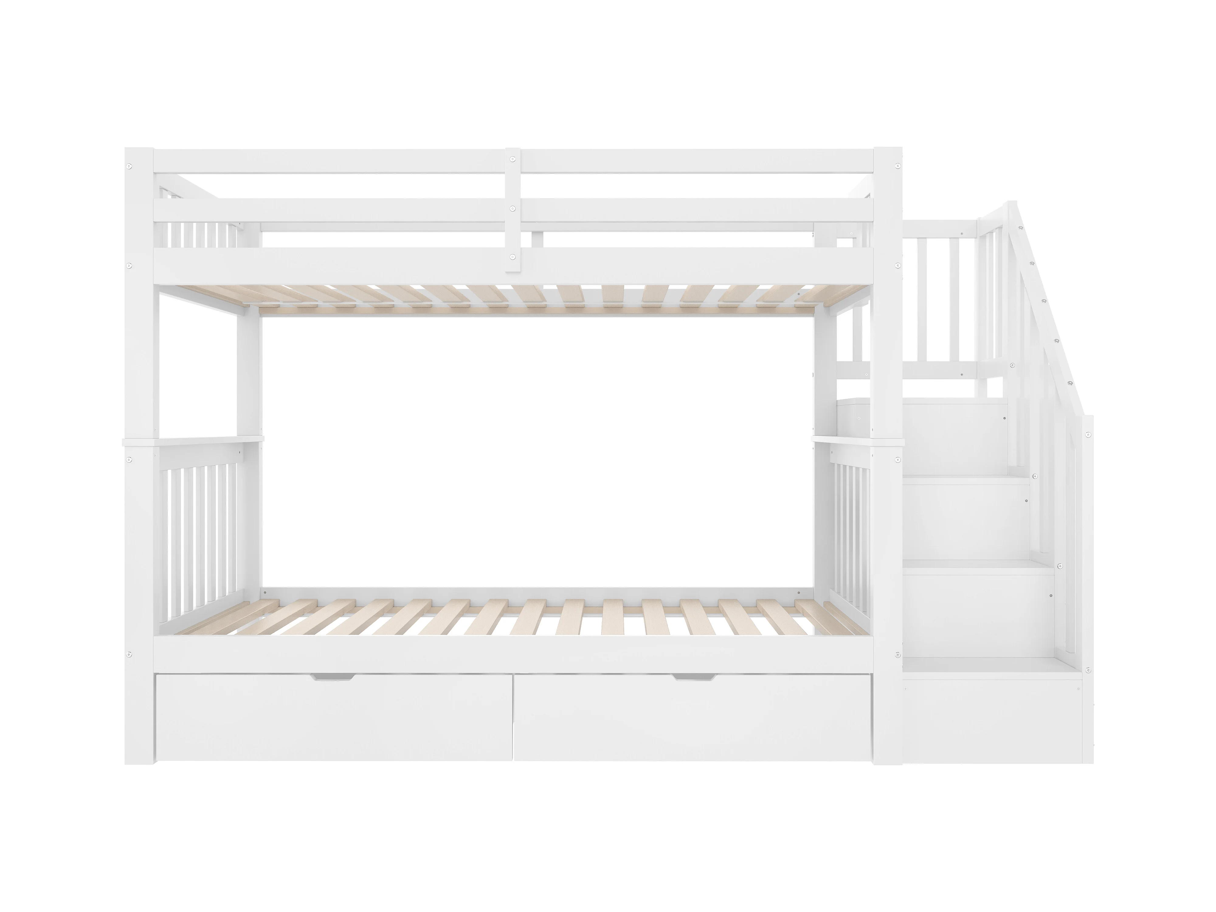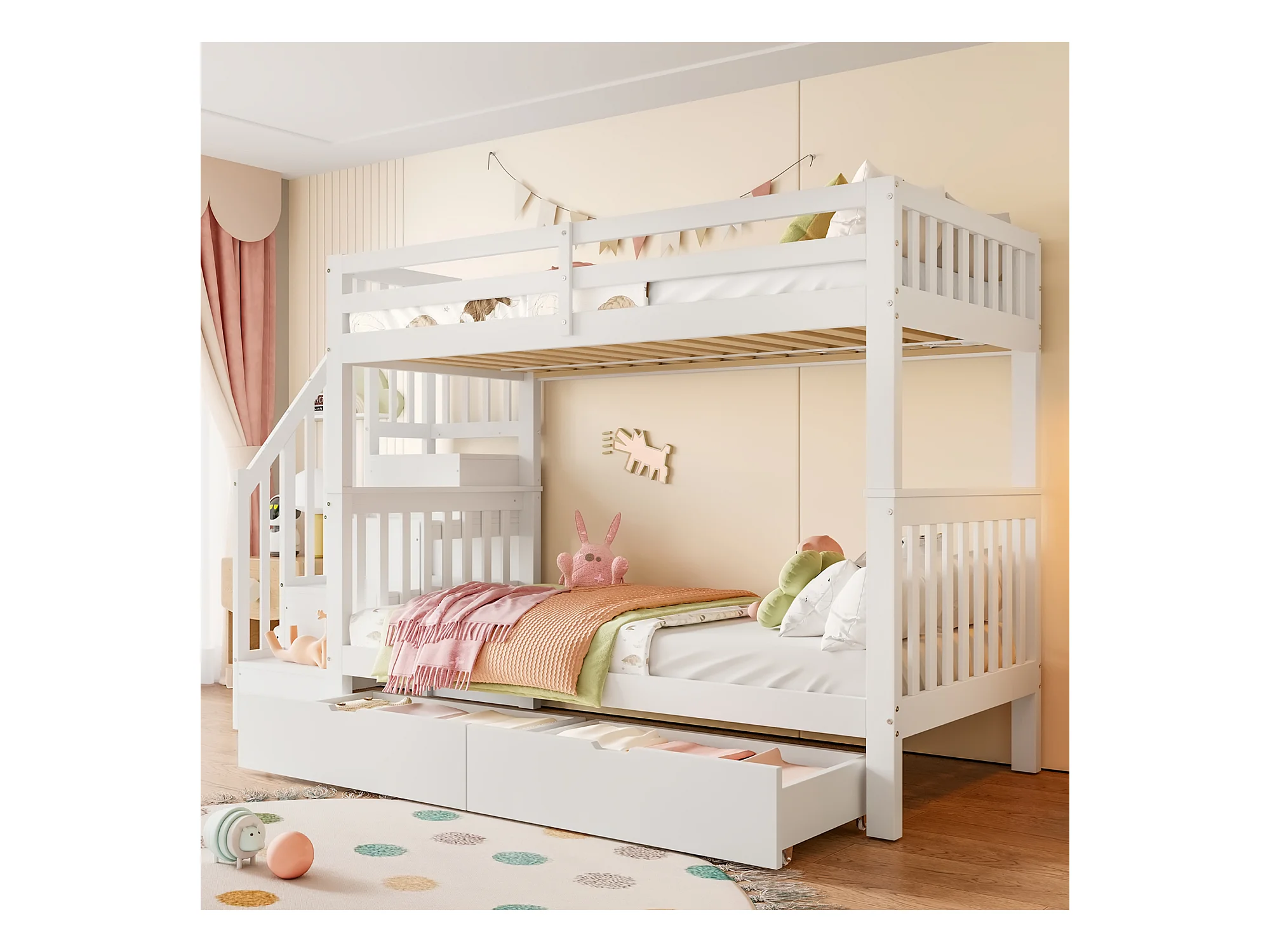 lit superposé 90X200cm, étagère d'escalier, équipé de deux tiroirs, garde-corps haut,blanc