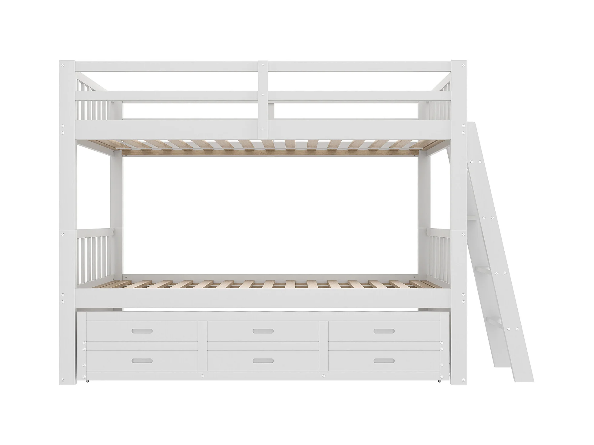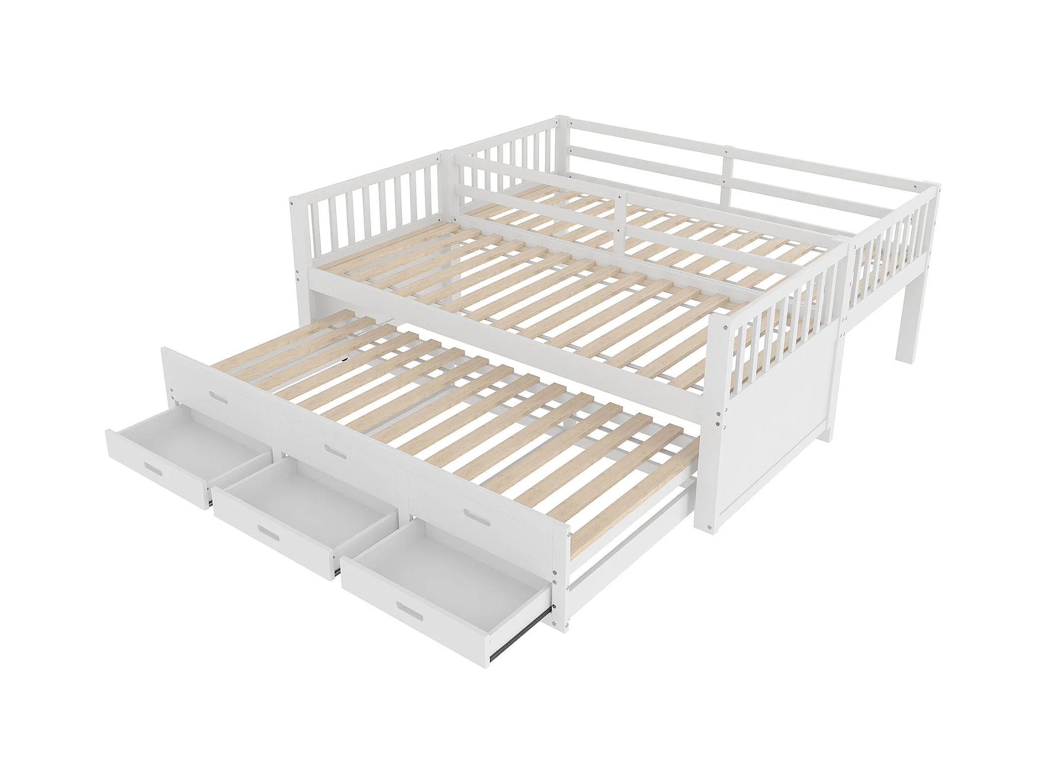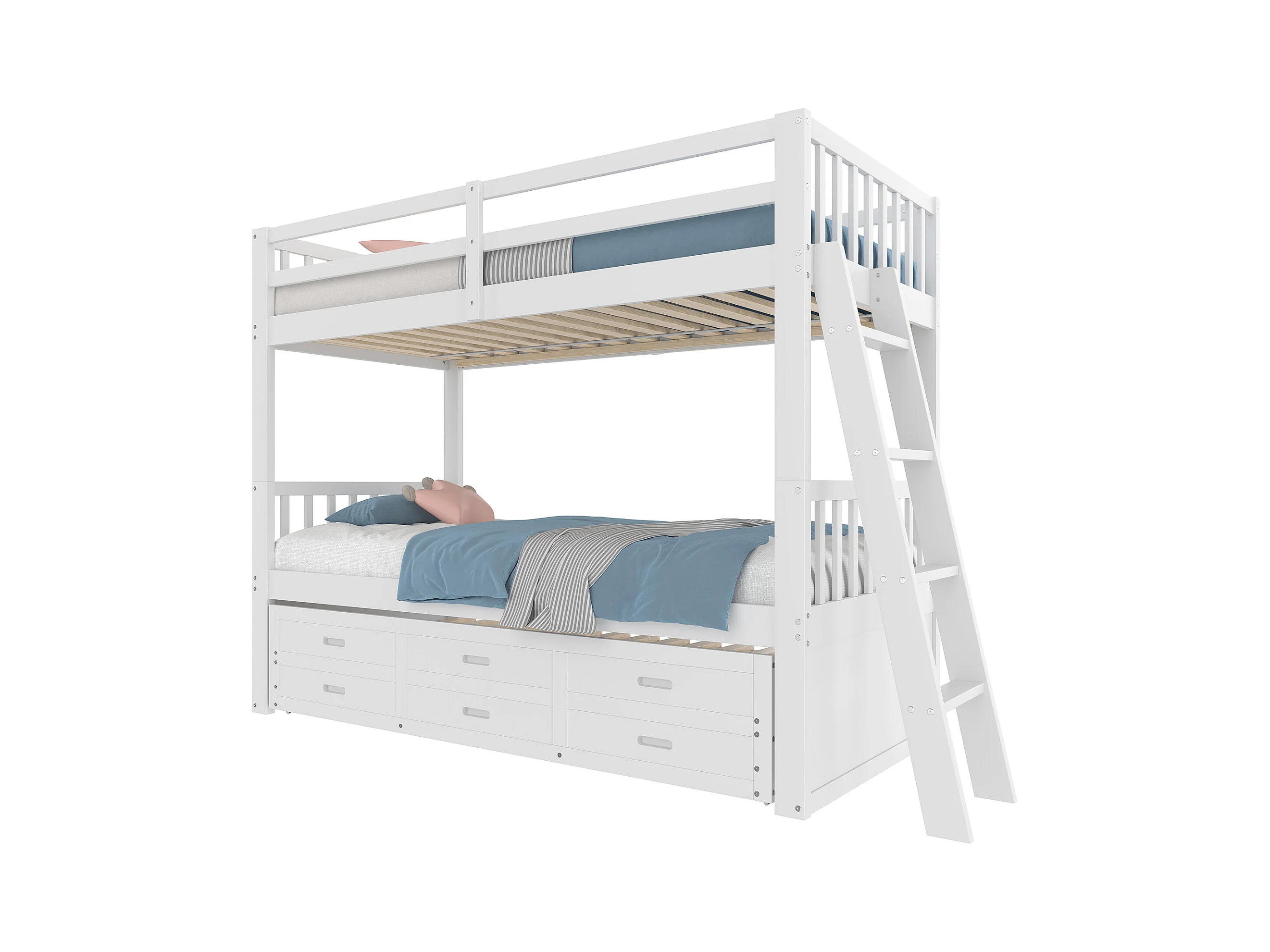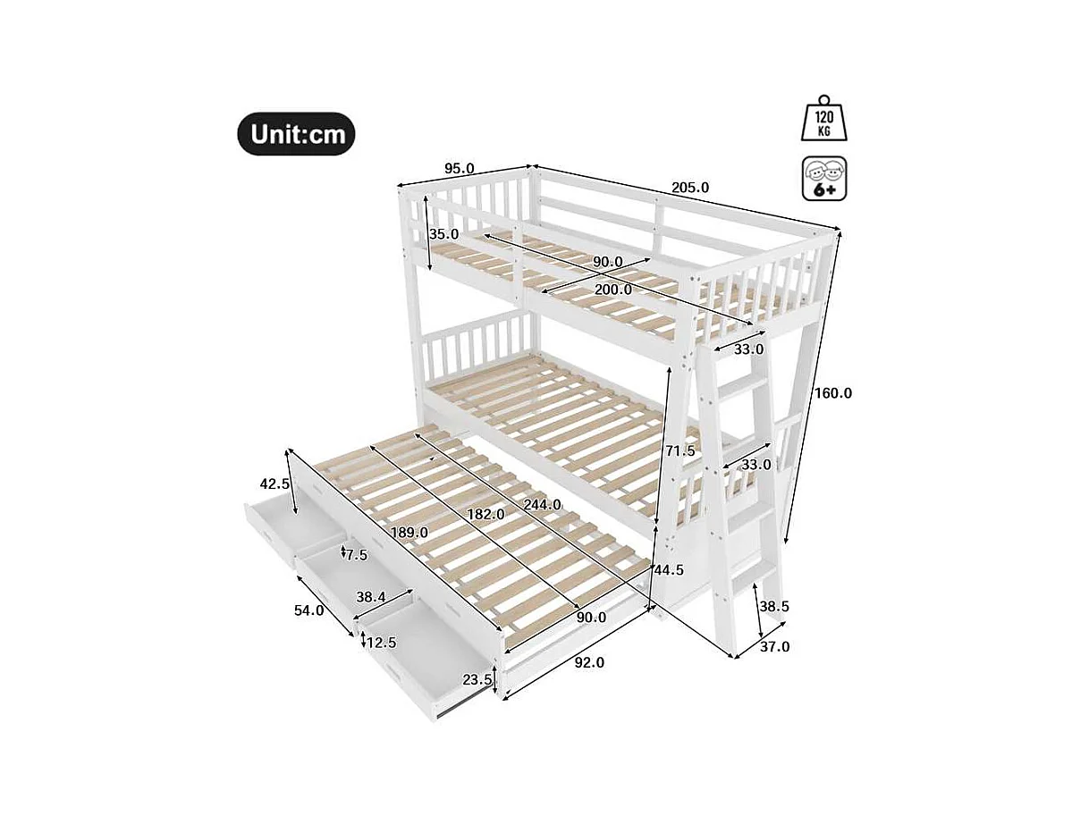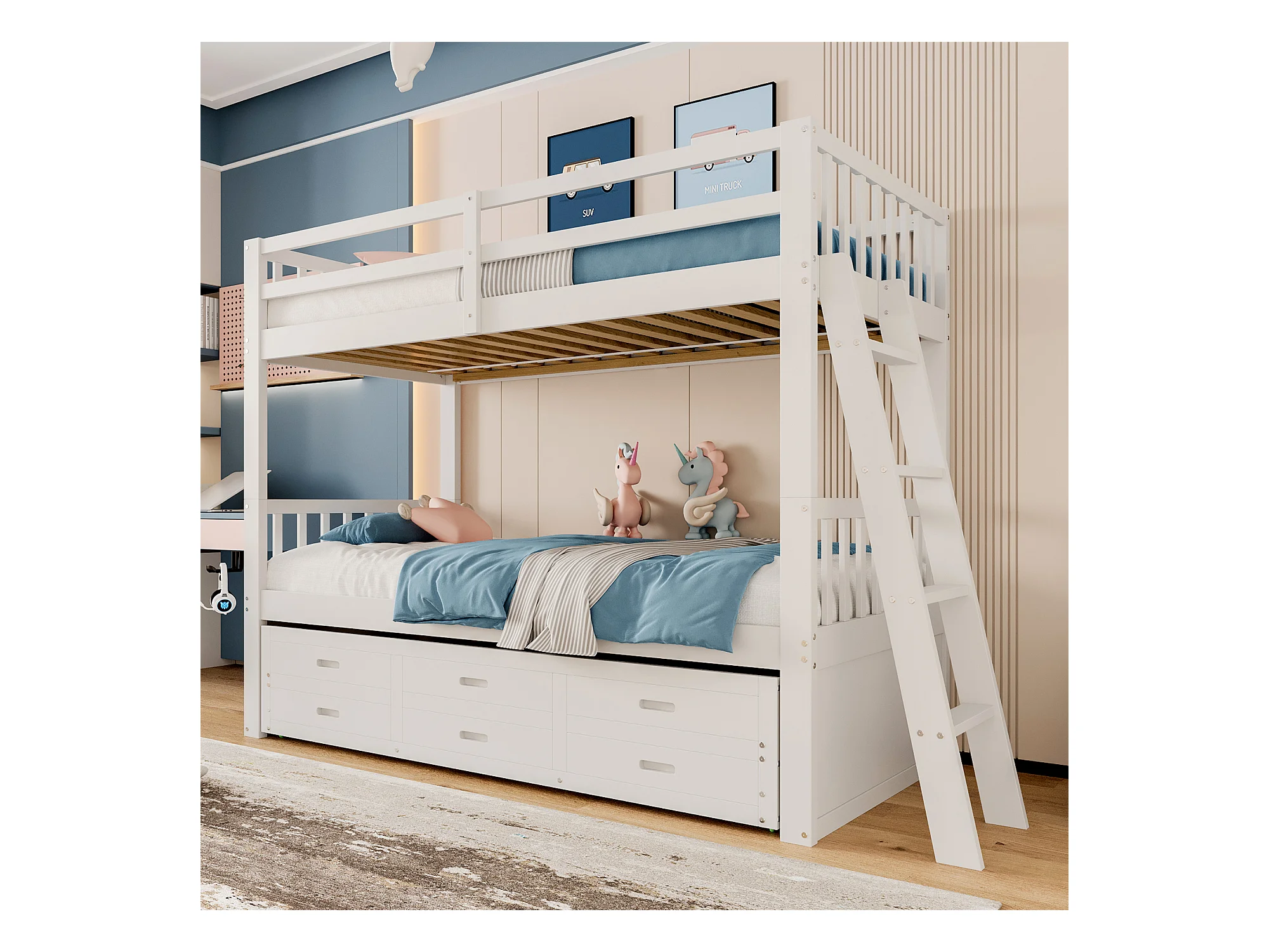 Lit Superposé 90x200cm, Maison pour Enfants avec Échelle, Lit Extensible, 3 Tiroirs, Pin, Blanc (244x95x160 cm)