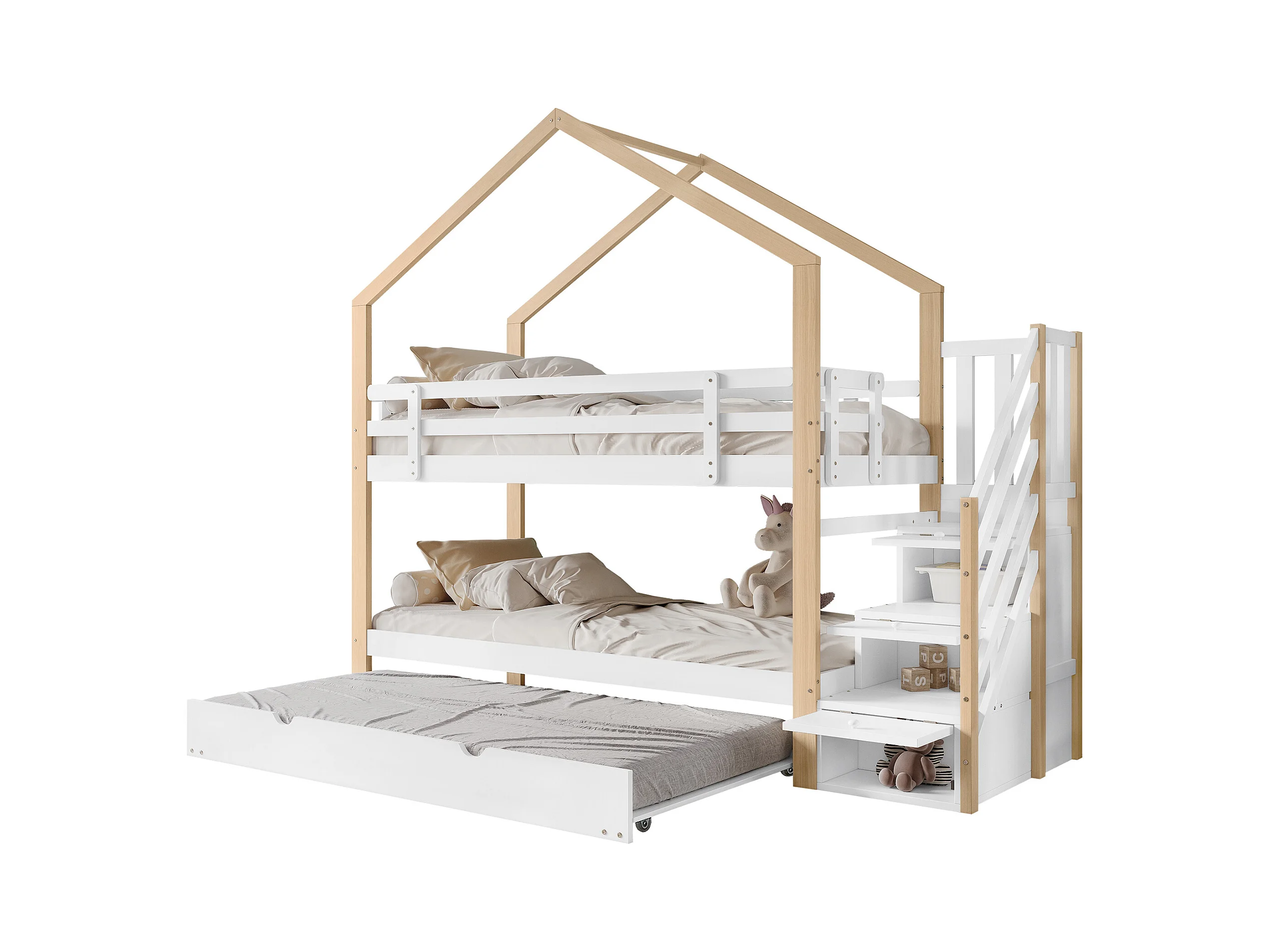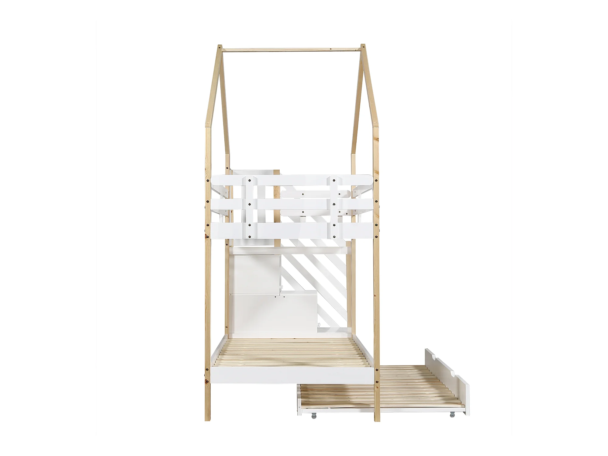 Lit superposé avec cabane dans les arbres, lit coulissant, échelle, 3 tiroirs, garde-corps, sommier à lattes, naturel + blanc, 90x200/190cm