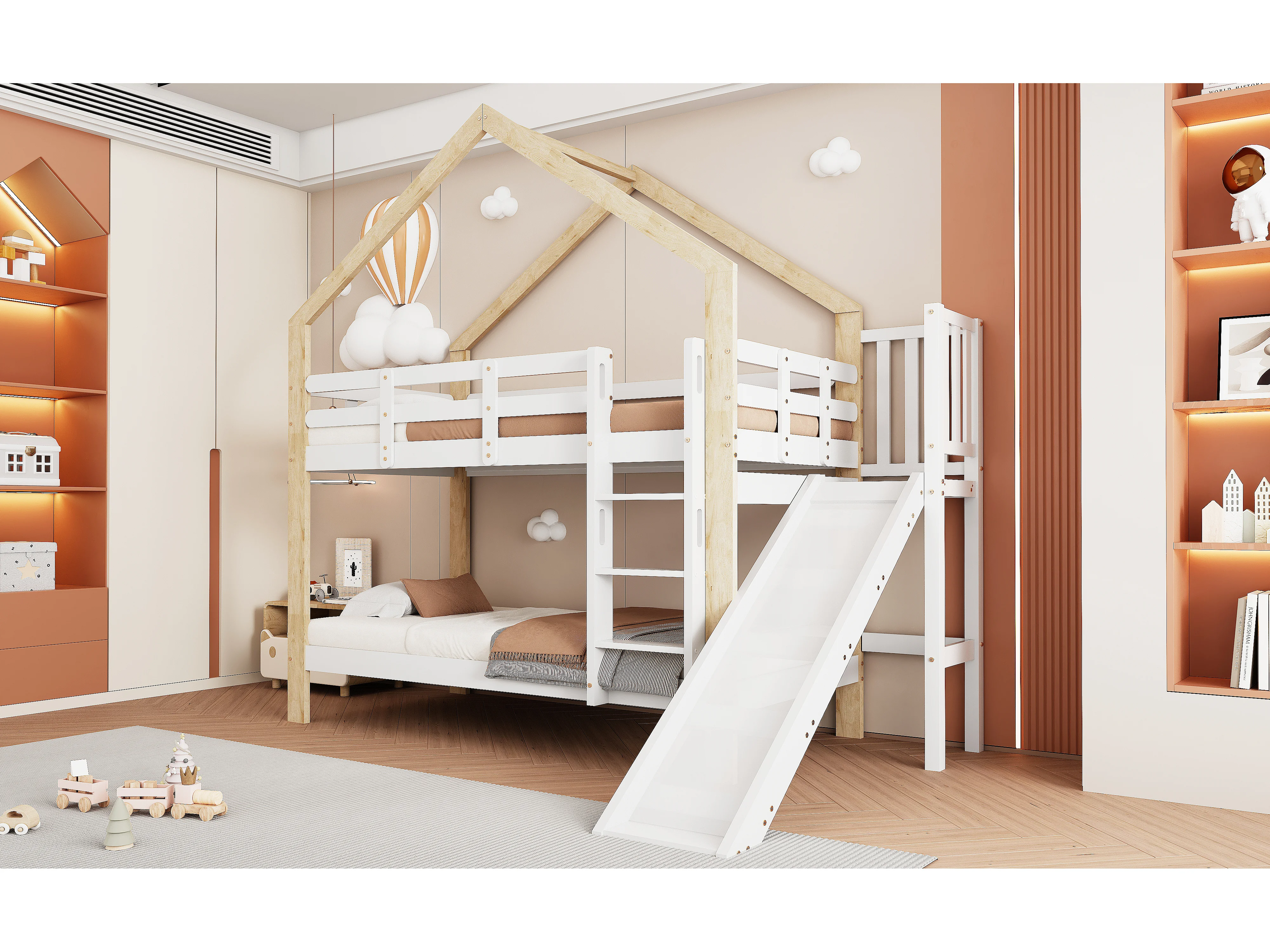 Lit Superposé avec Glissade et Échelle à 3 Niveaux, Lit Maison avec Garde-Corps, 90x200cm, Blanc