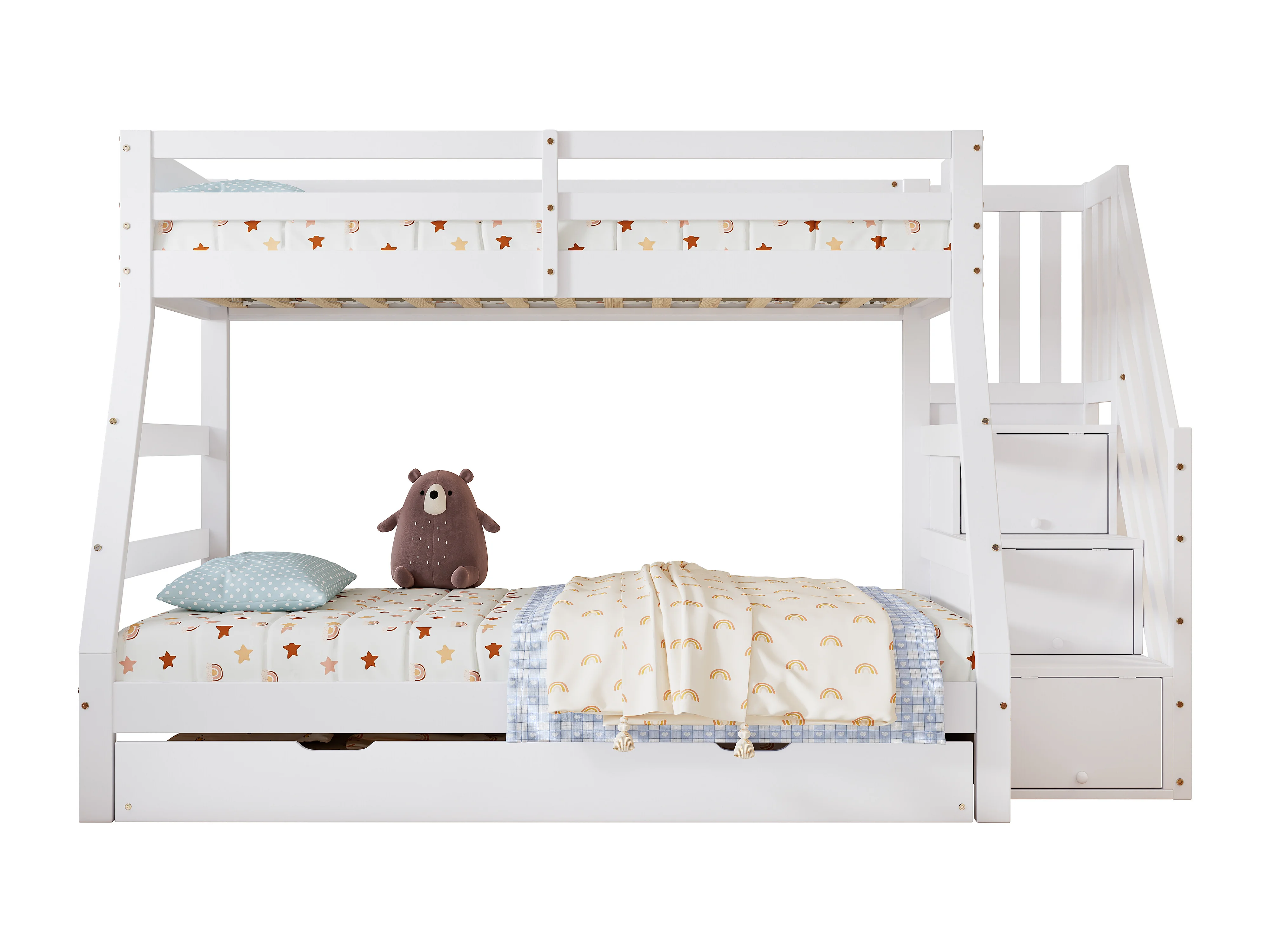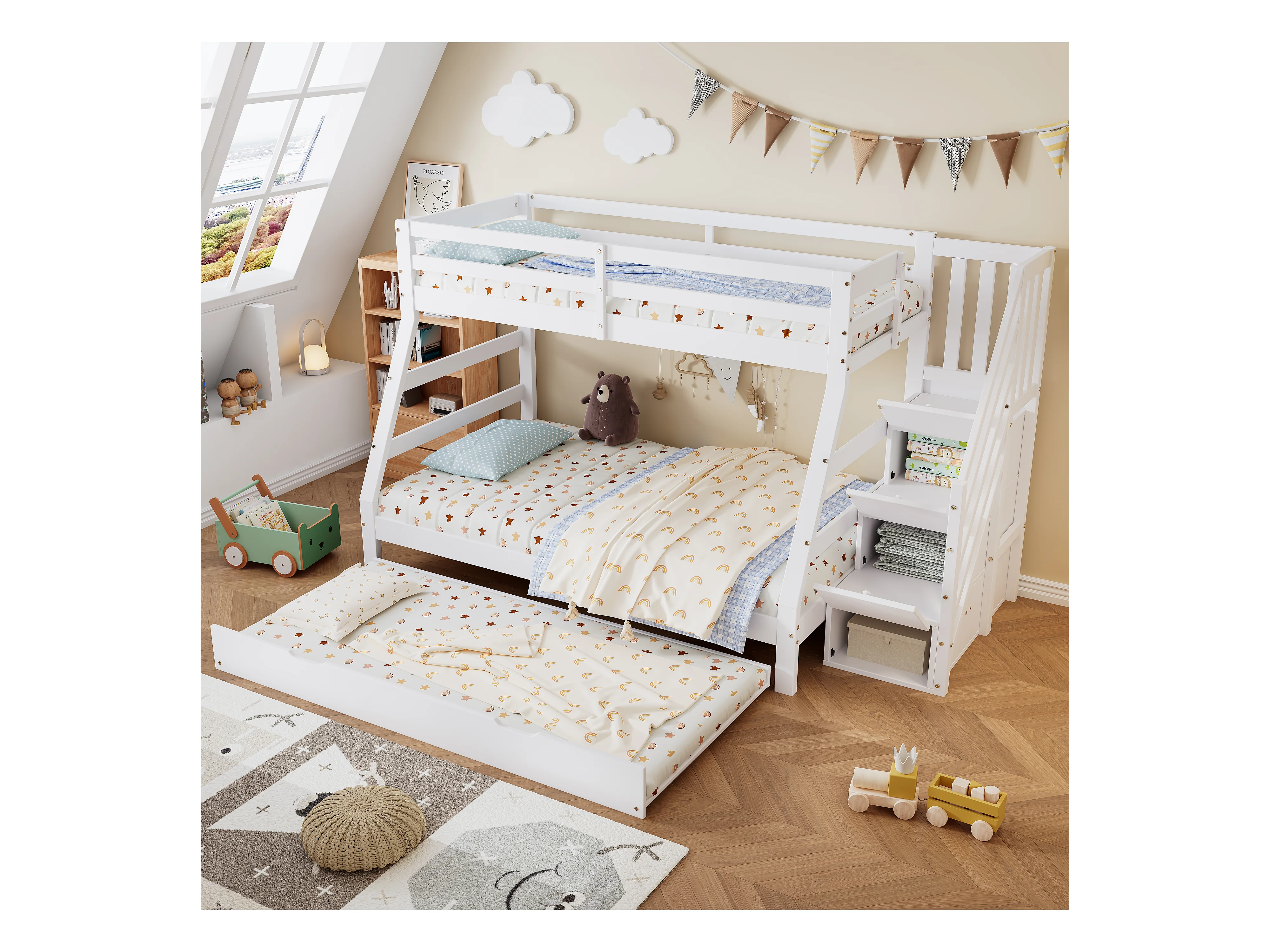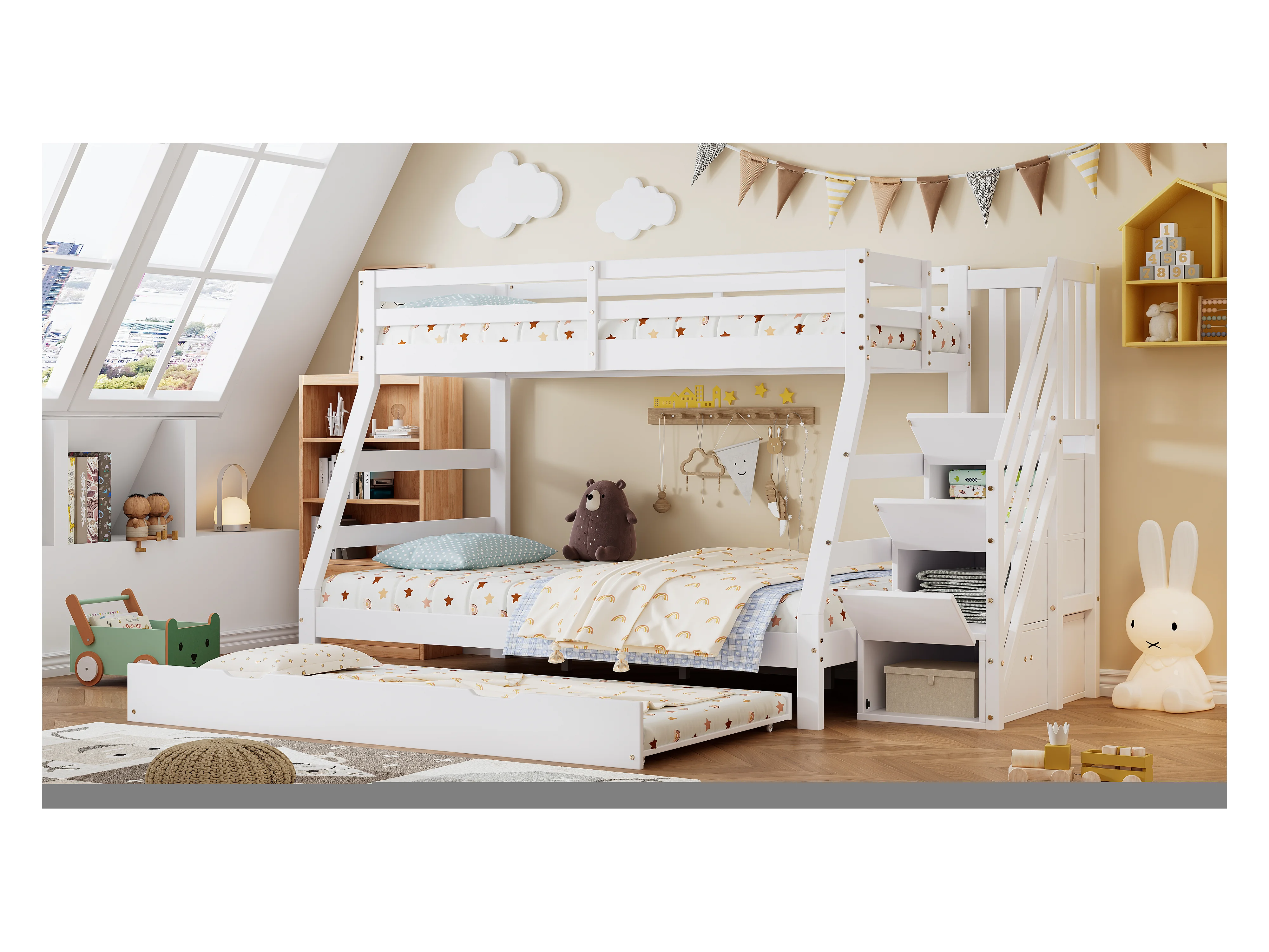 Lit superposé avec lit roulant, échelle avec rangements, protection sur 4 côtés, MDF + pin, blanc, 90x190 cm + 90/120x200 cm (257x146x145 cm)