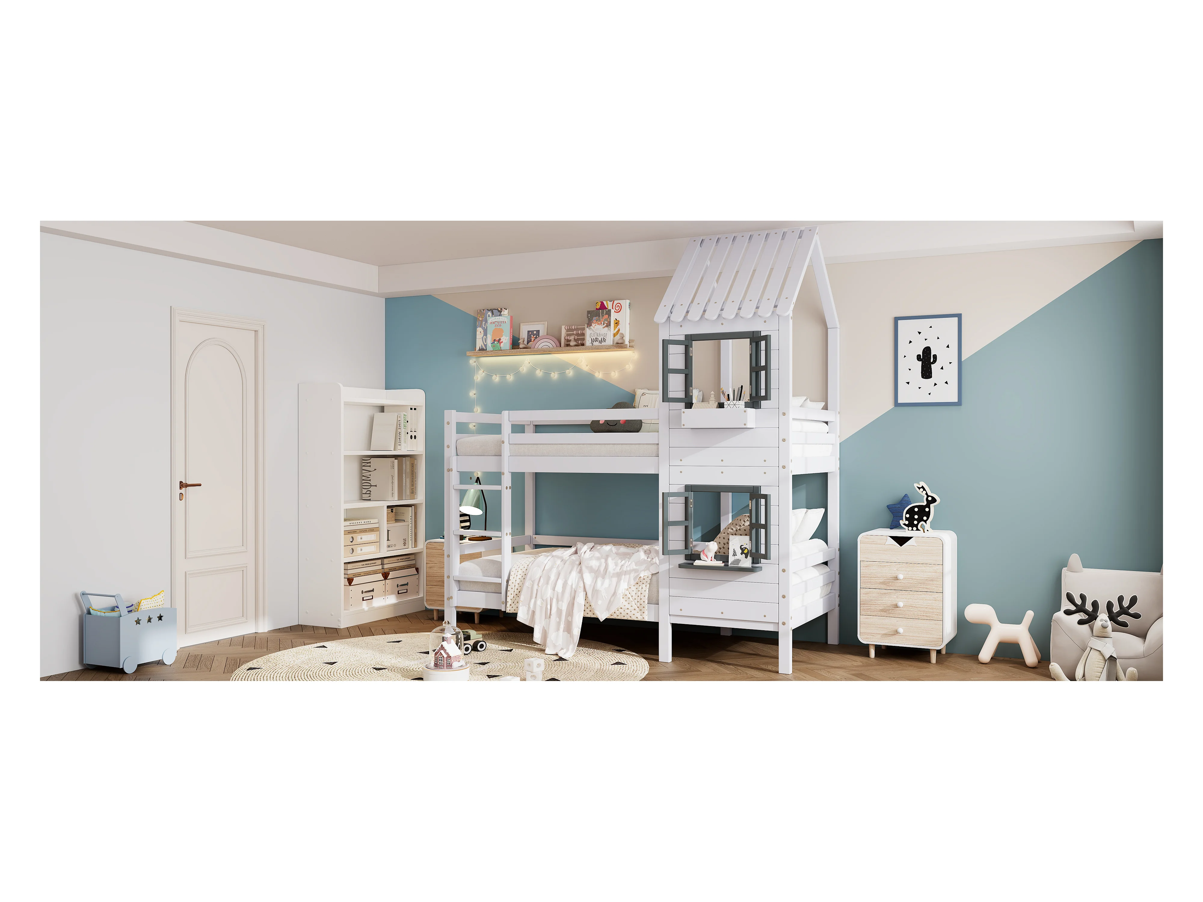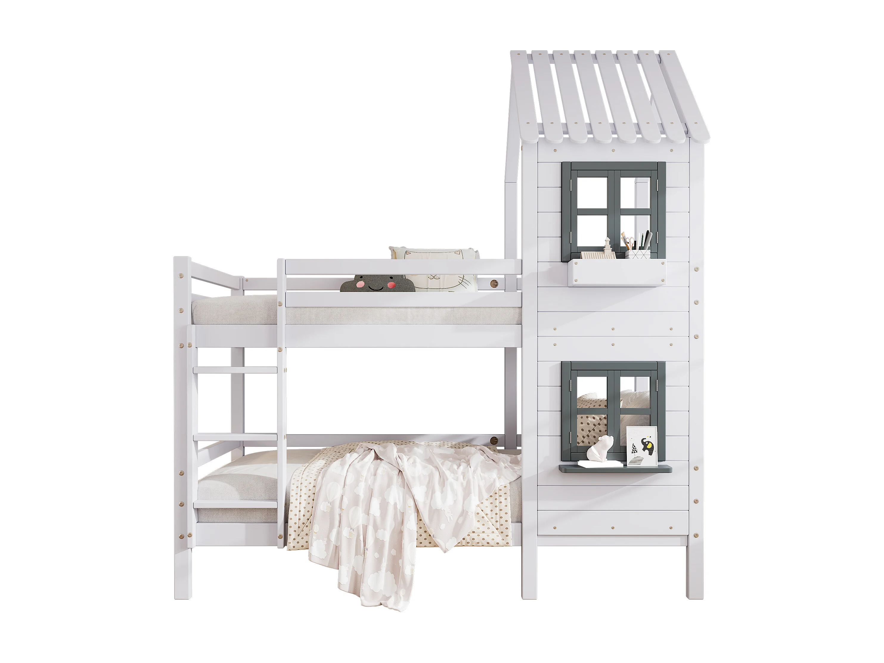 Lit superposé avec mains courantes et fenêtres, lit cabane, avec barrière de sécurité, cadre en pin, blanc (90x200cm)