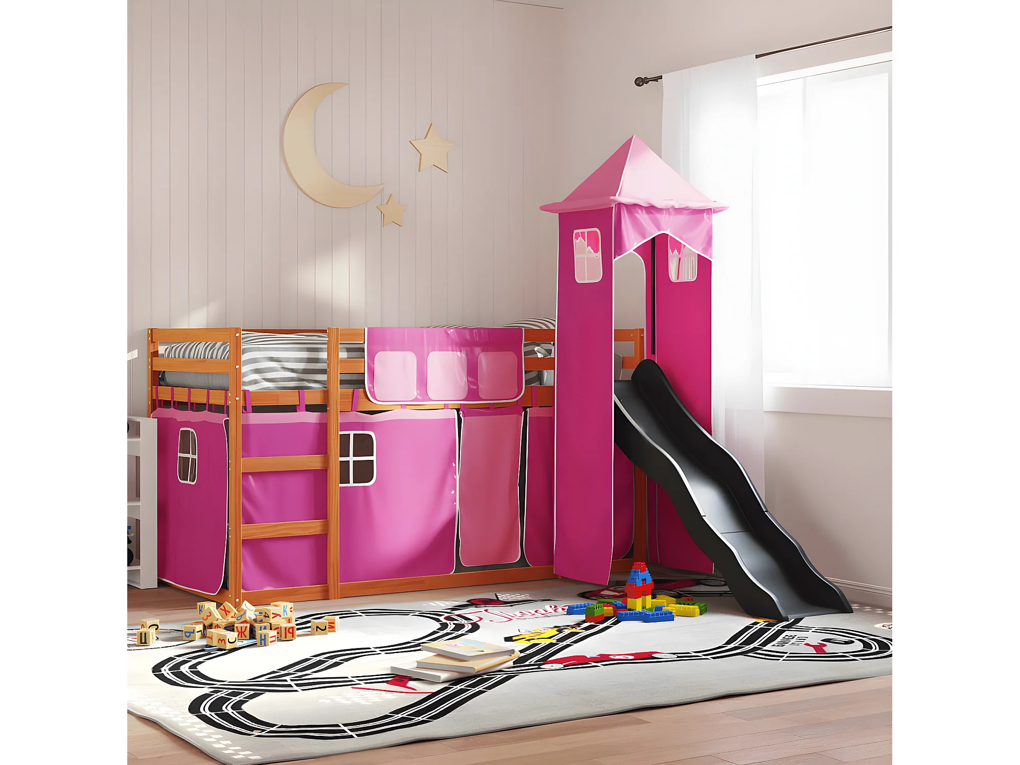 Lit superposé avec toboggan et rideaux rose 90x200 cm