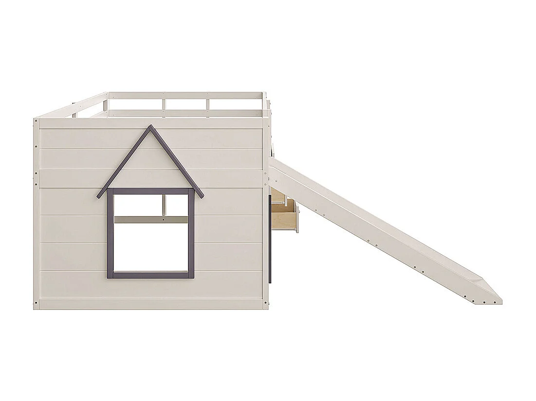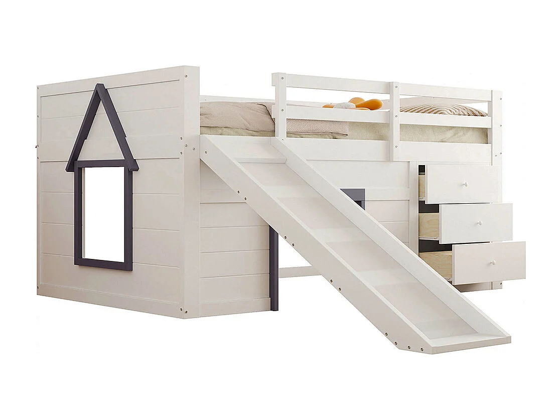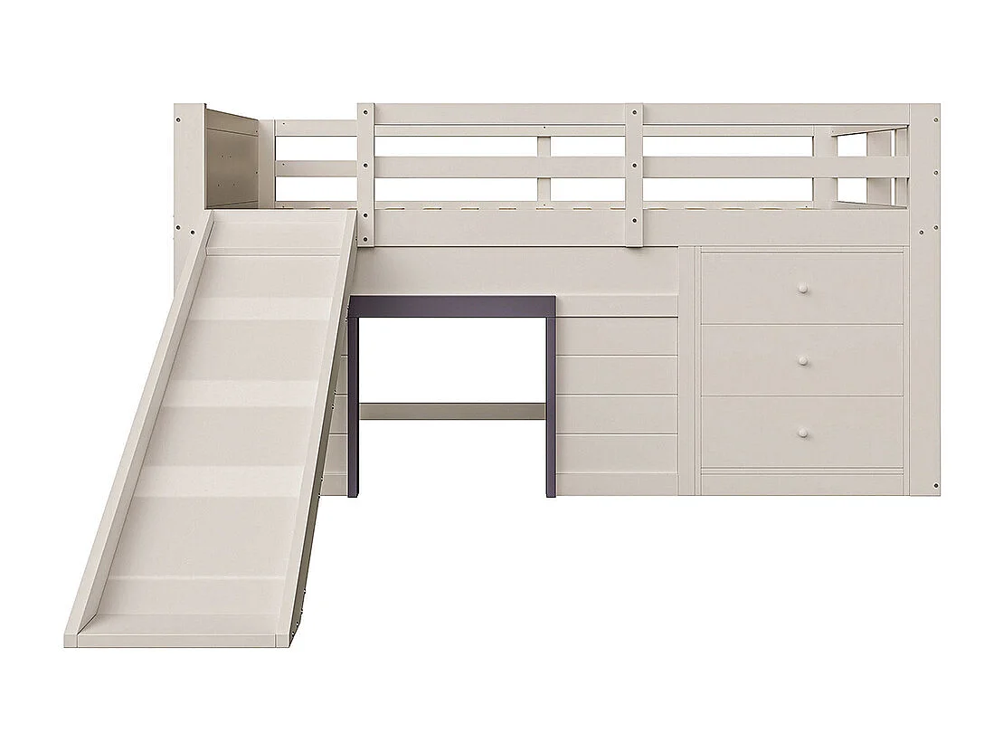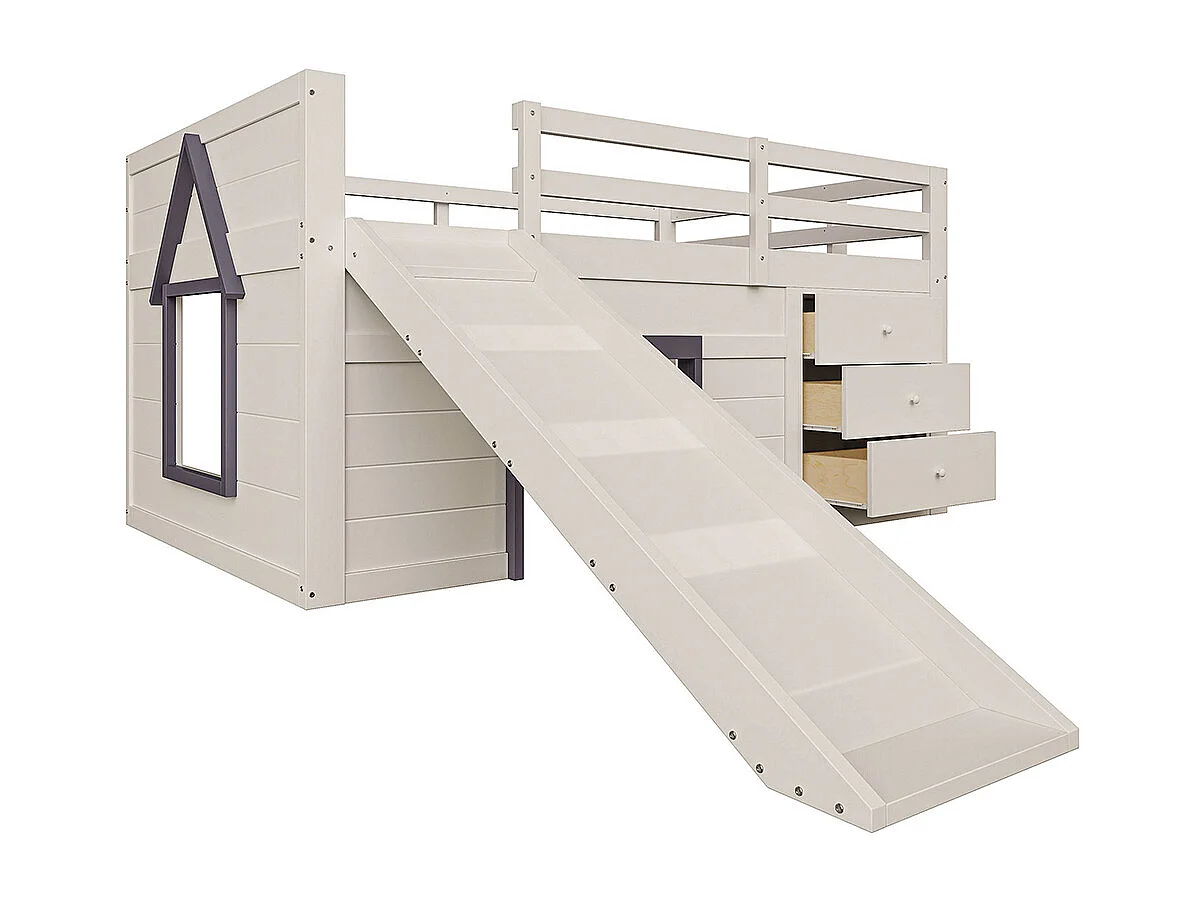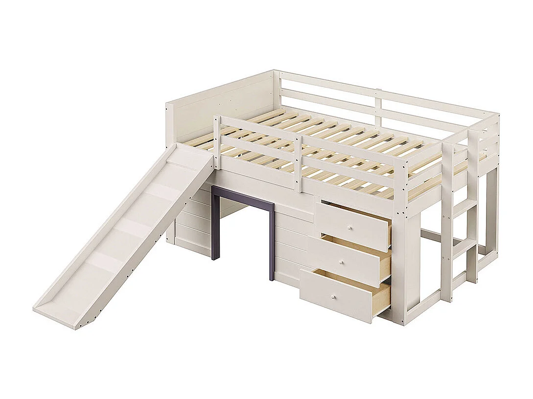 Lit superposé bas mezzanine 140x200 toboggan trois tiroirs deux portes crème