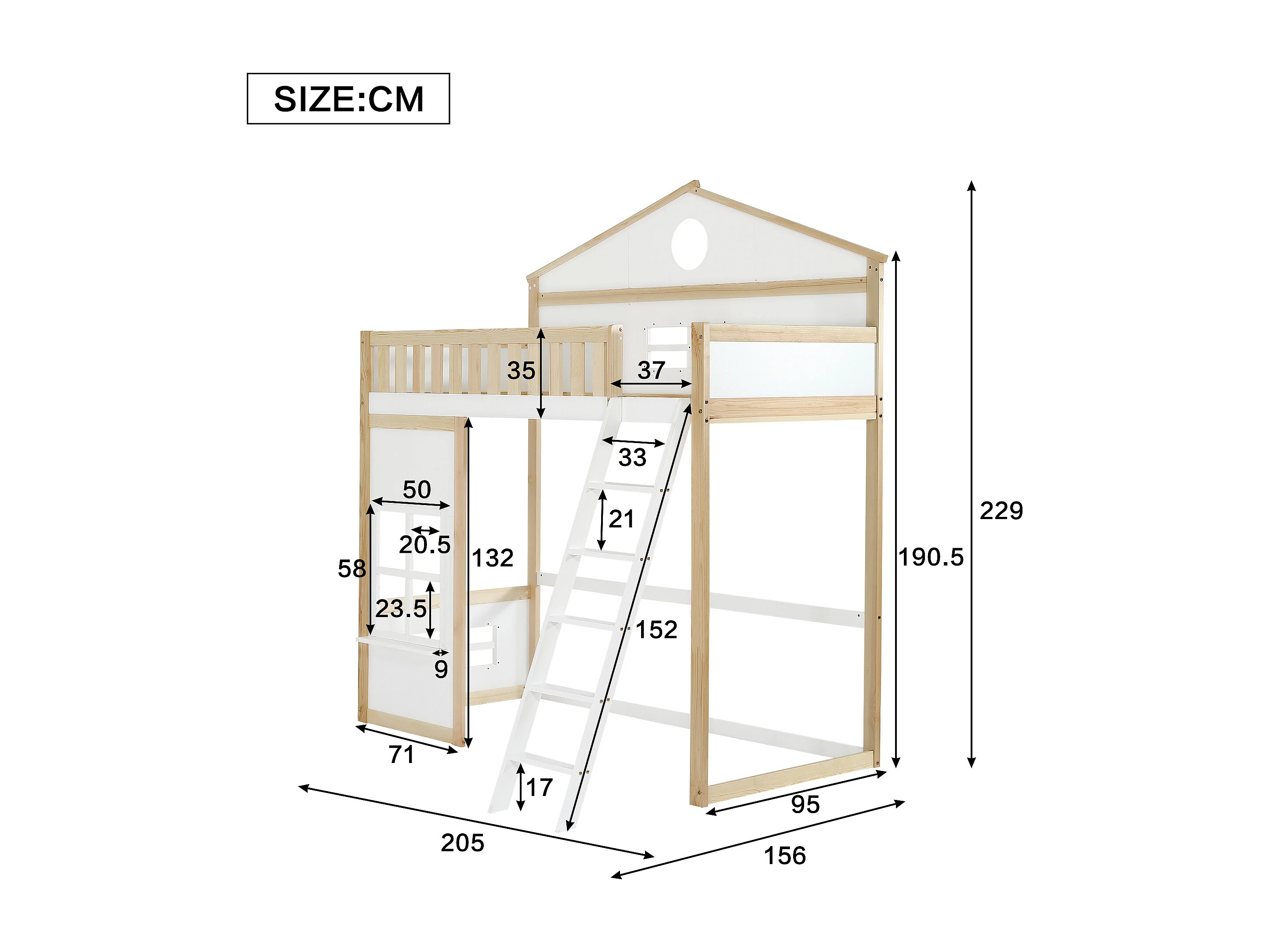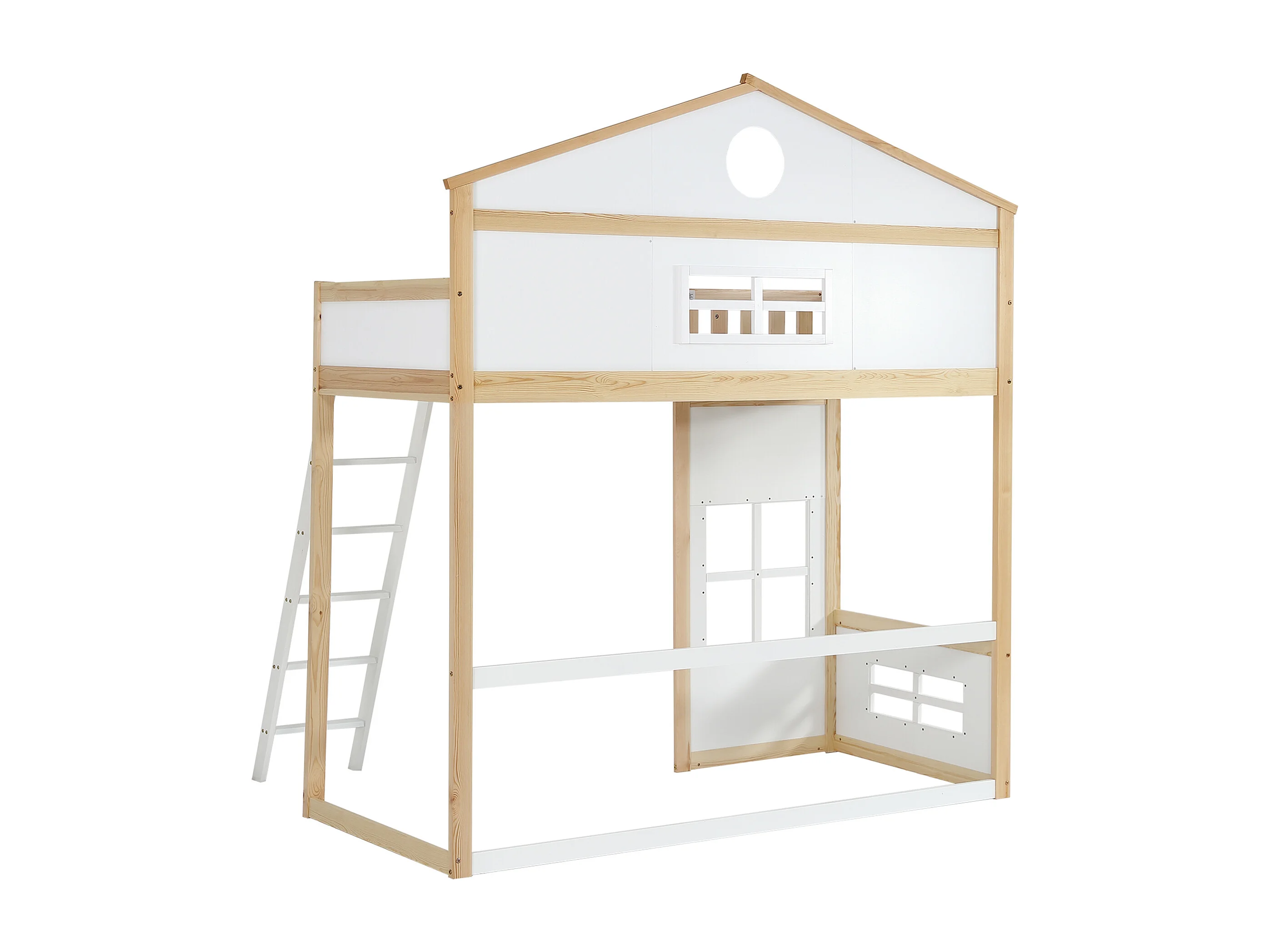 Lit superposé, échelle, protection, garde-corps, toit, fenêtre, pin+MDF, blanc+naturel, 90x200cm