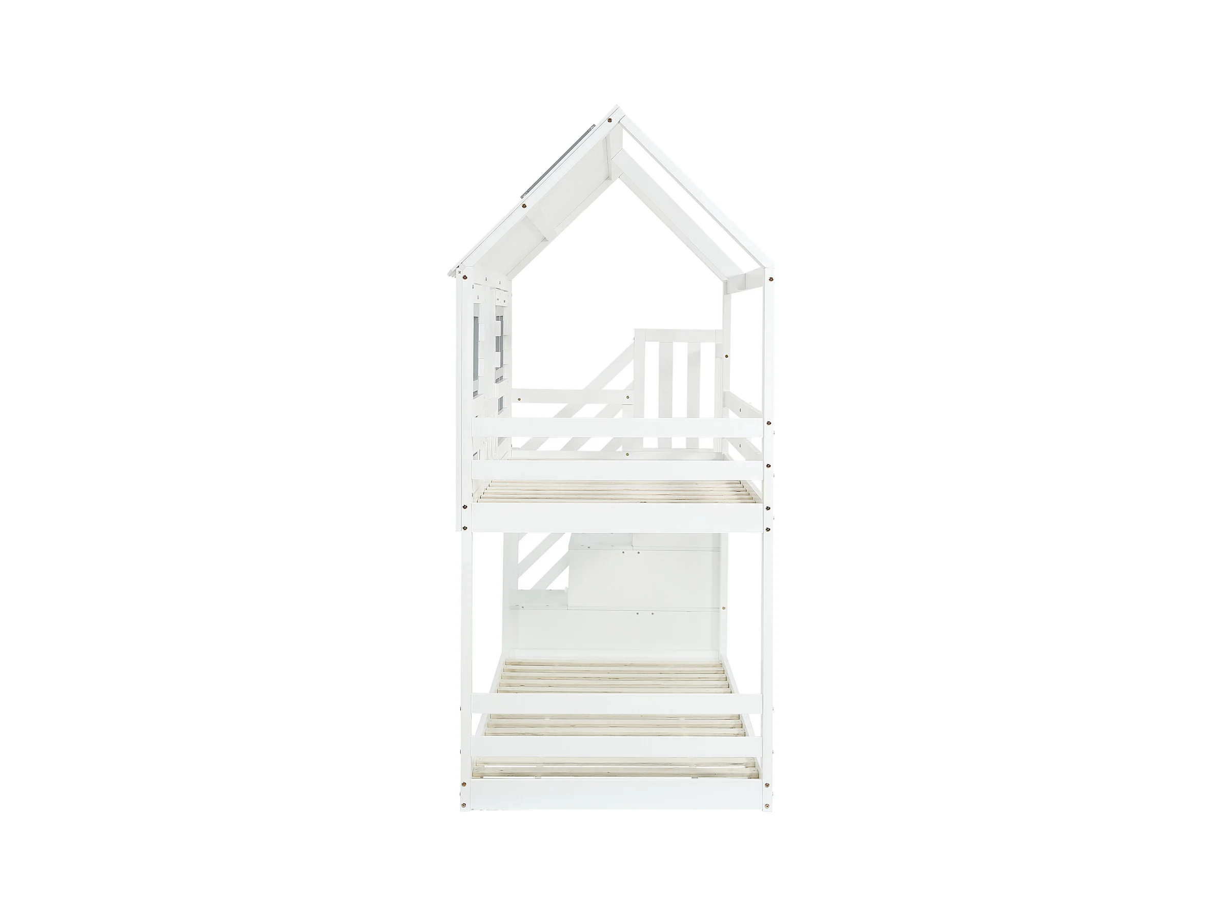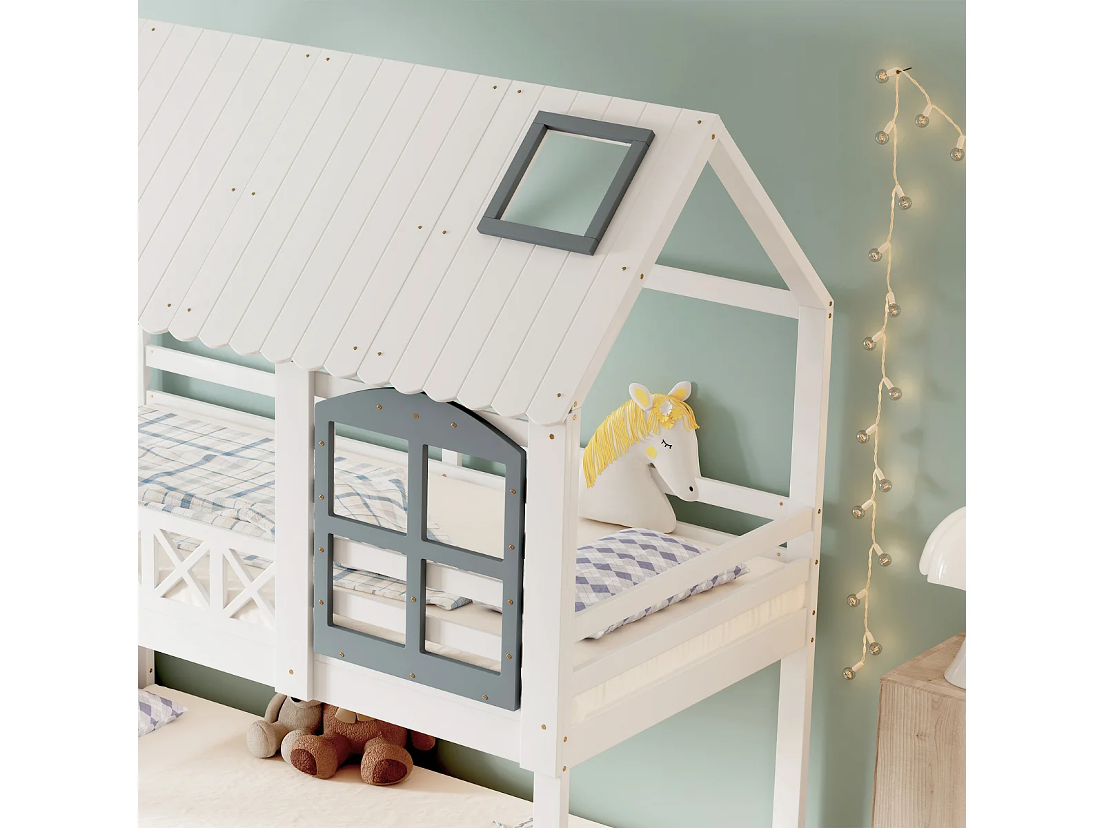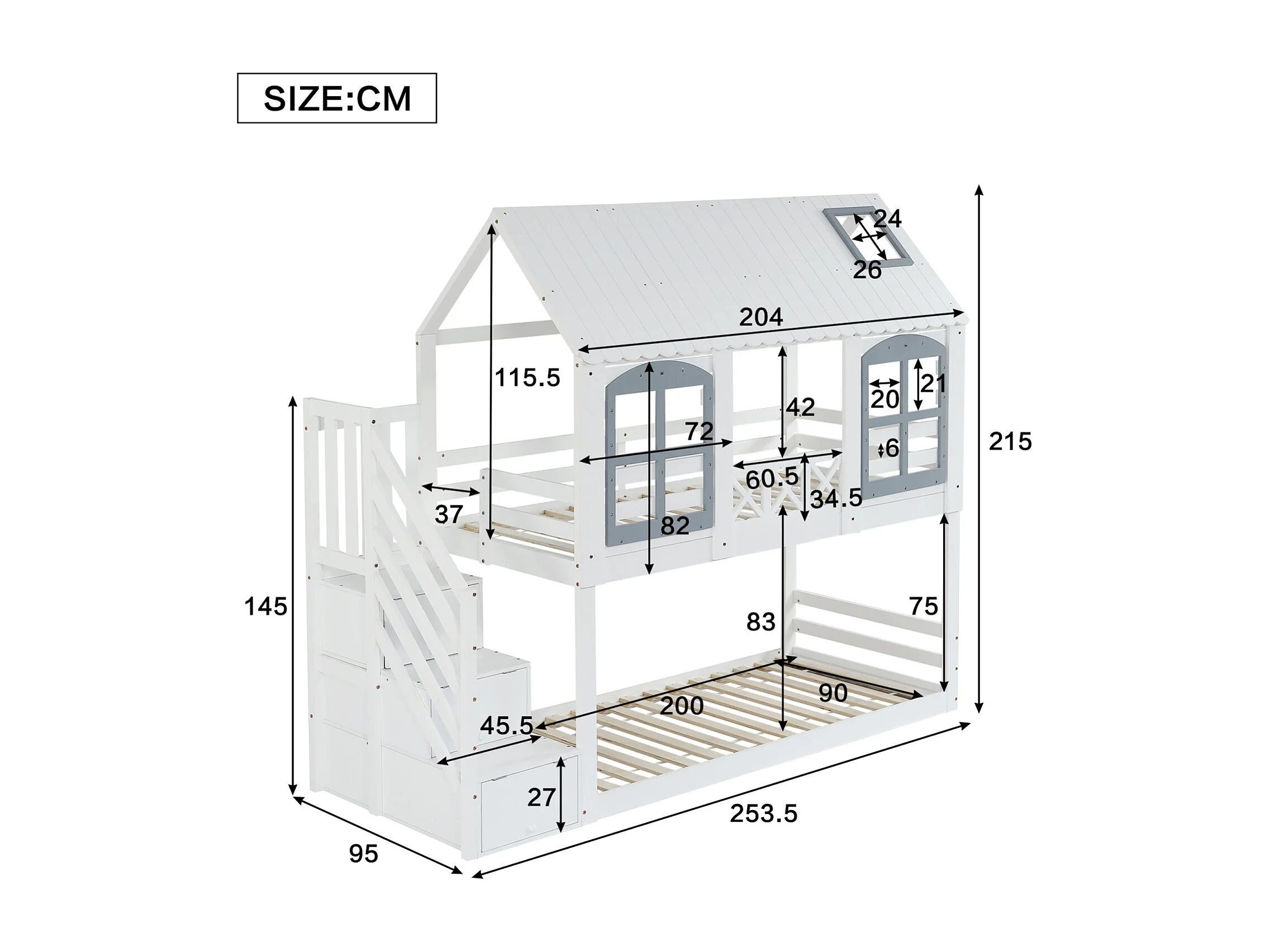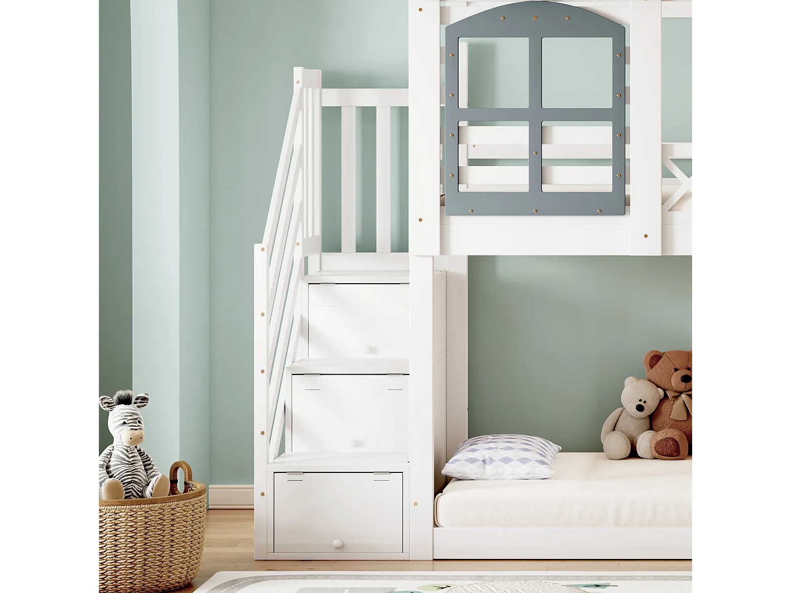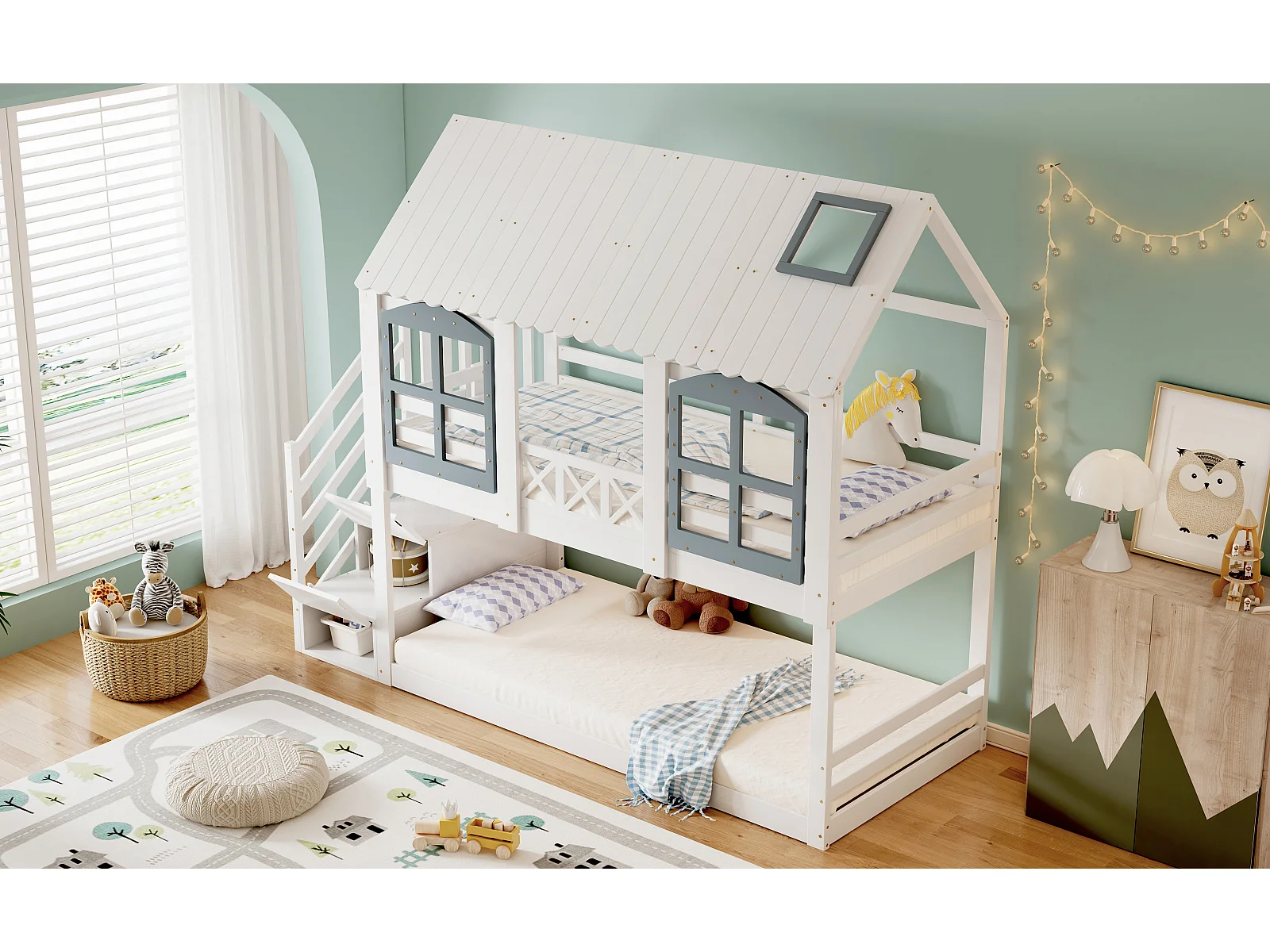 Lit Superposé en Bois avec 3 échelles de Rangement et Sommier à Lattes, Lit Enfant 90x200 cm, Blanc