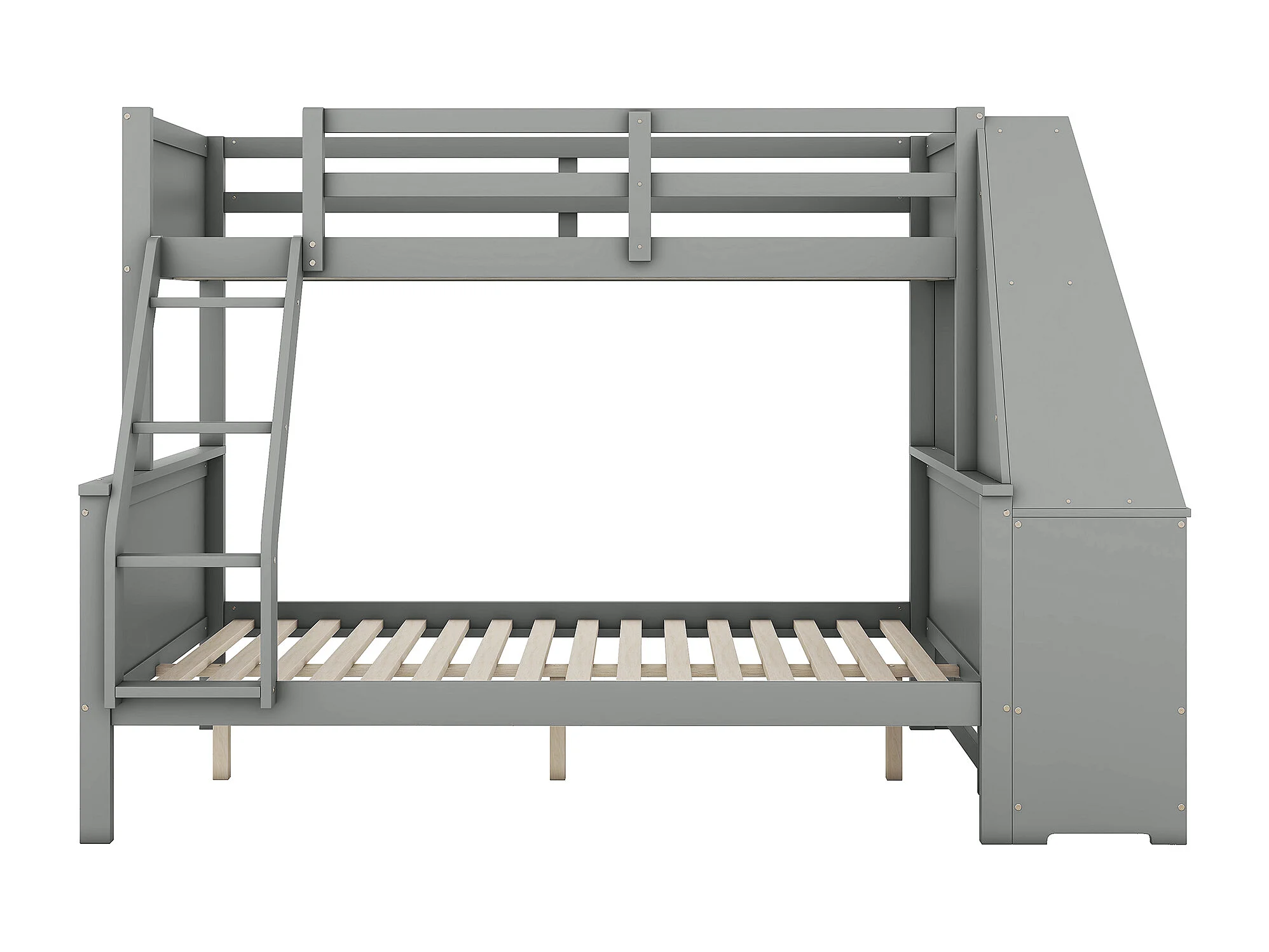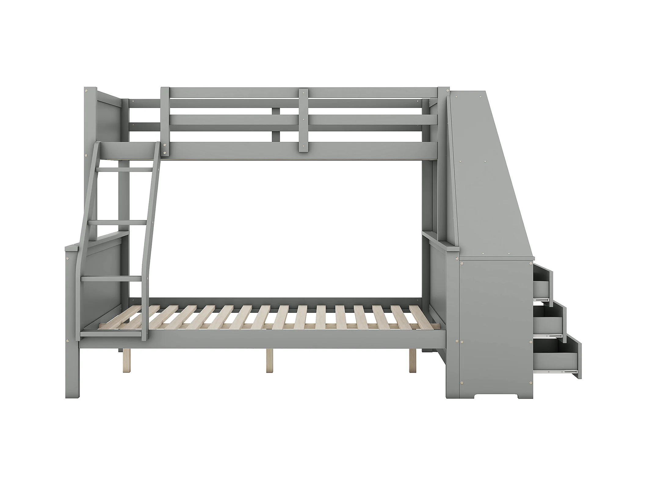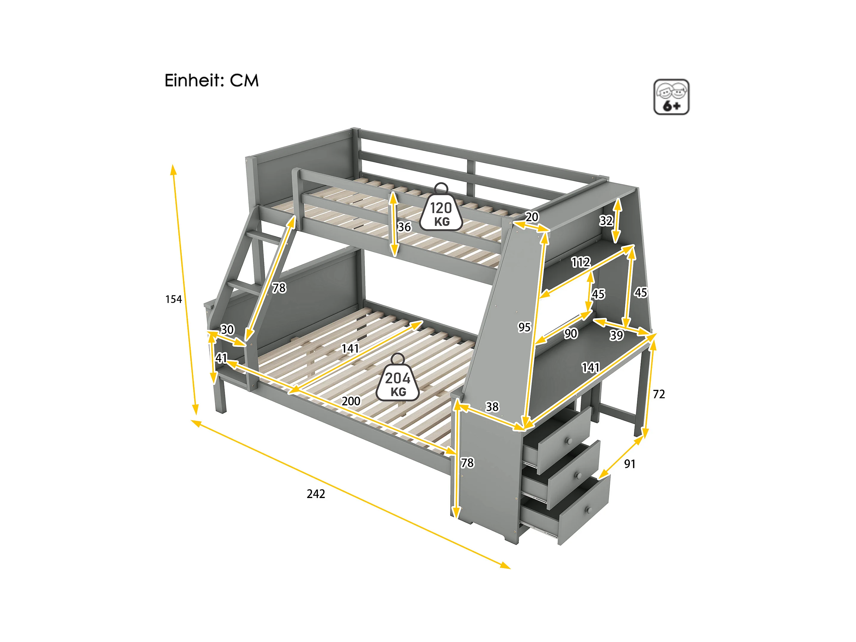 Lit superposé 90/140x200 cm avec bureau et 3 tiroirs - protection anti-chute - bois - gris (sans matelas)