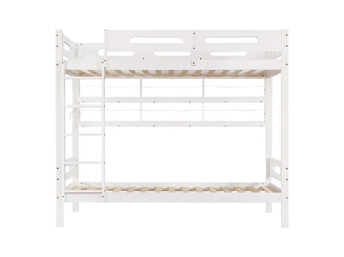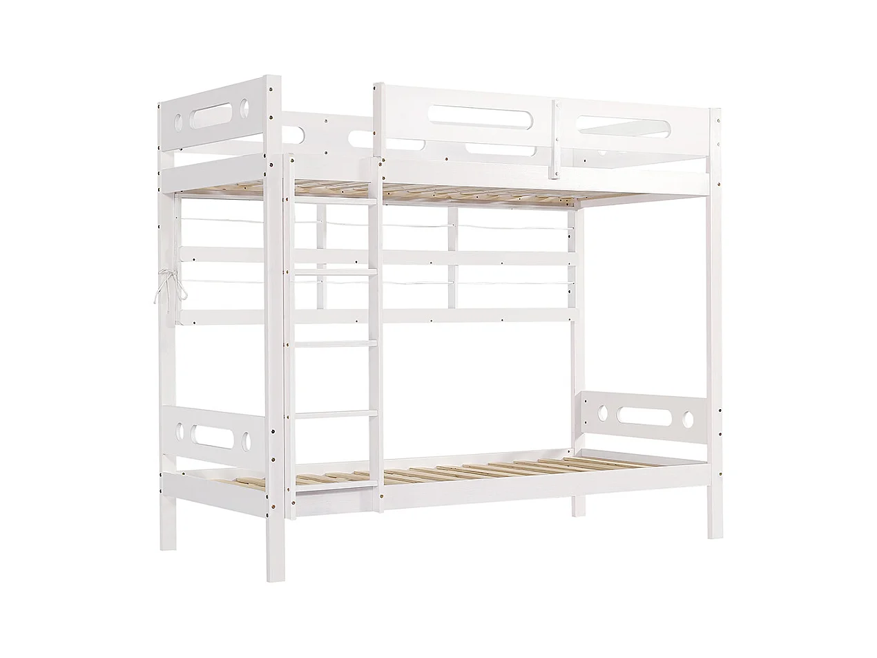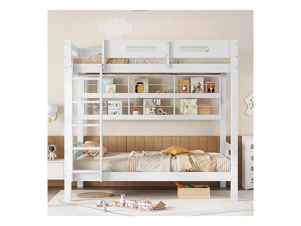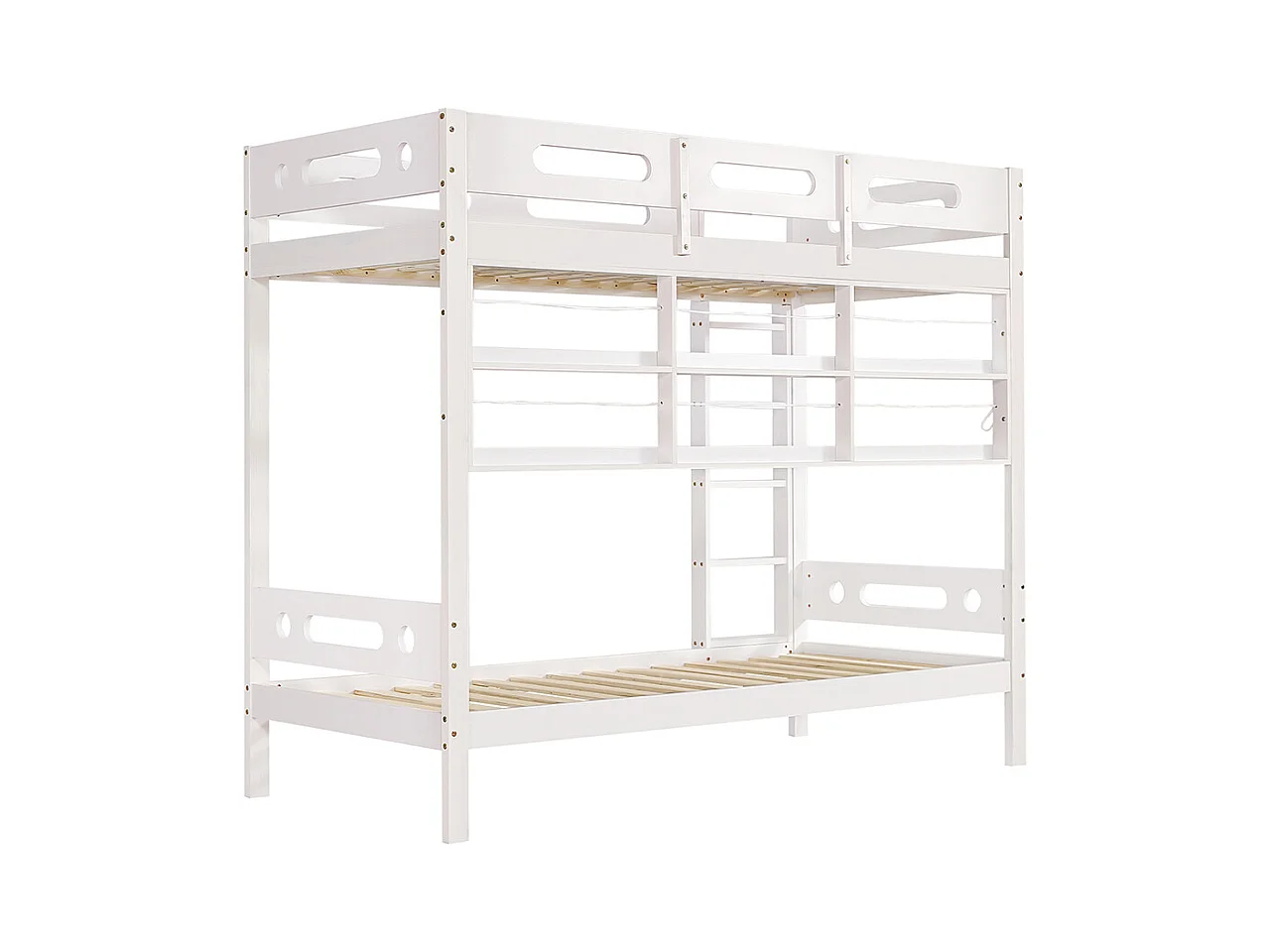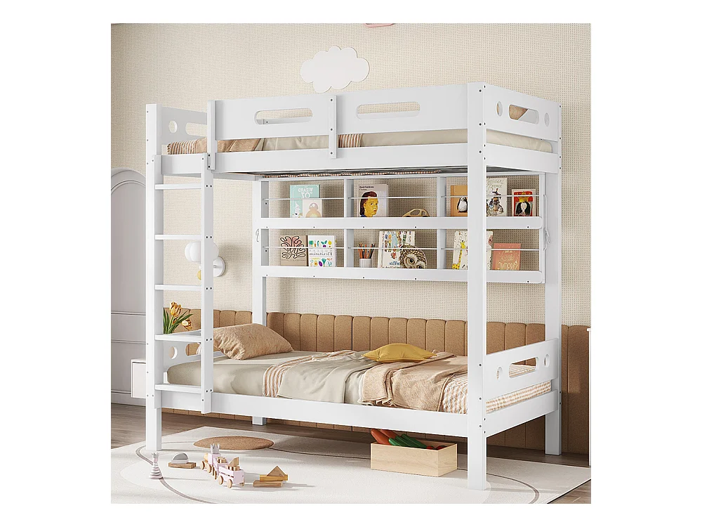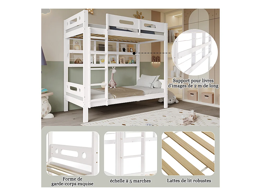 Lit superposé enfant 90x200 cm avec barrière de sécurité étagère ouverte échelle à cinq marches pin+MDF blanc