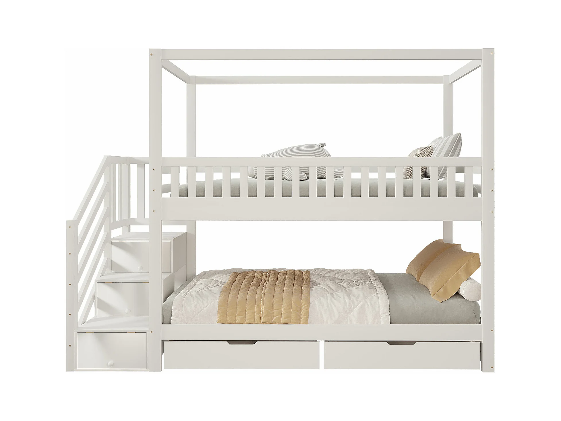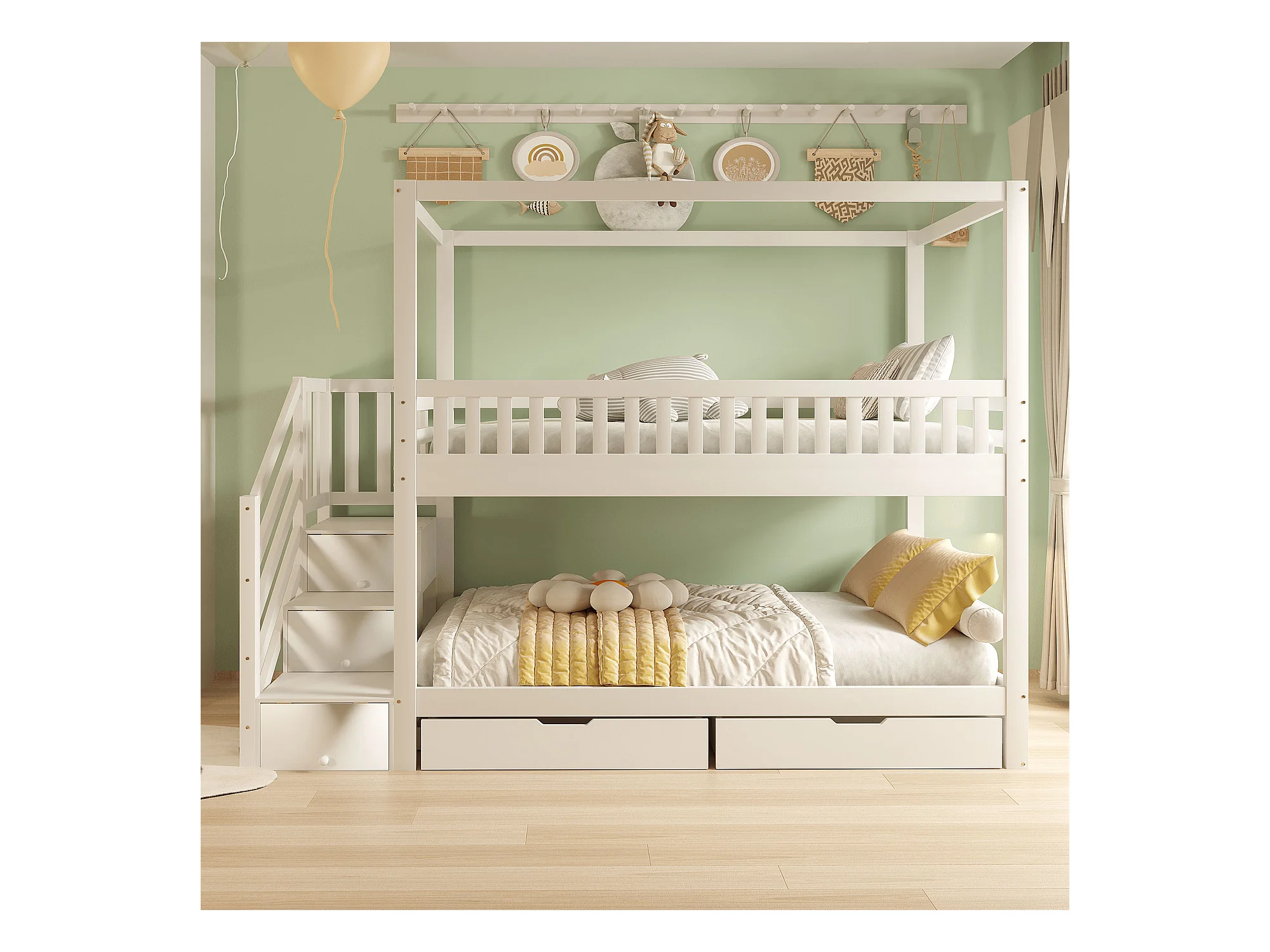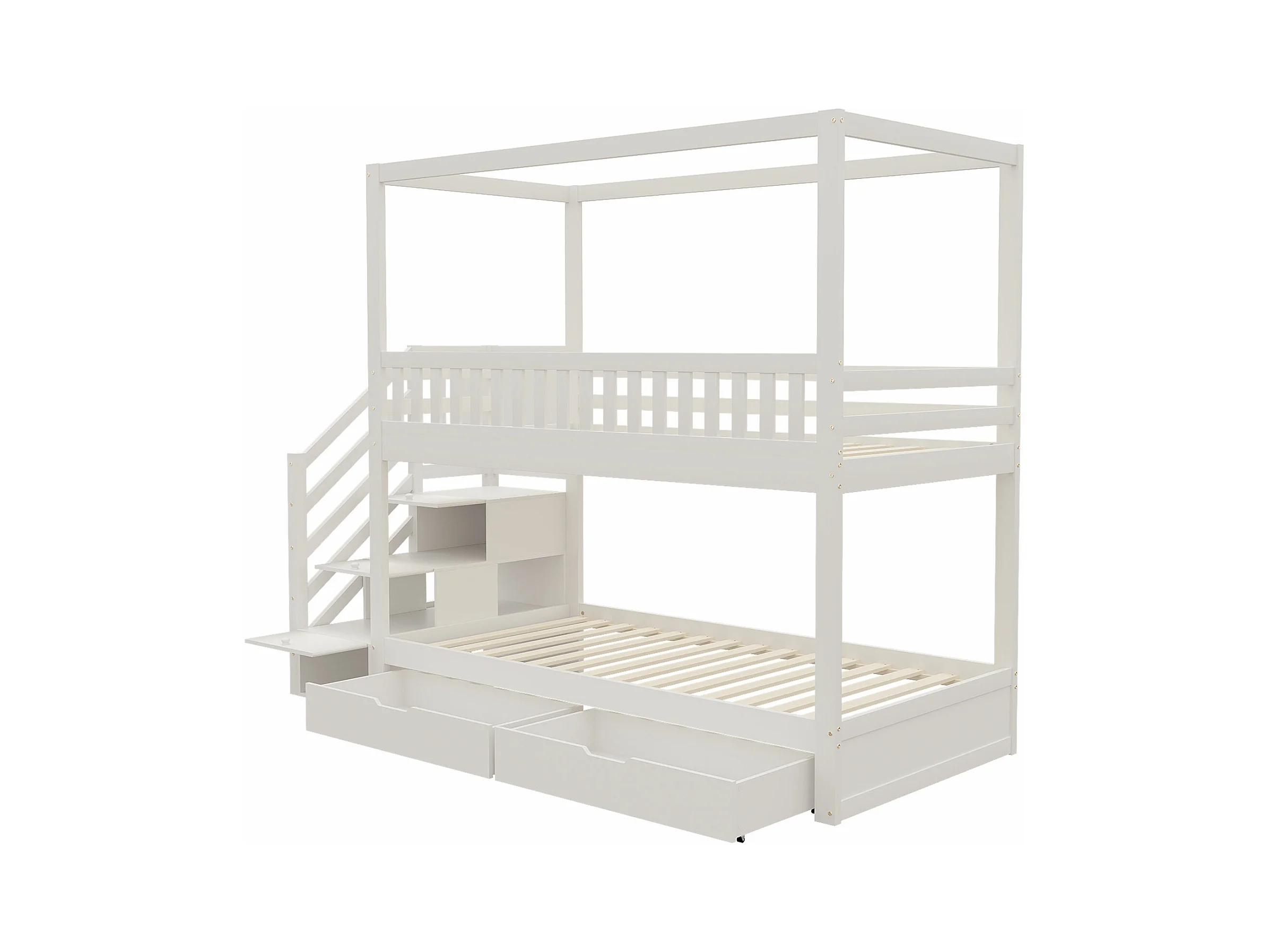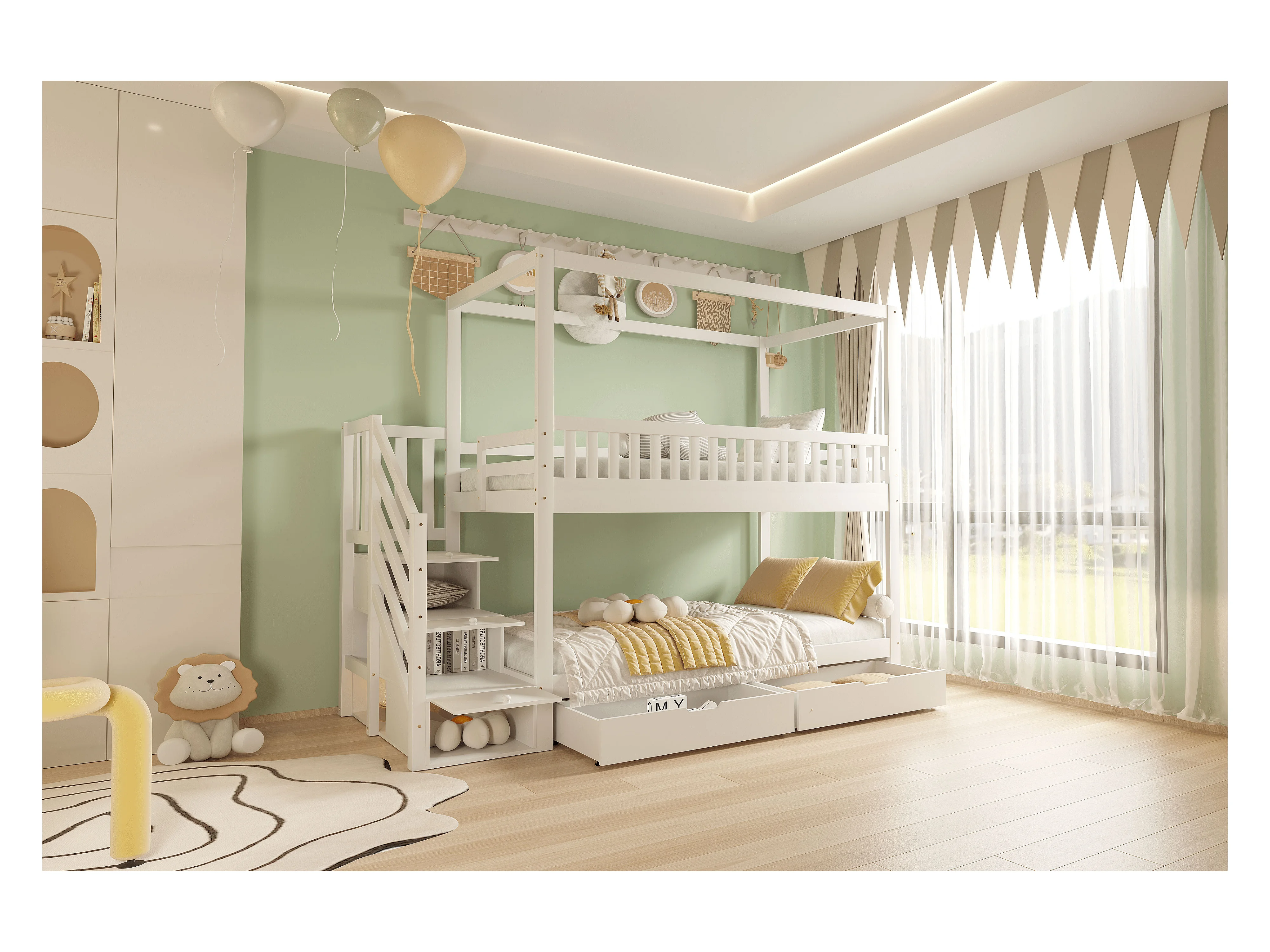 Lit superposé enfant 90x200 cm - design barrière de sécurité - avec 2 tiroirs - échelle de sécurité - blanc