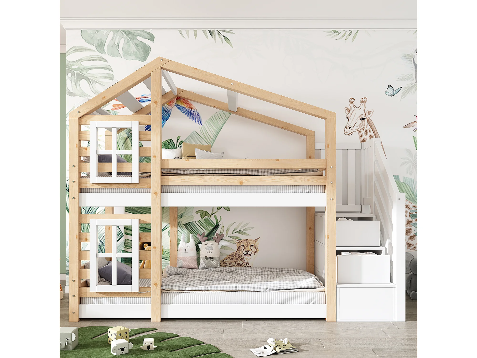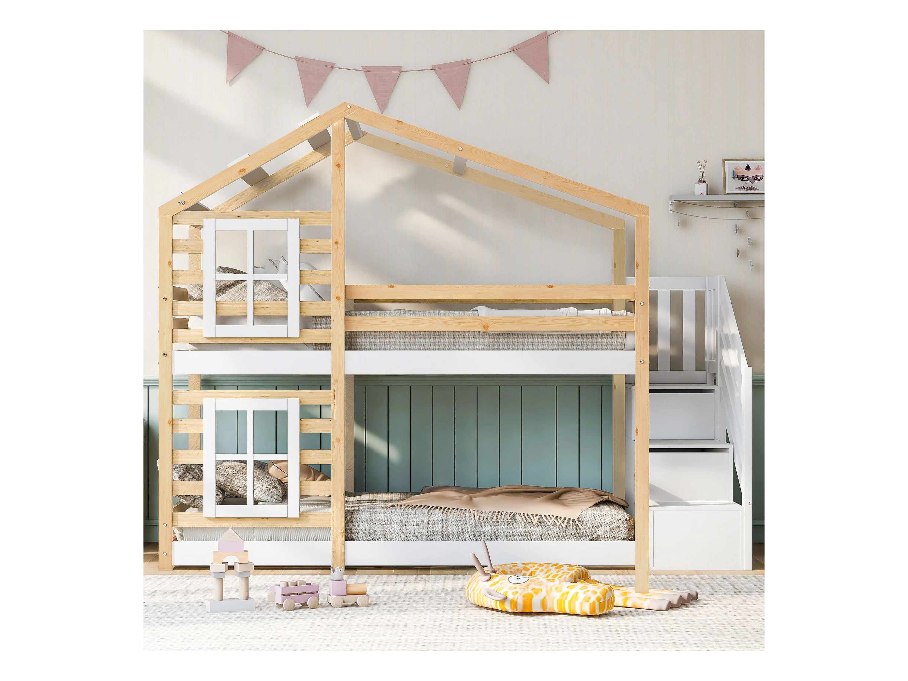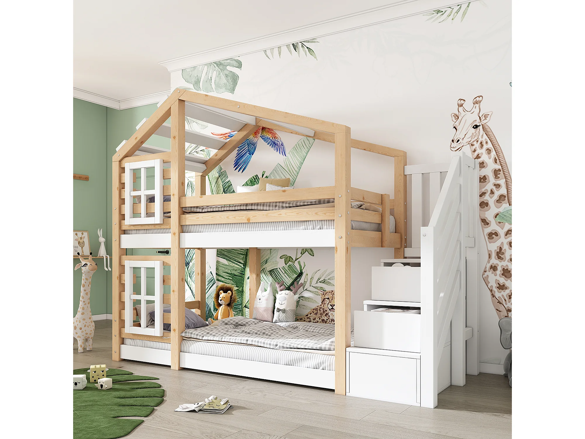Lit superposé enfant 90x200 cm, lit en forme de maison avec rangements et protection anti-chute, naturel et blanc, avec tableau (256x96x192 cm)