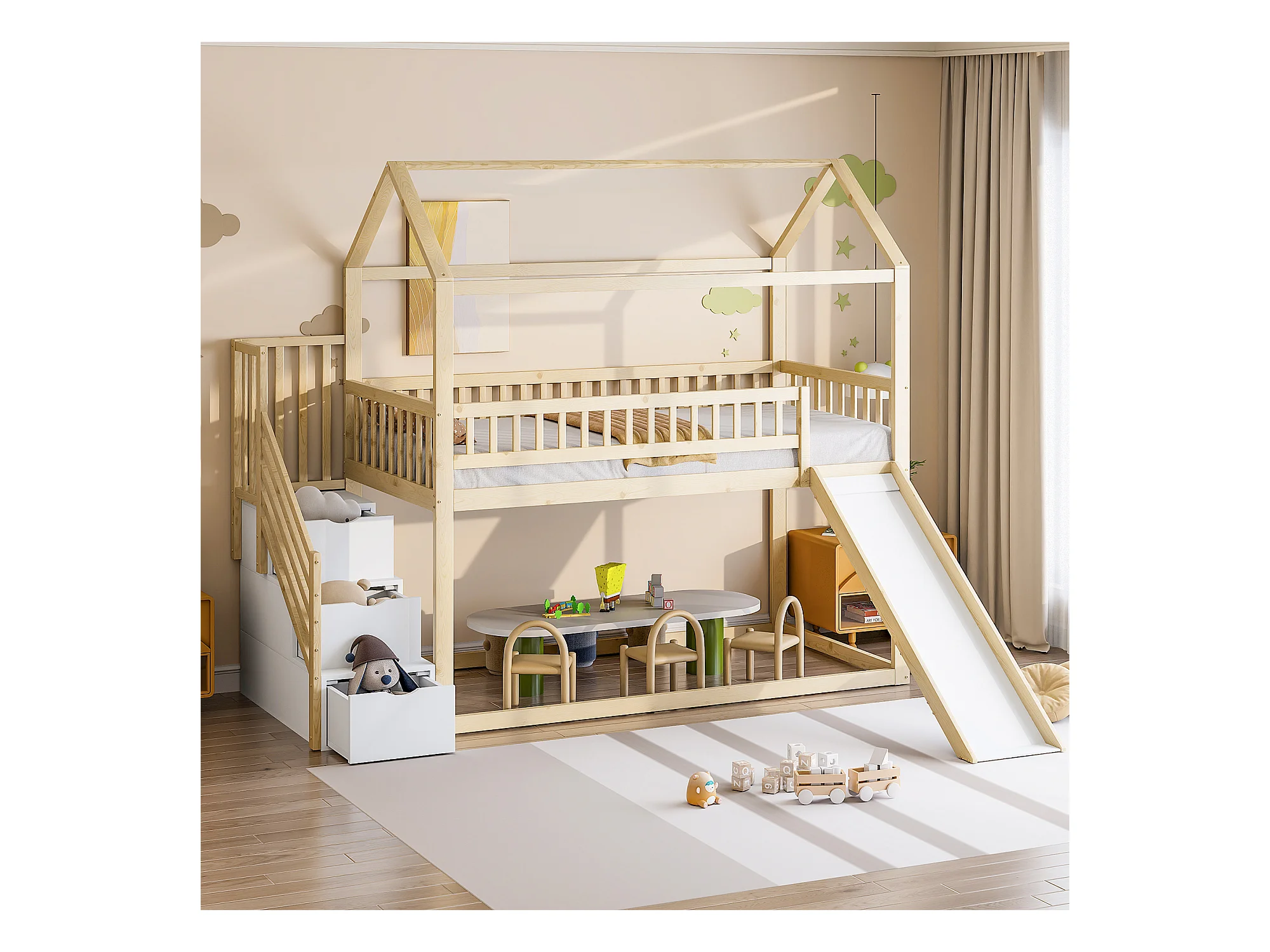 Lit superposé enfant avec toboggan et échelle de rangement, construction sécurisée en bois massif, couleur bois naturel (253x95x206.7cm)