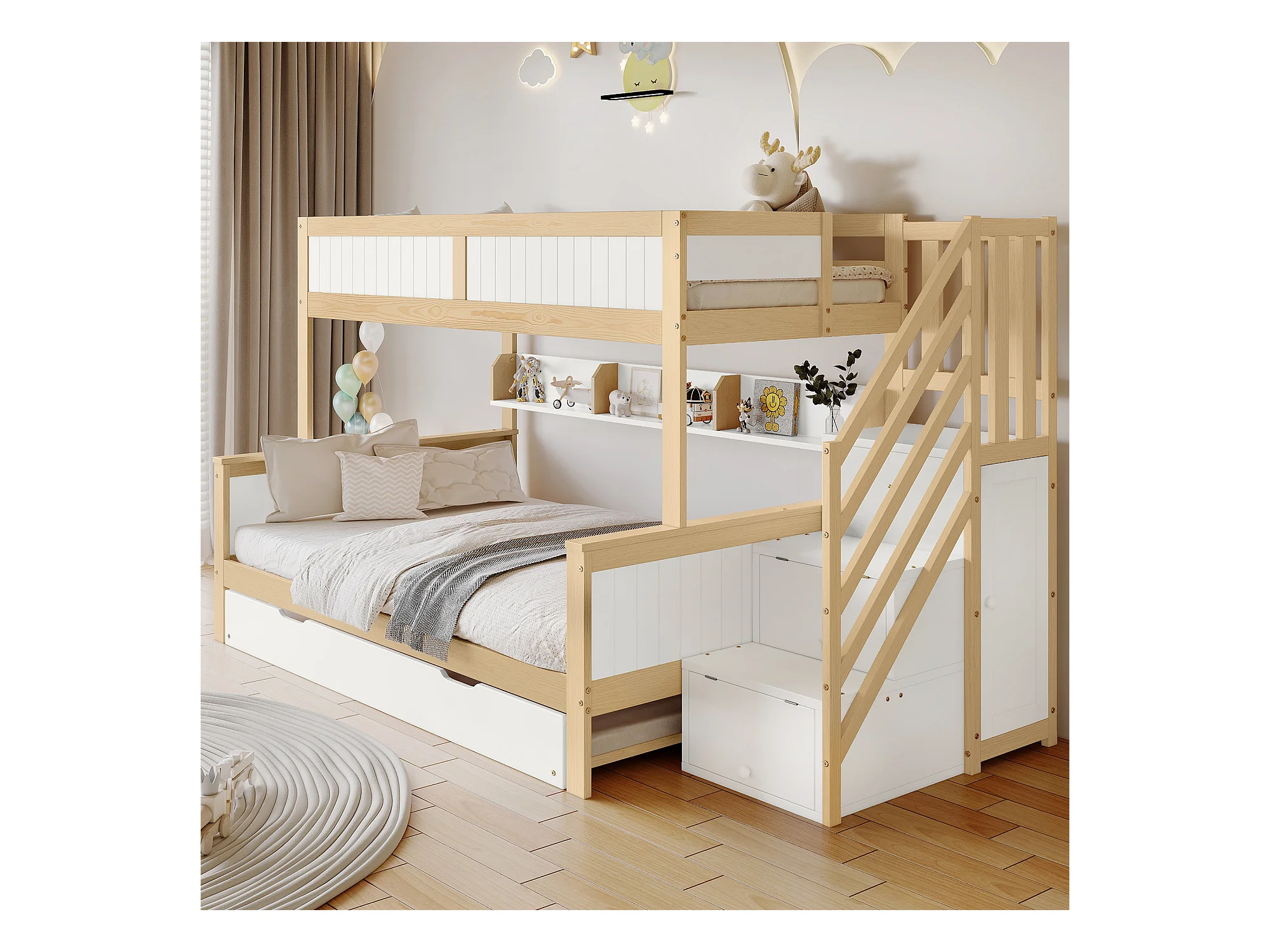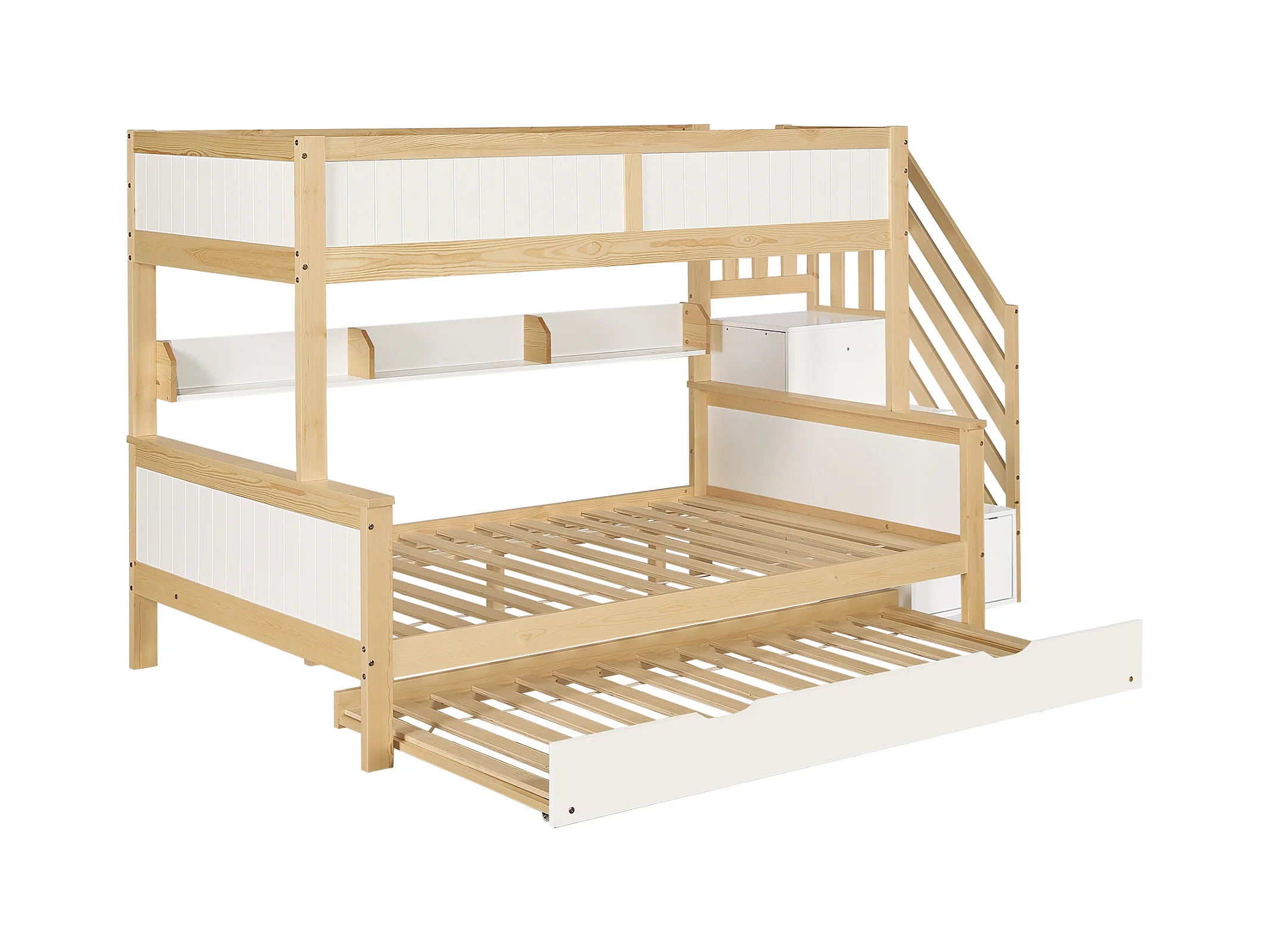 Lit superposé enfant, barrière de sécurité, protection, 3 positions, lit gigogne, armoire, échelle d'angle, pin + MDF, blanc + naturel, 90x200/190/120cm