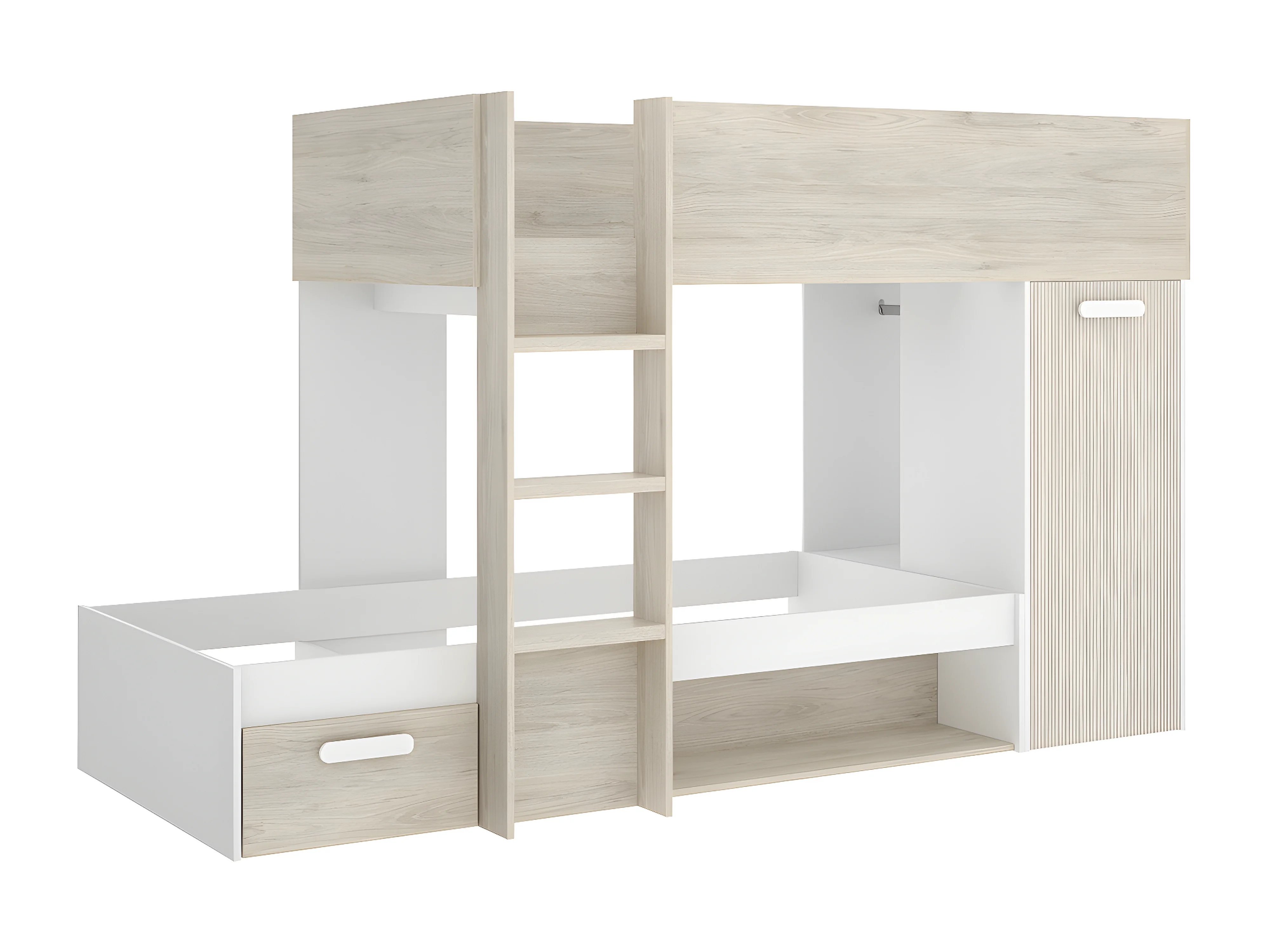 Lit superposé enfant coloris chêne naturel, blanc, imitation lamelles, couchage 90 x190 cm - longueur 245 x profondeur 111 x hauteur 150 cm