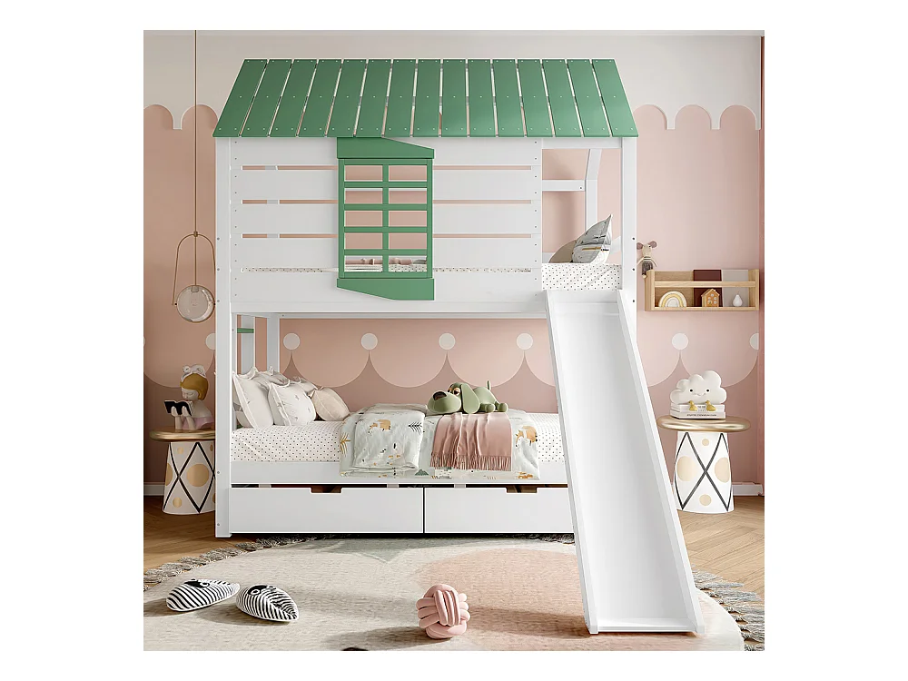 Lit superposé maison 90x200 toboggan 2 tiroirs blanc vert