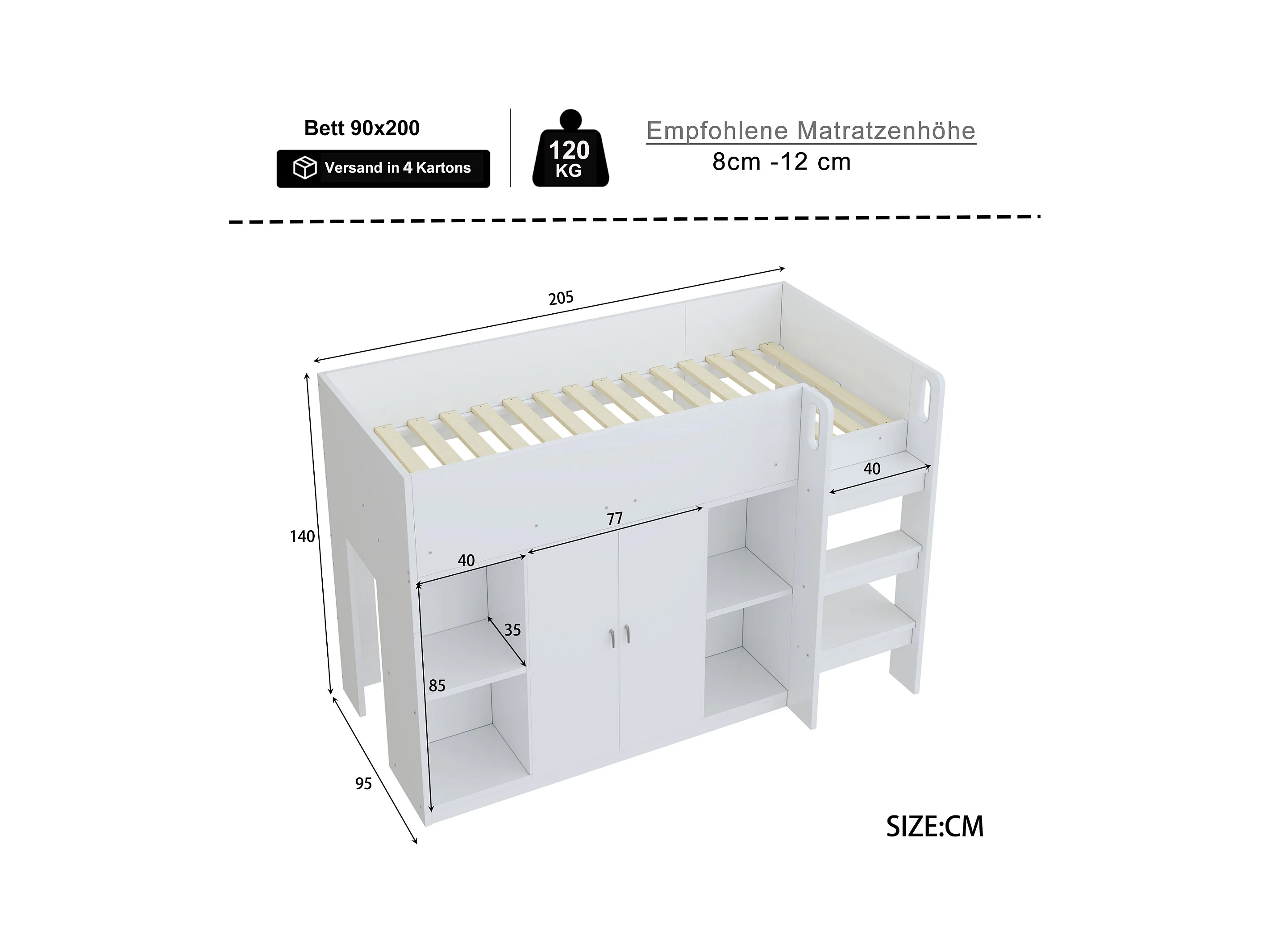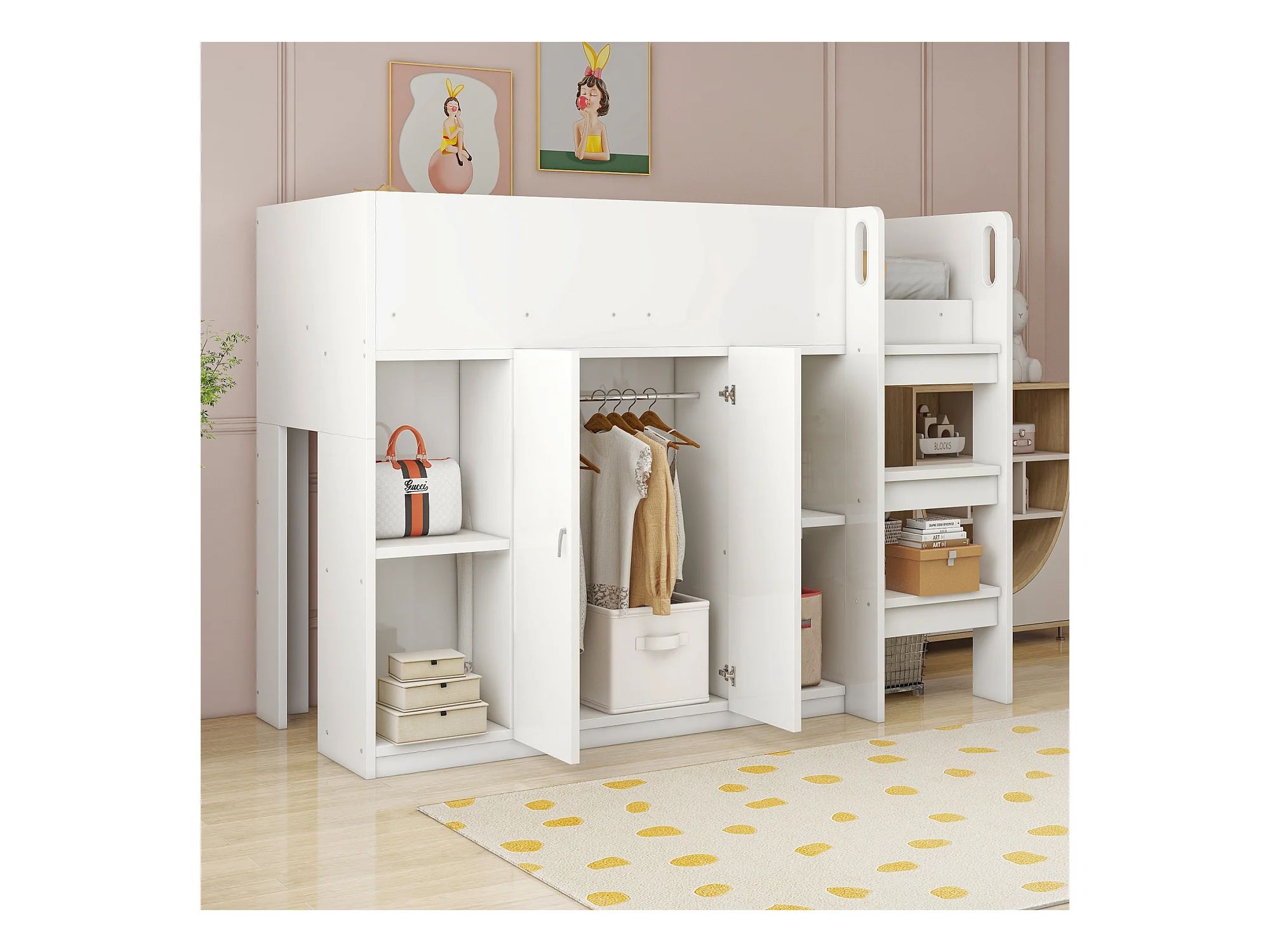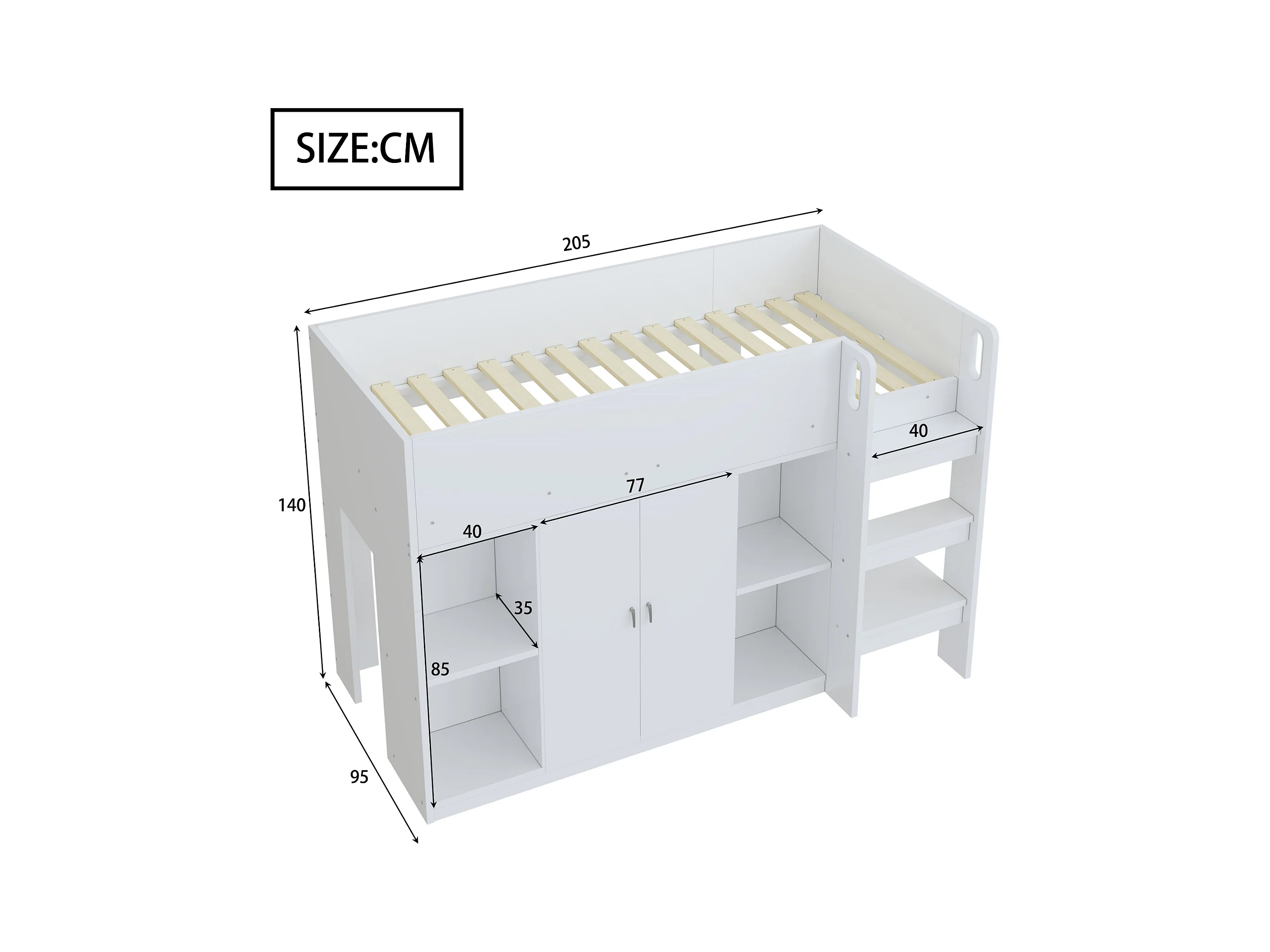 Lit superposé multifonctionnel en bois massif 90x200 cm avec échelle, rangement, placard et étagères, Blanc (205x95x140 cm)