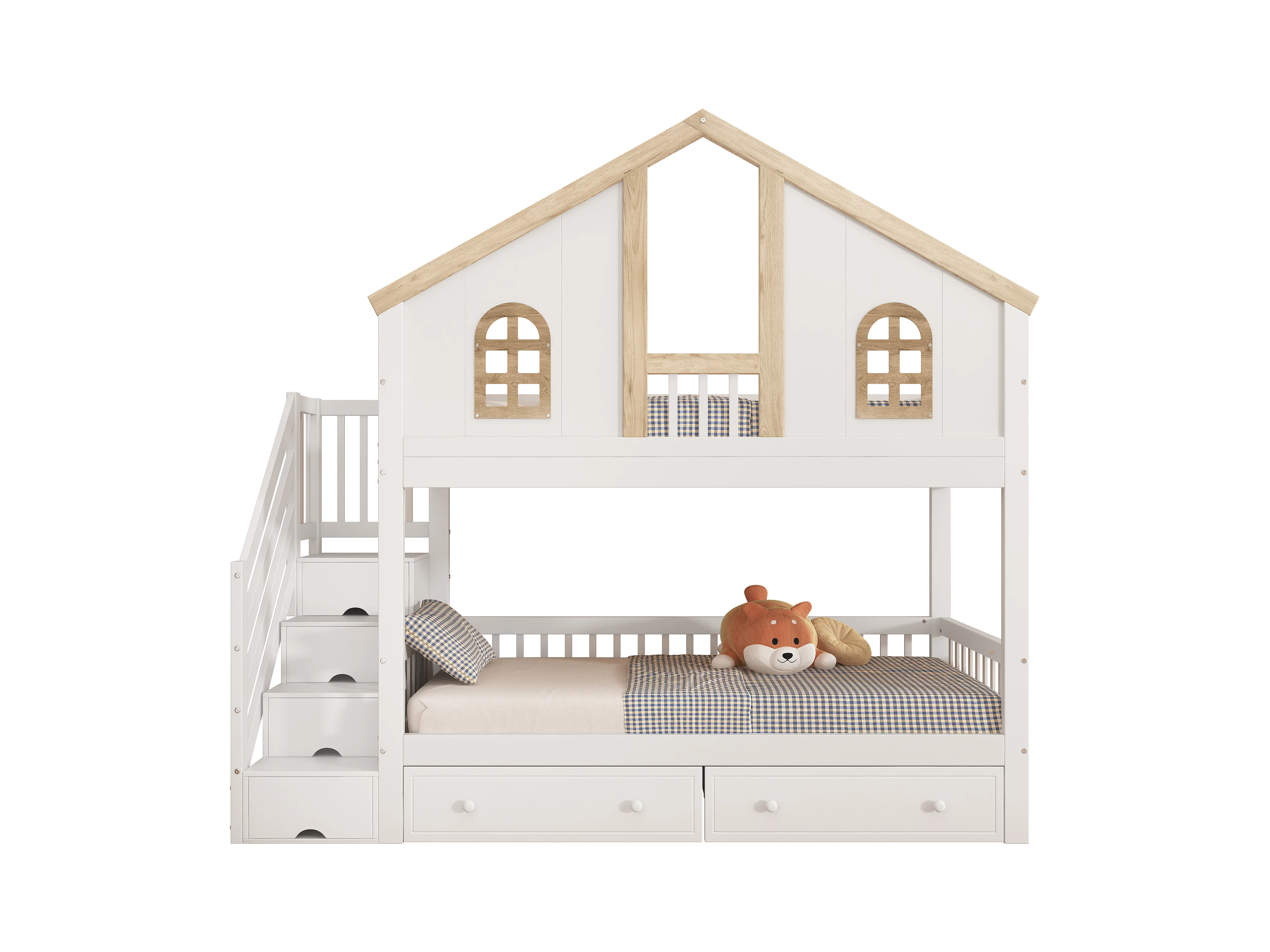 Lit superposé pour enfant - 2 x 90 x 200 cm - avec fenêtre + 2 tiroirs + 4 rangements dans l'escalier - pin + MDF - blanc + naturel