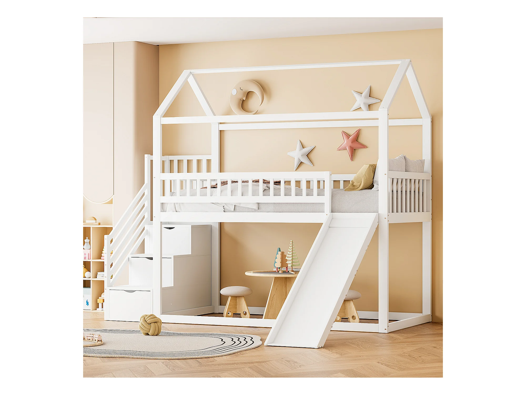 Lit superposé pour enfants 90x200 cm, lit mezzanine avec toboggan et échelle de rangement, haute barrière, cadre en bois massif, blanc