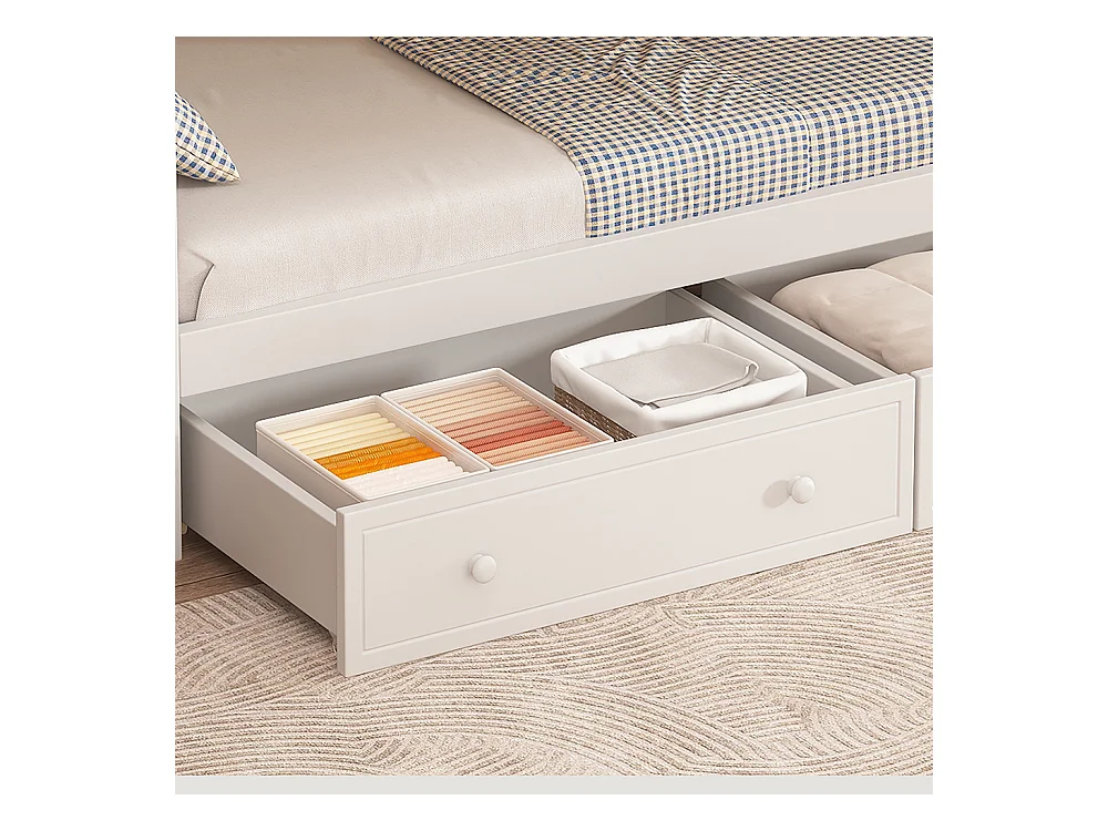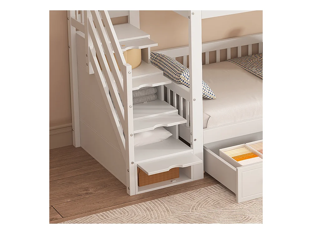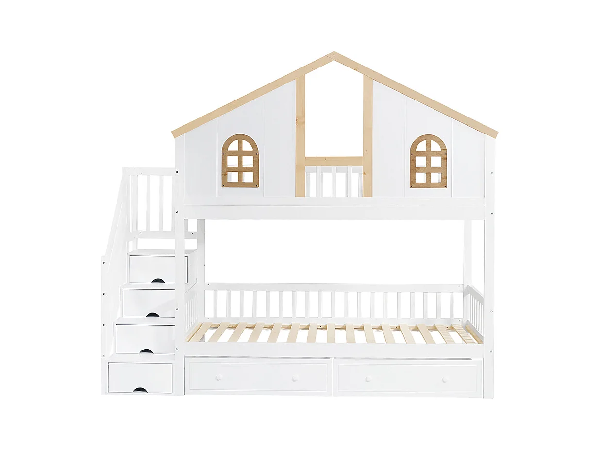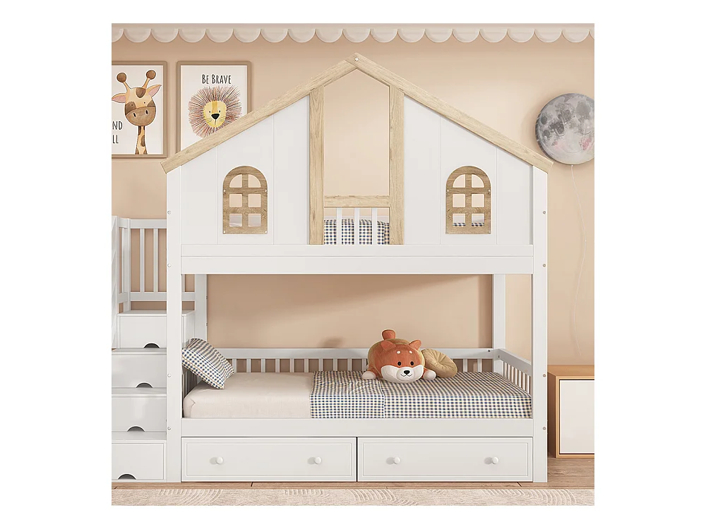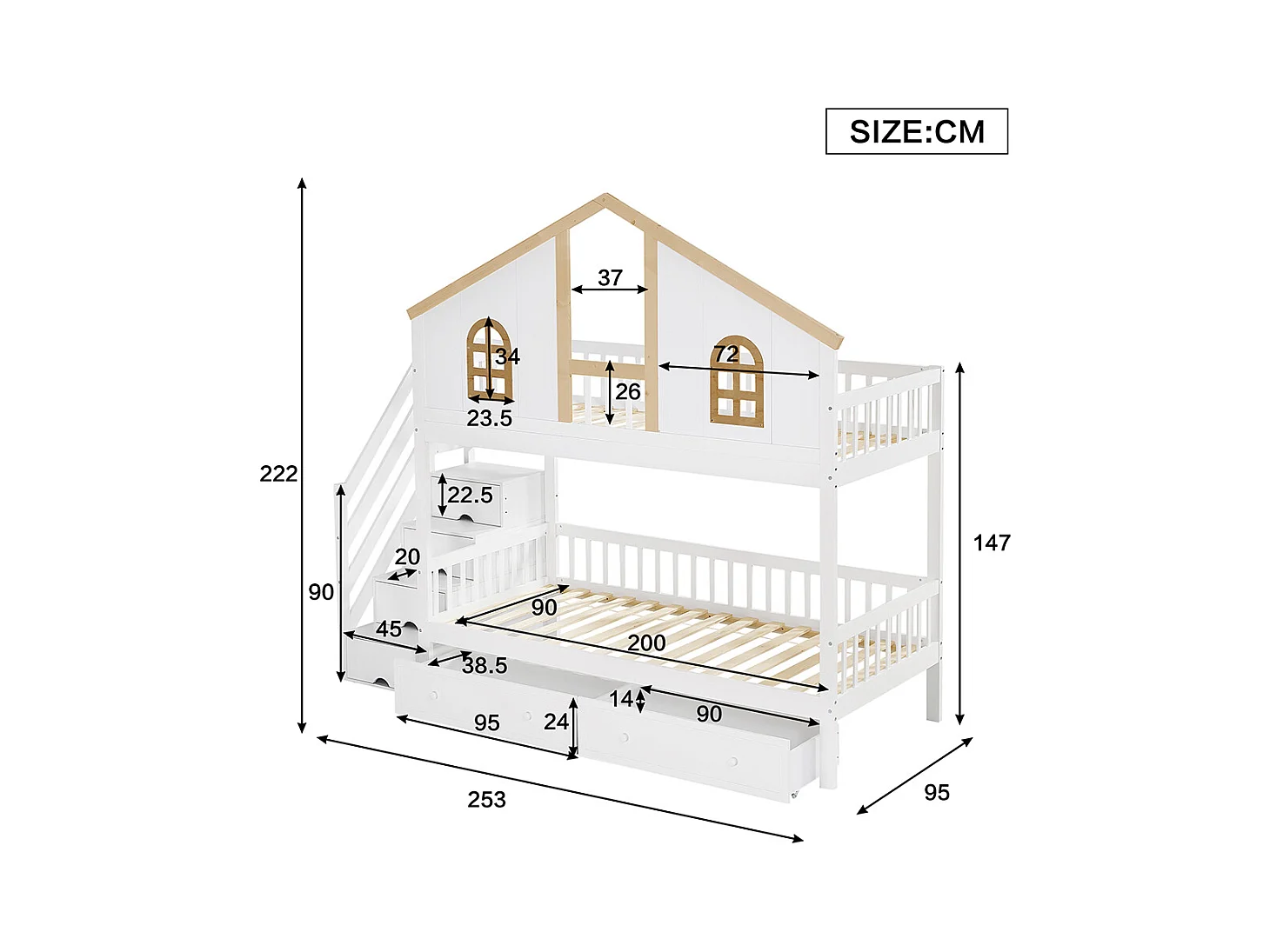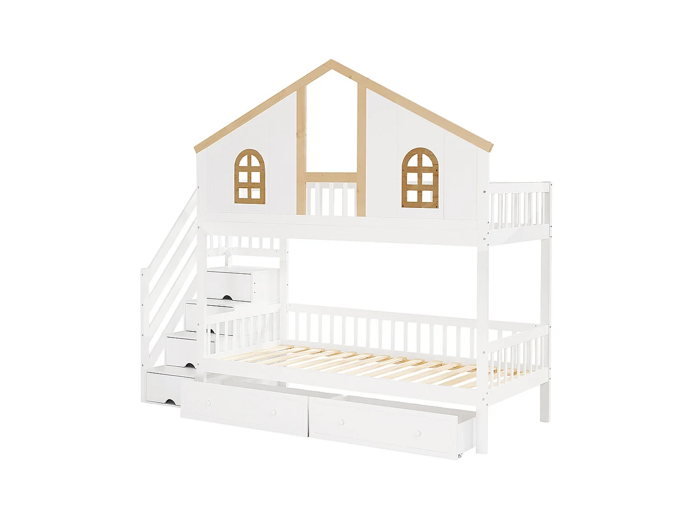 Lit superposé pour enfants avec barrières de sécurité assorties, fenêtre, deux tiroirs sur roulettes, échelle inclinée, blanc + naturel, 90x200 cm