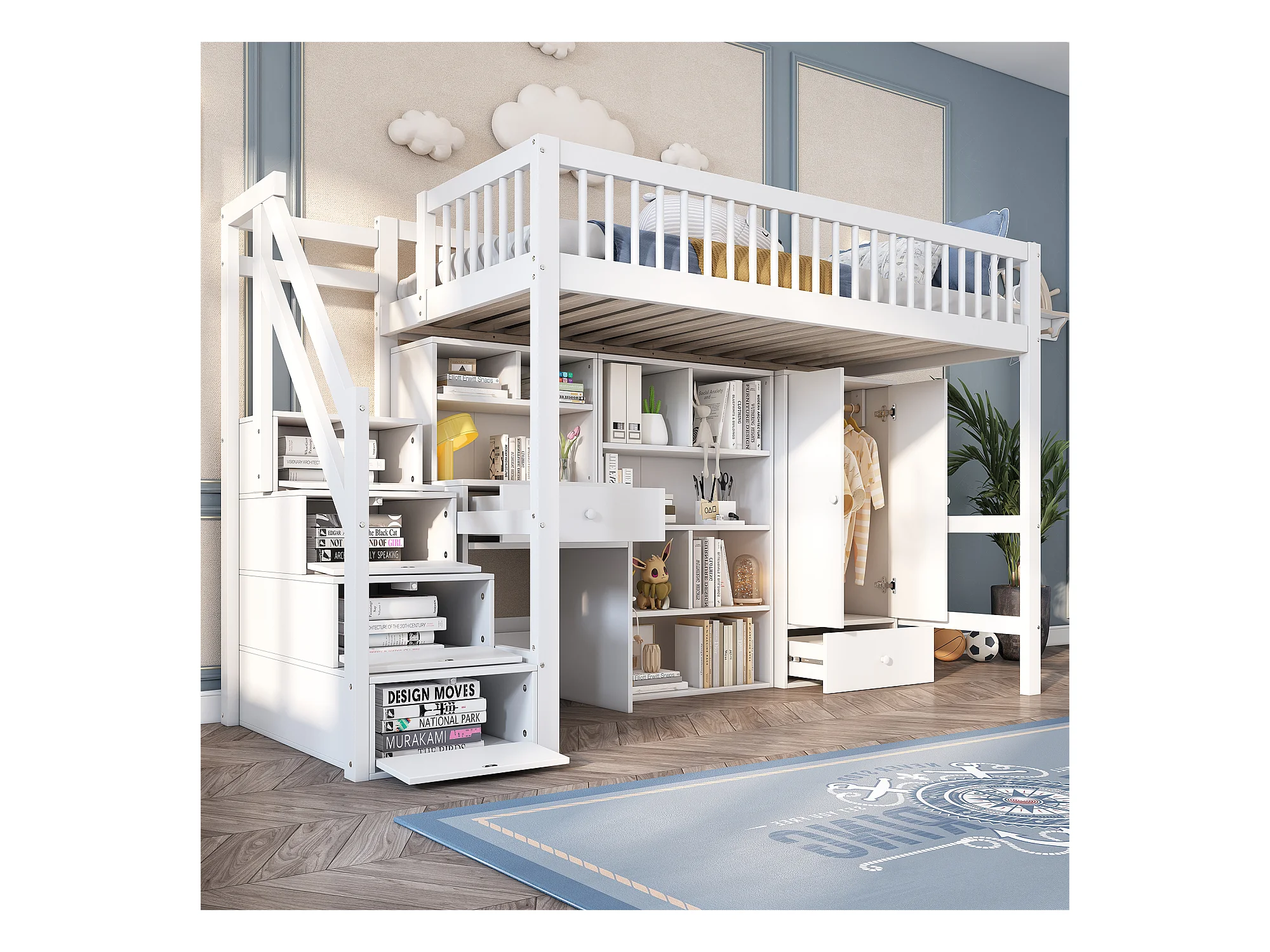 Lit superposé pour enfants, avec bureau, rangement, étagères et penderie, bois massif et MDF, blanc (90x200 cm)