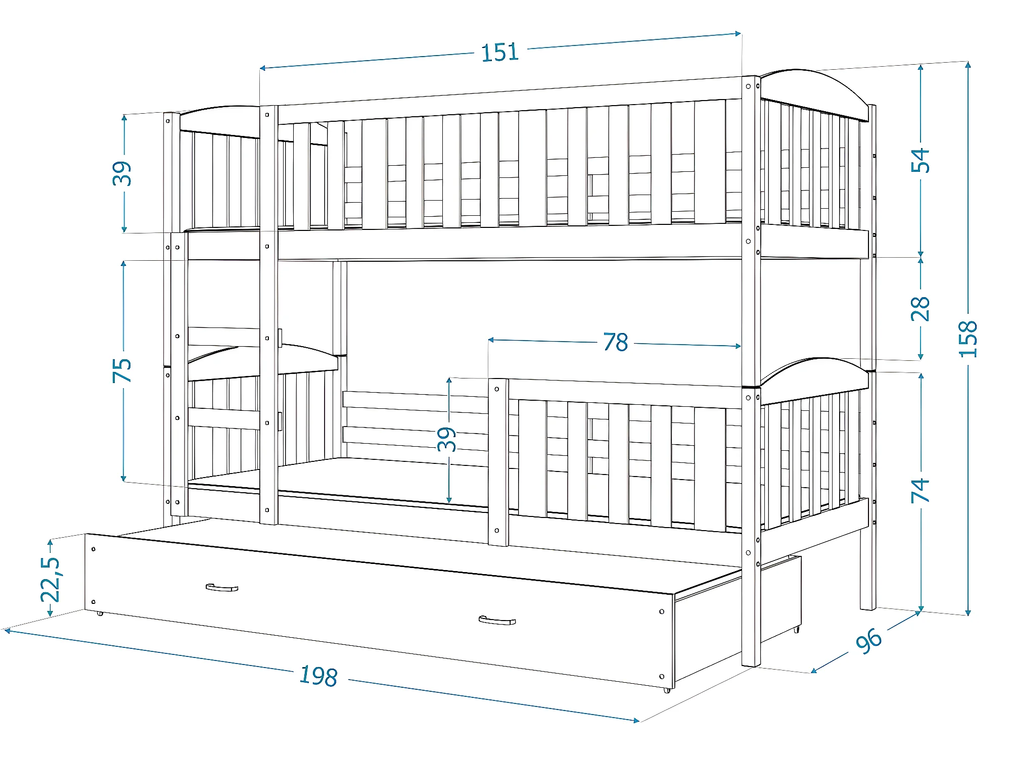 Lit Superposé Teo 90x190 Pin - rose Livré avec sommiers, tiroir et matelas en mousse de 7cm