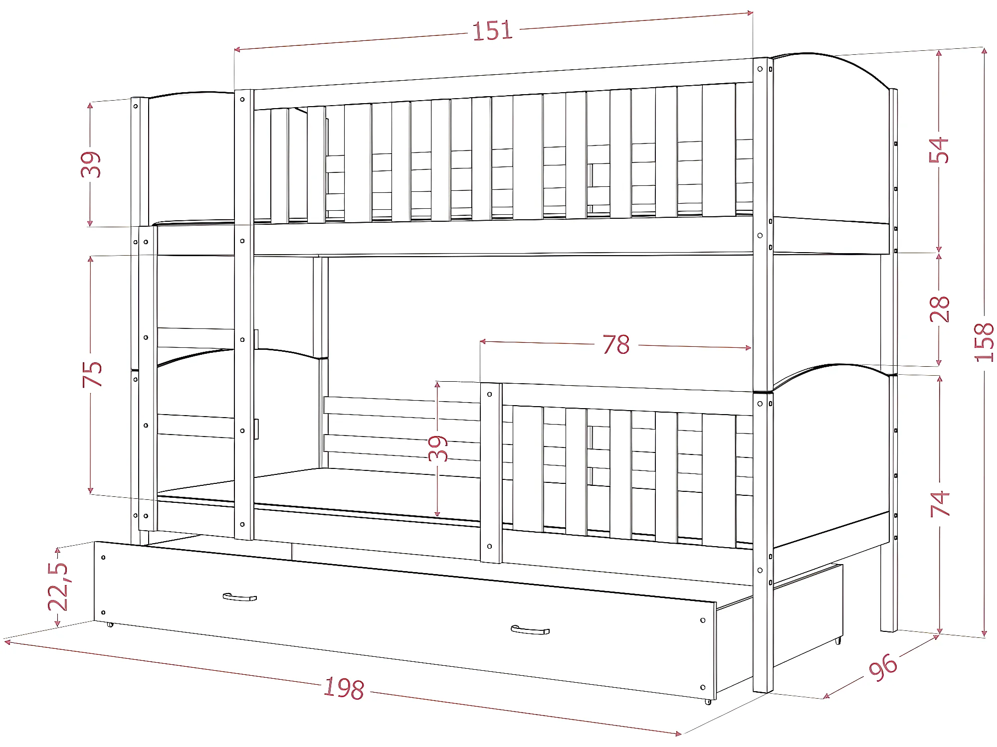 Lit Superposé Tomy 90x190 Gris - rose Livré avec sommiers, tiroir et matelas en mousse de 7cm