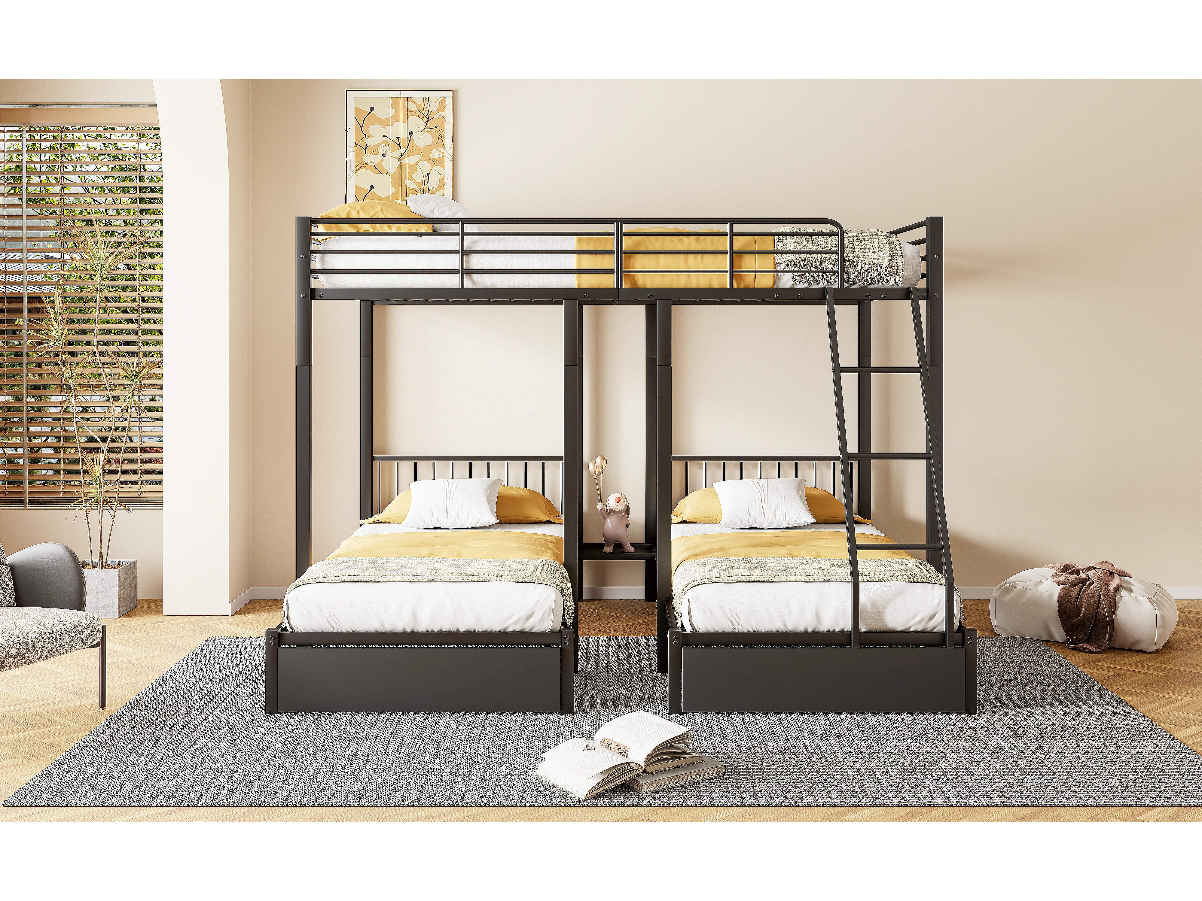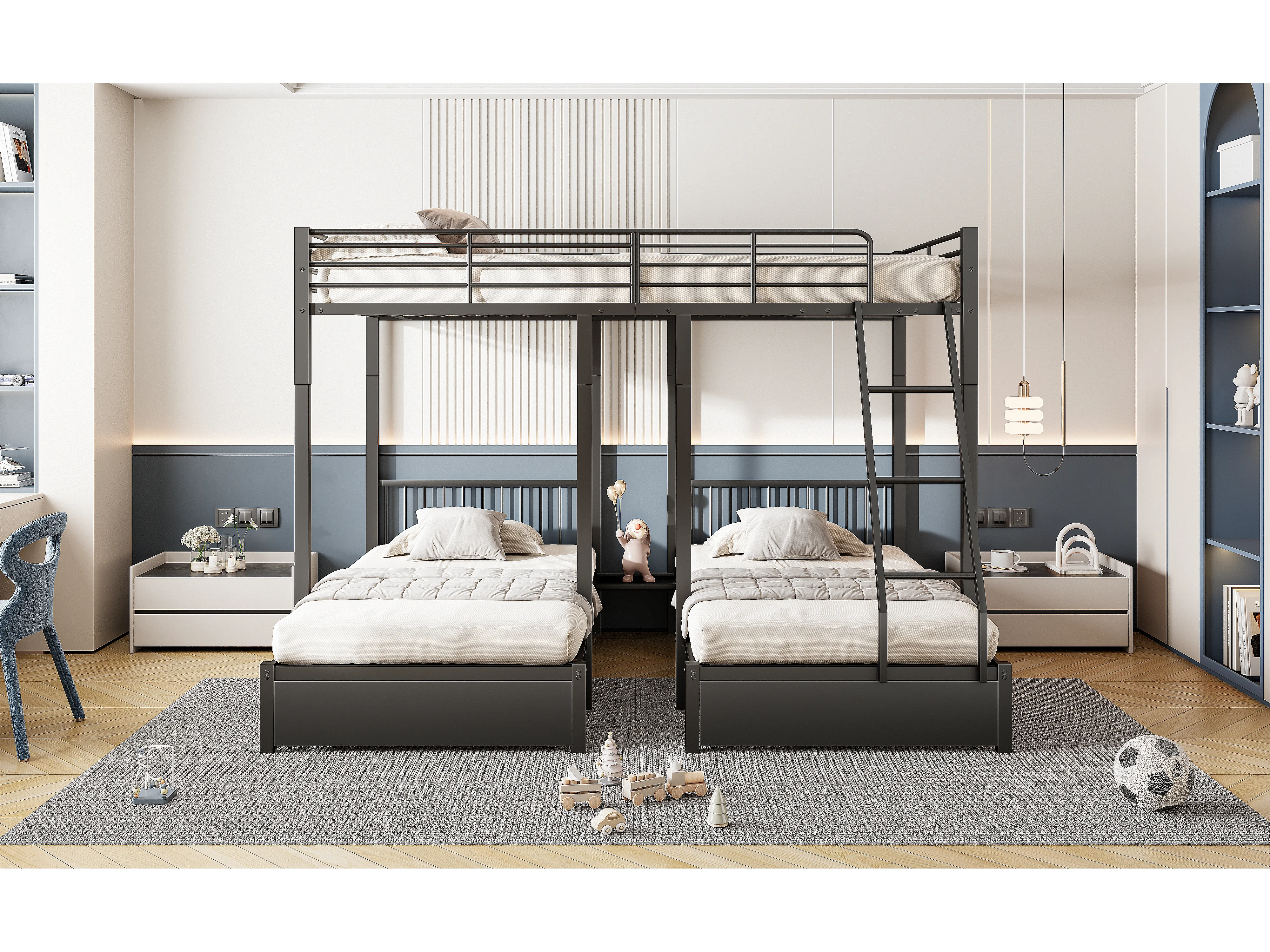 Lit superposé triple avec tiroirs, cadre métallique modulable en lit double 140x200 et deux lits simples 90x200, multifonctionnel, noir (246x206x177.8cm)