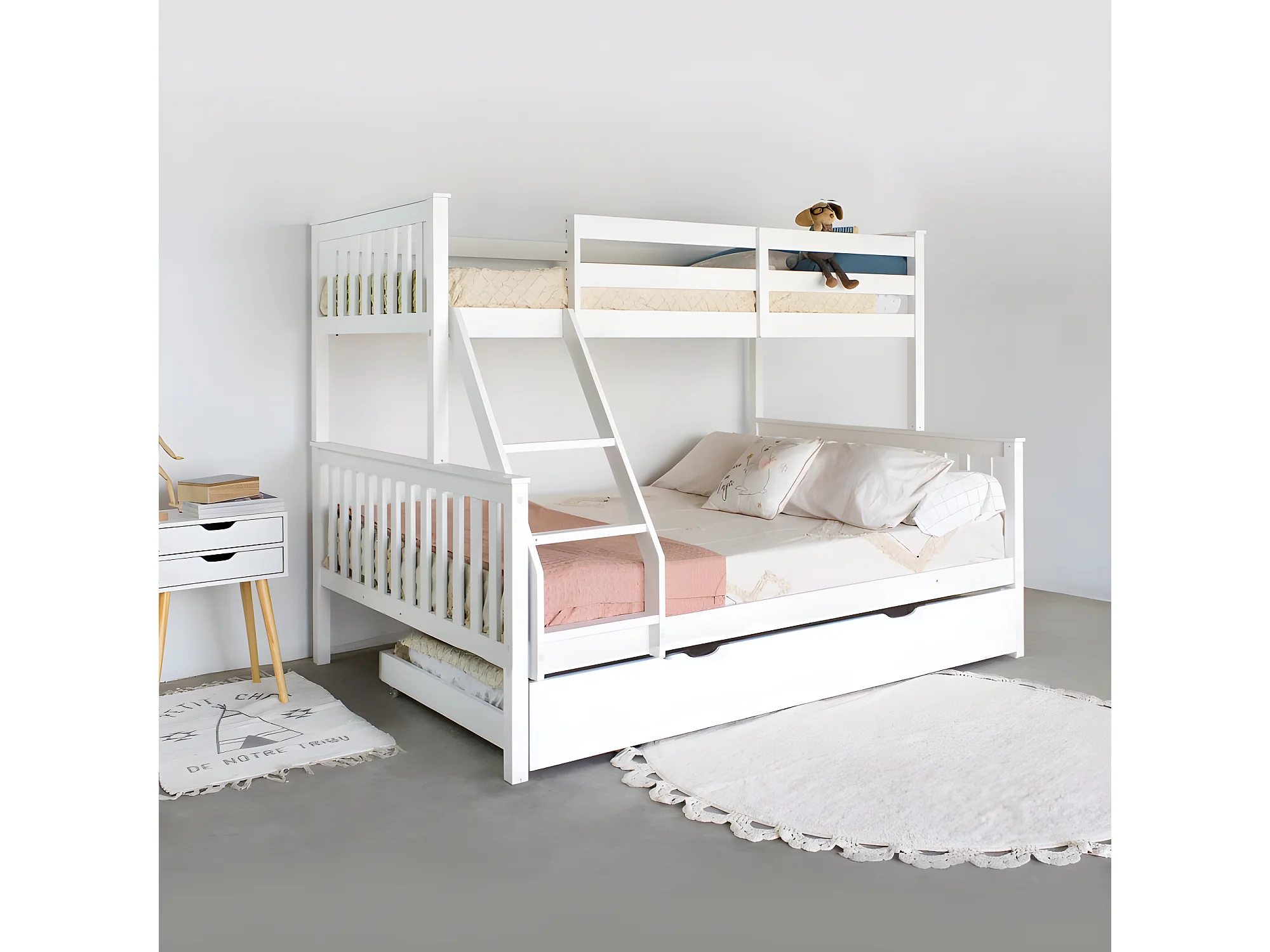 Lit superposé triple + lit tiroir bois blanc 135 cm