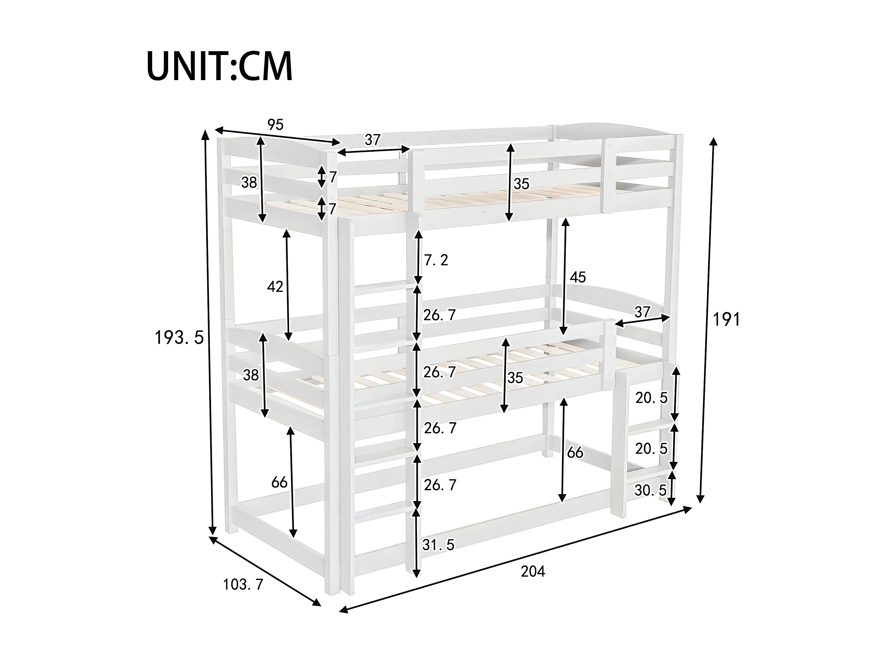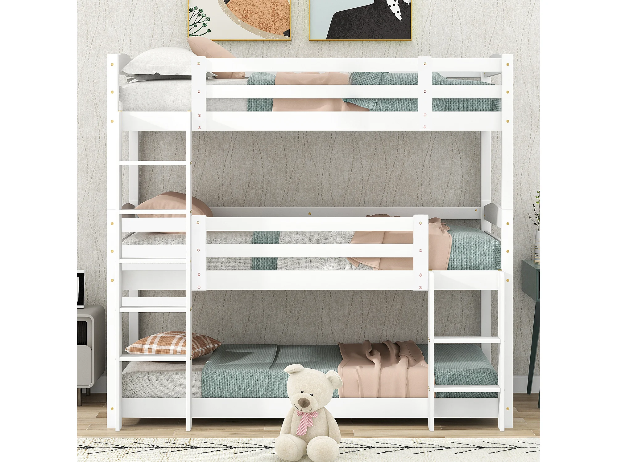 Lit superposés 3 places pour enfant - 3 x 90 x 200 cm - bois + MDF - blanc