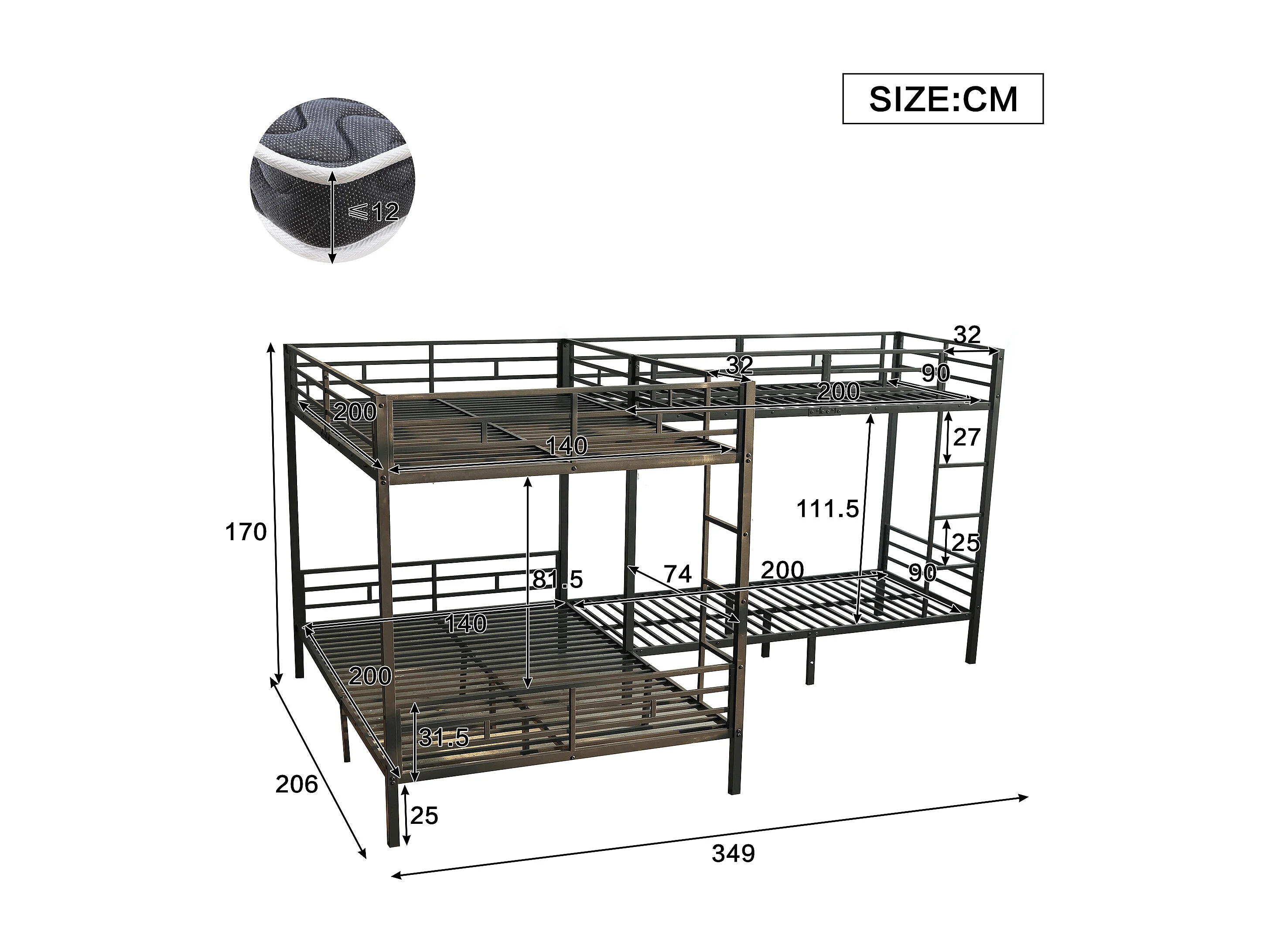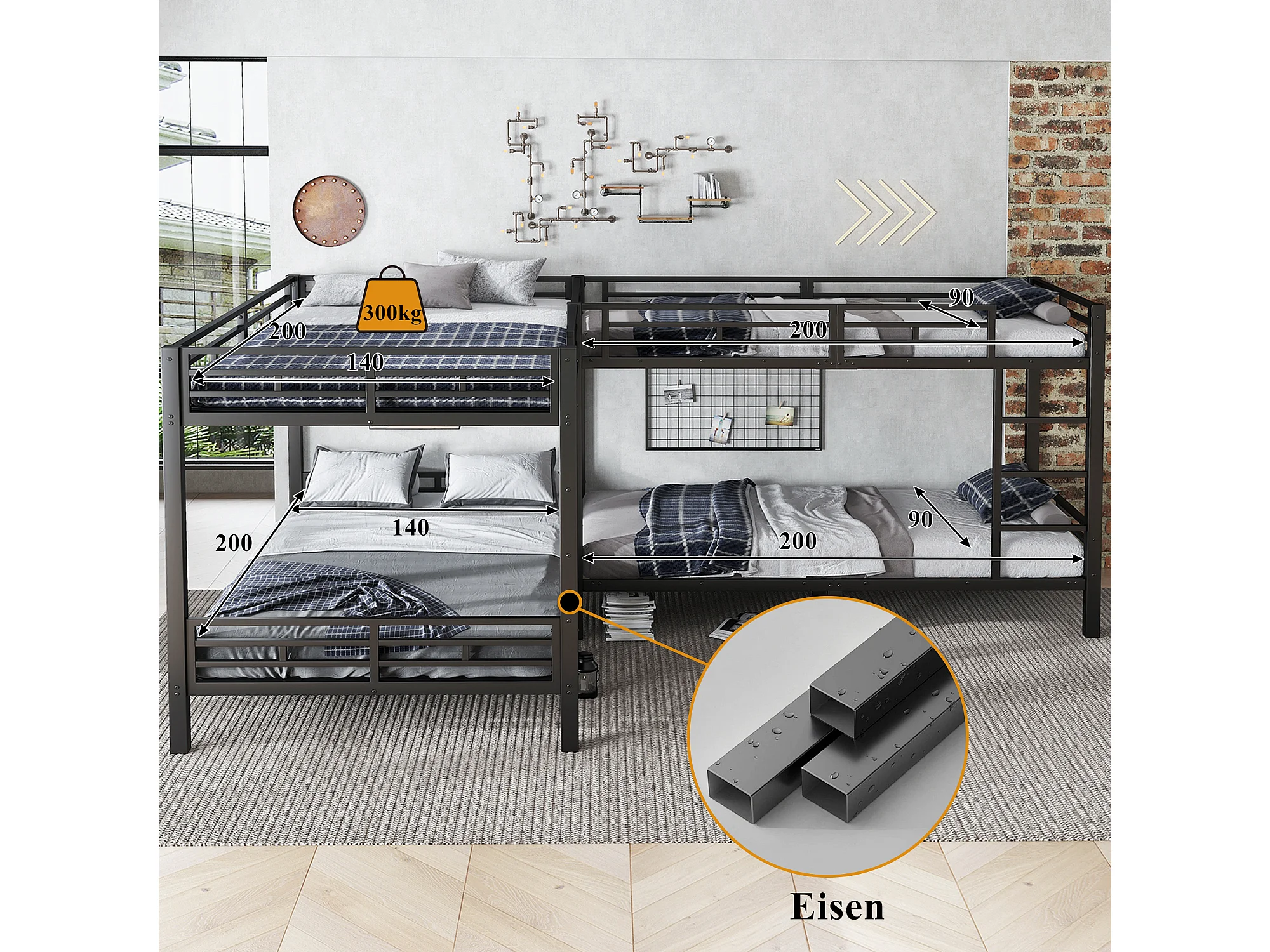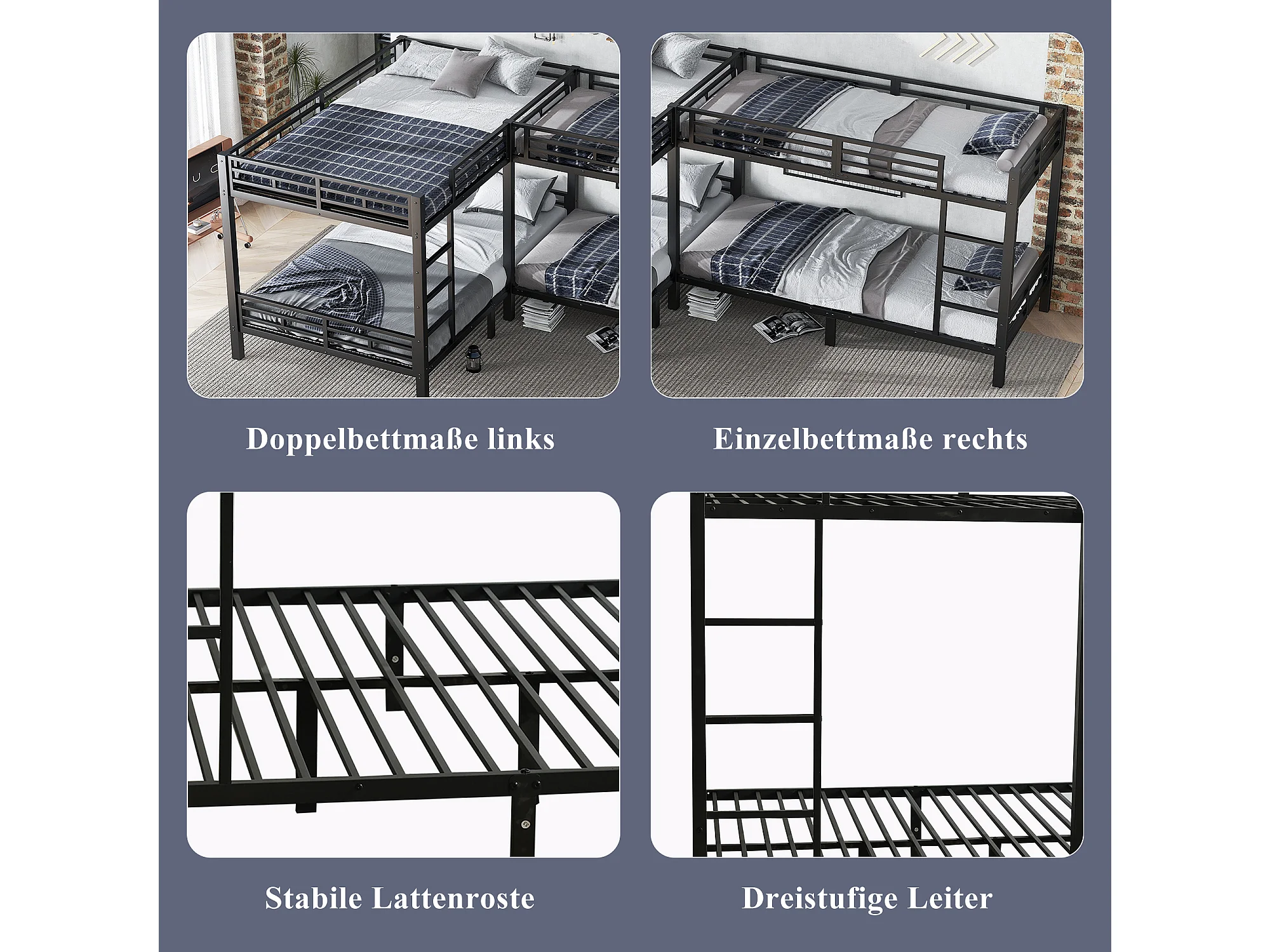 Lit superposés en fer 4 places - 90 x 200 + 140 x 200 cm - avec échelle + sommier à lattes - métal - noir
