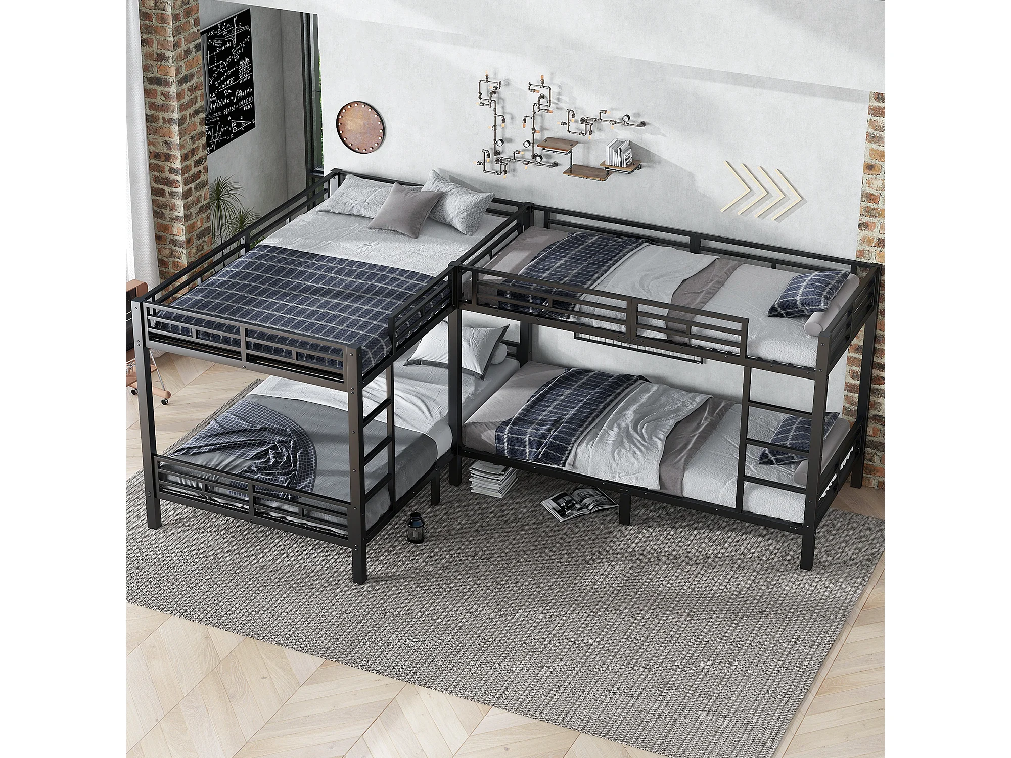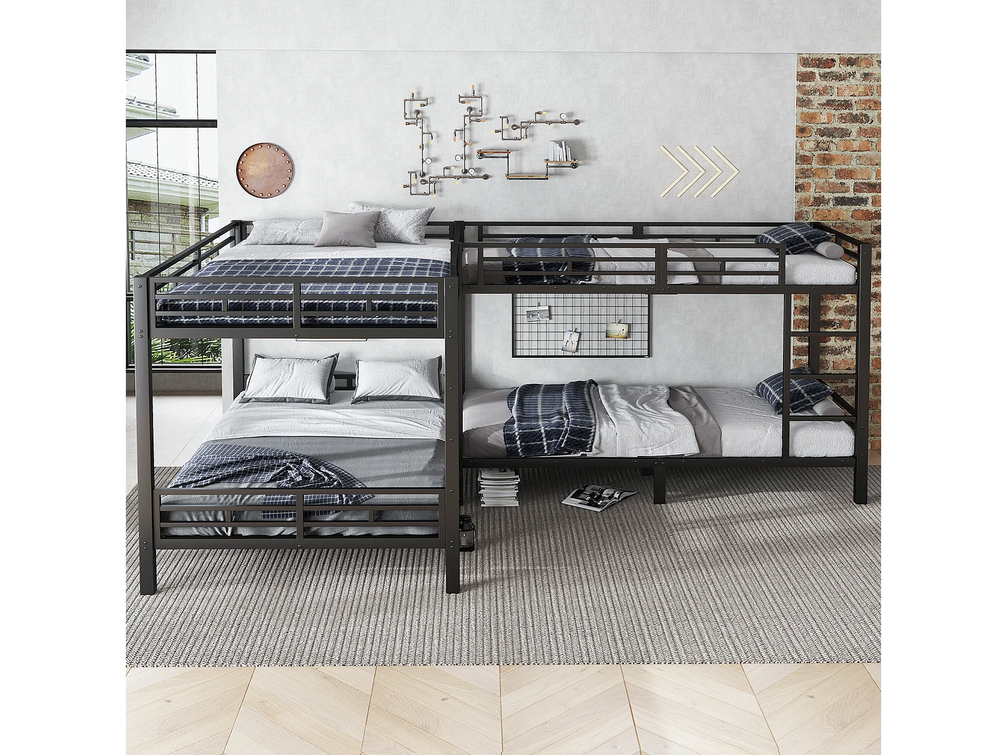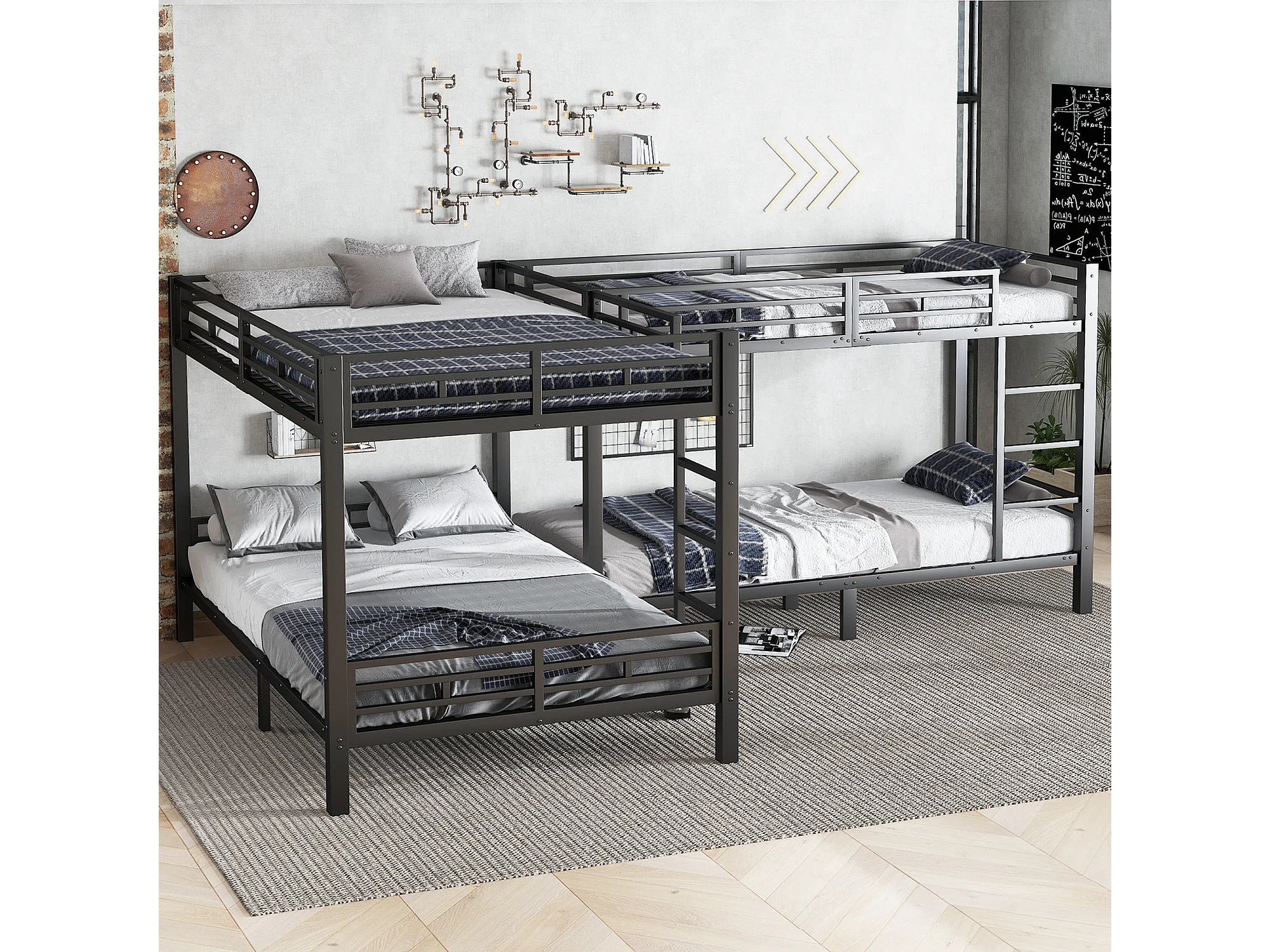 Lit superposés en fer 4 places - 90 x 200 + 140 x 200 cm - avec échelle + sommier à lattes - métal - noir