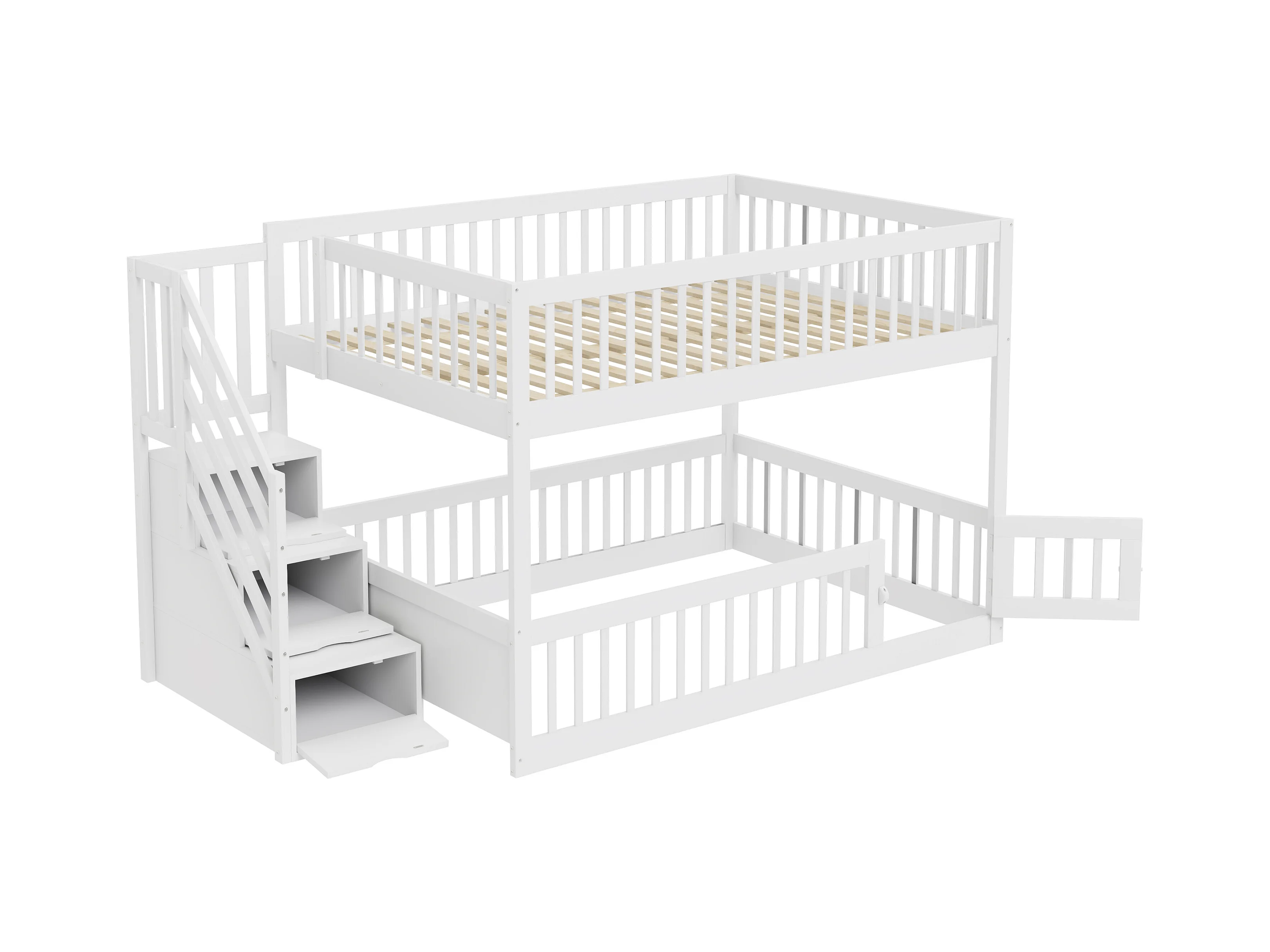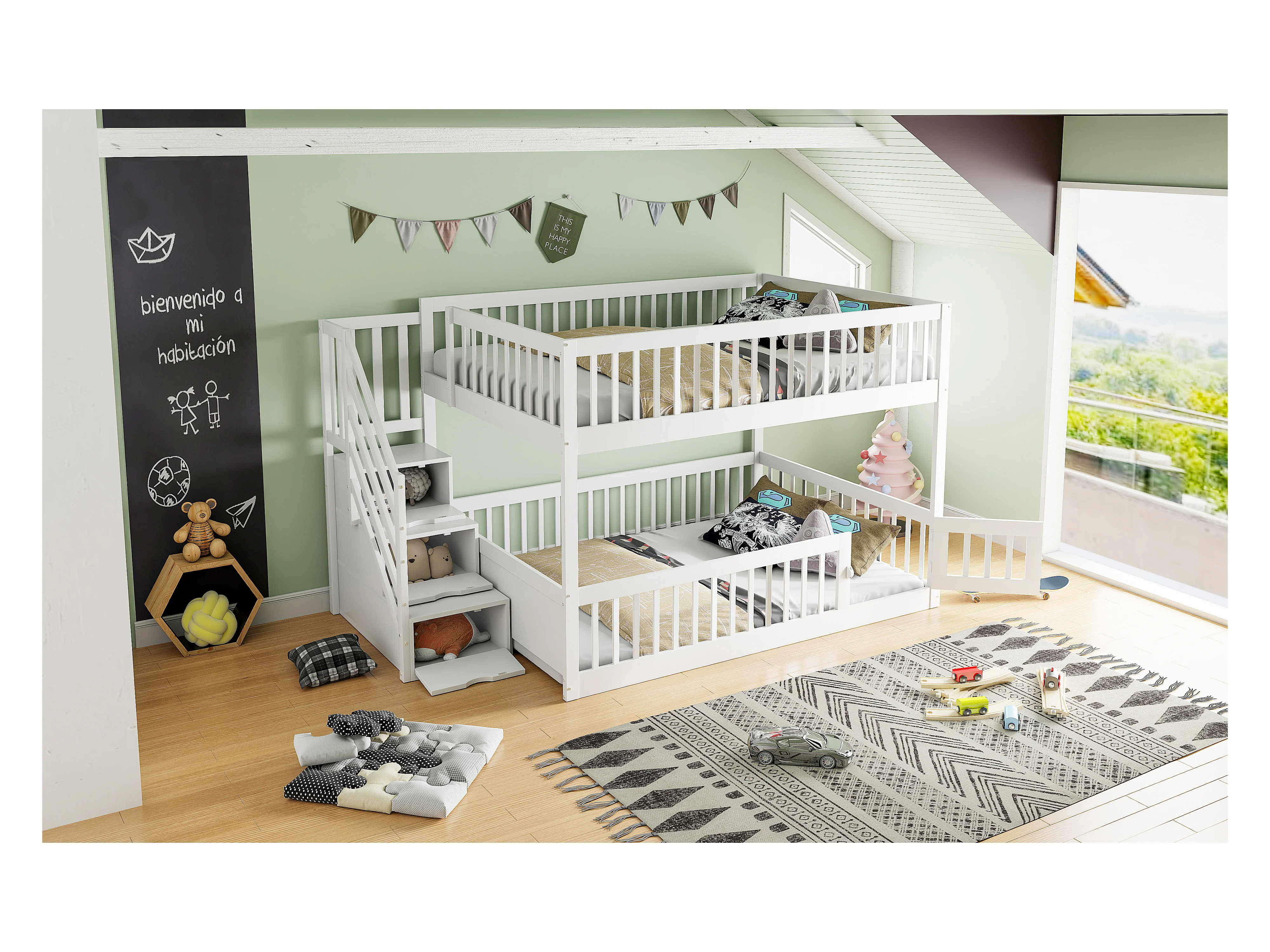 Lit superposés enfant - 2 x 140 x 200 - avec escalier de rangement + barrières - bois - blanc