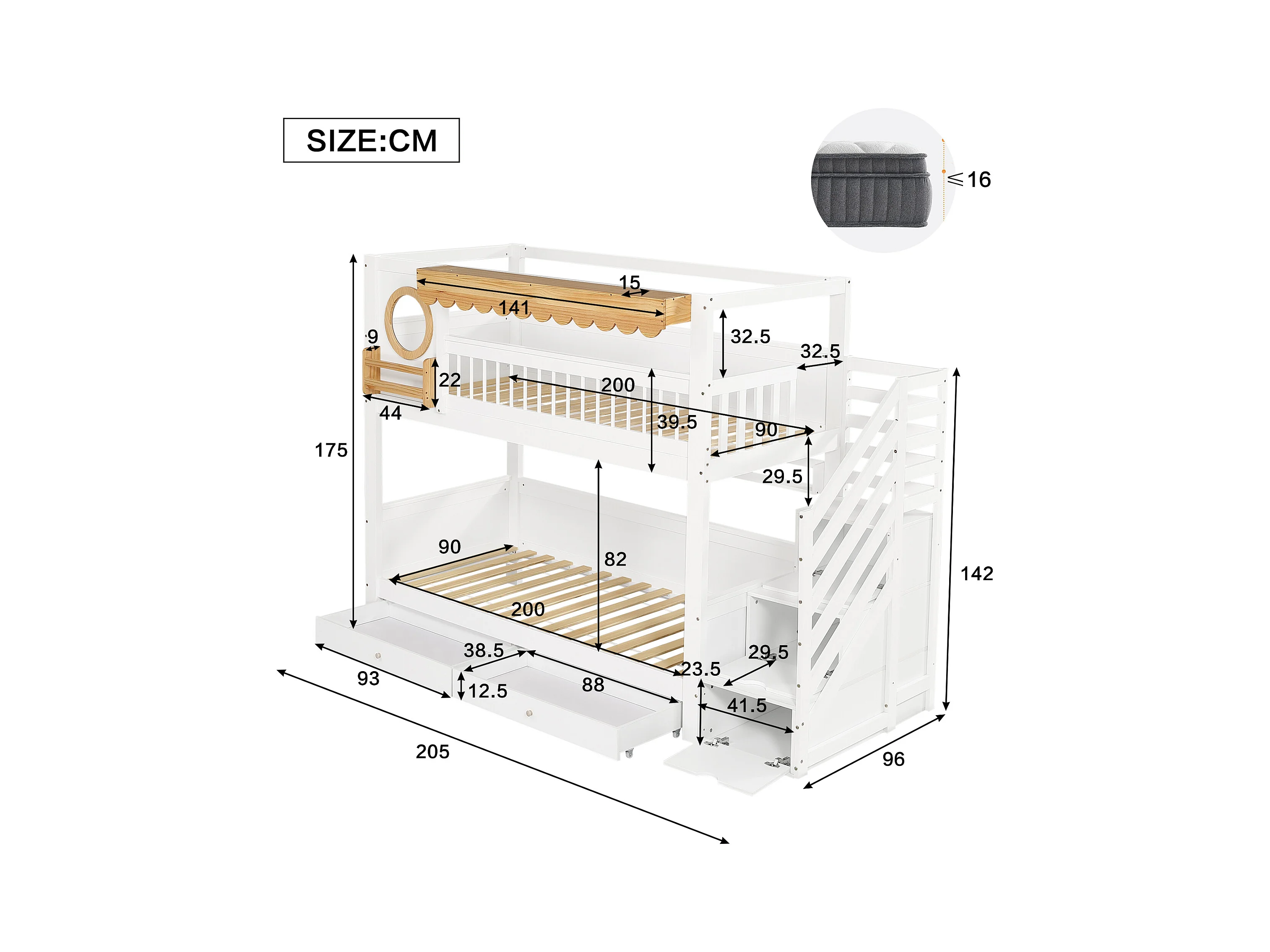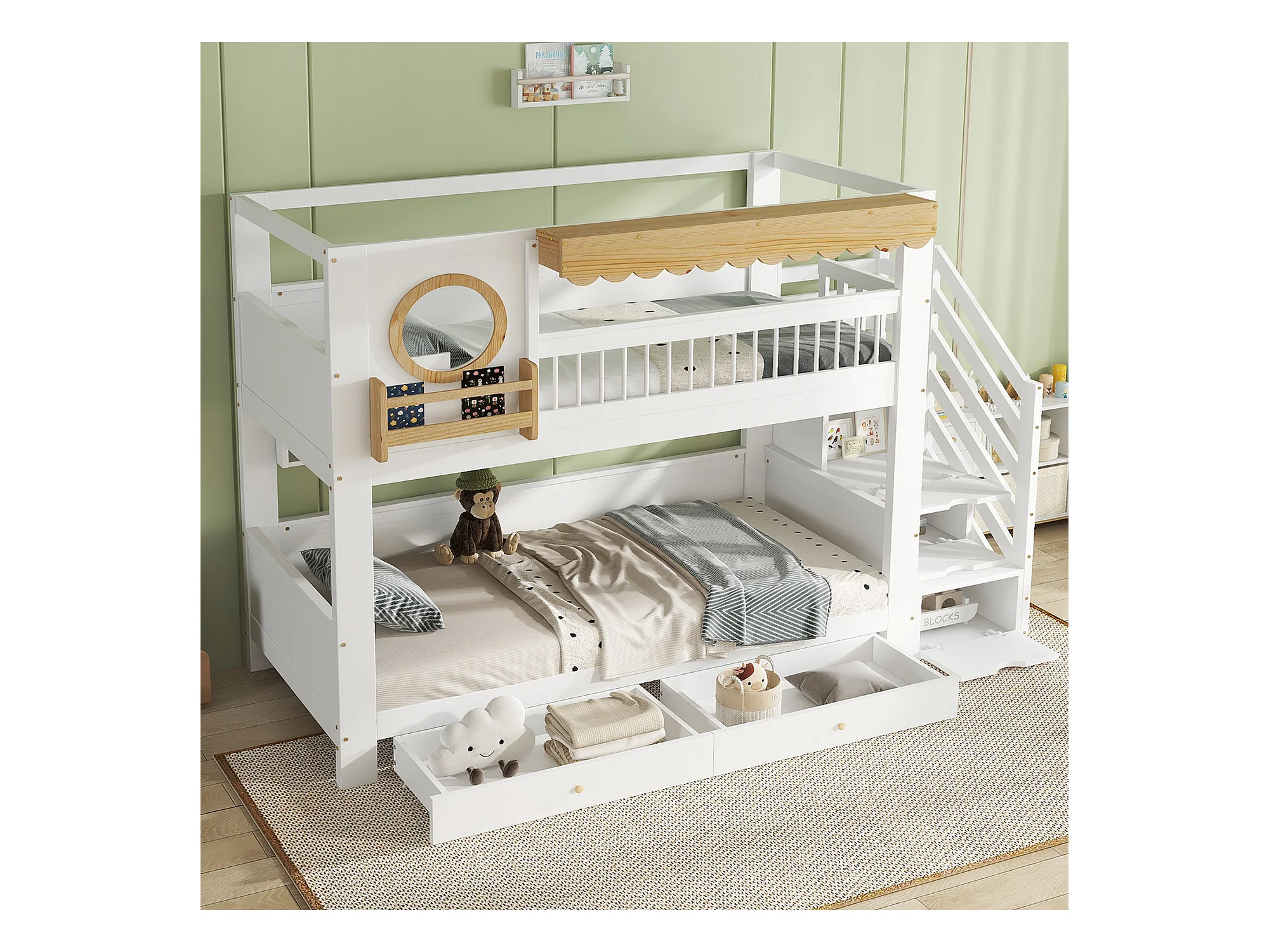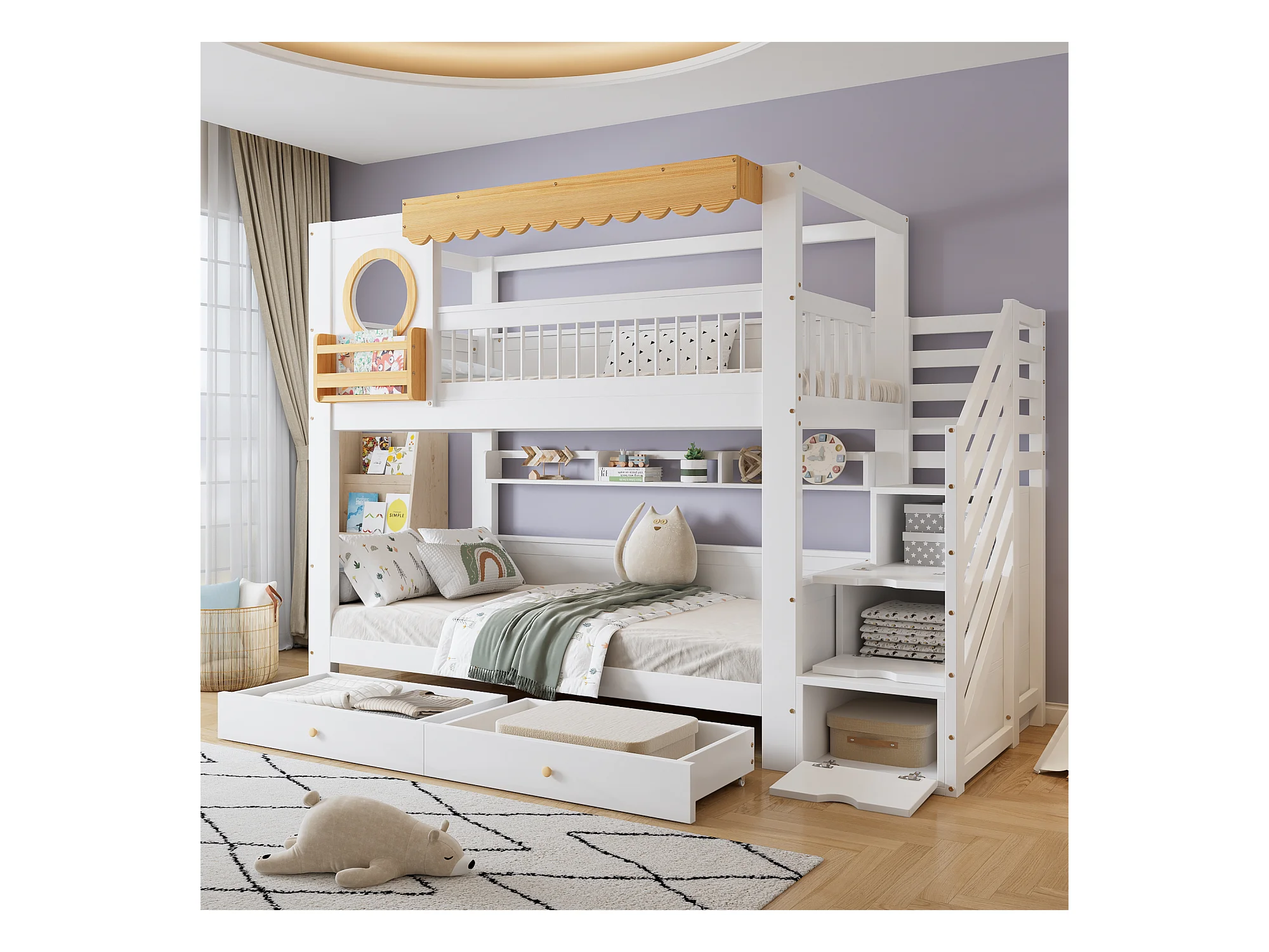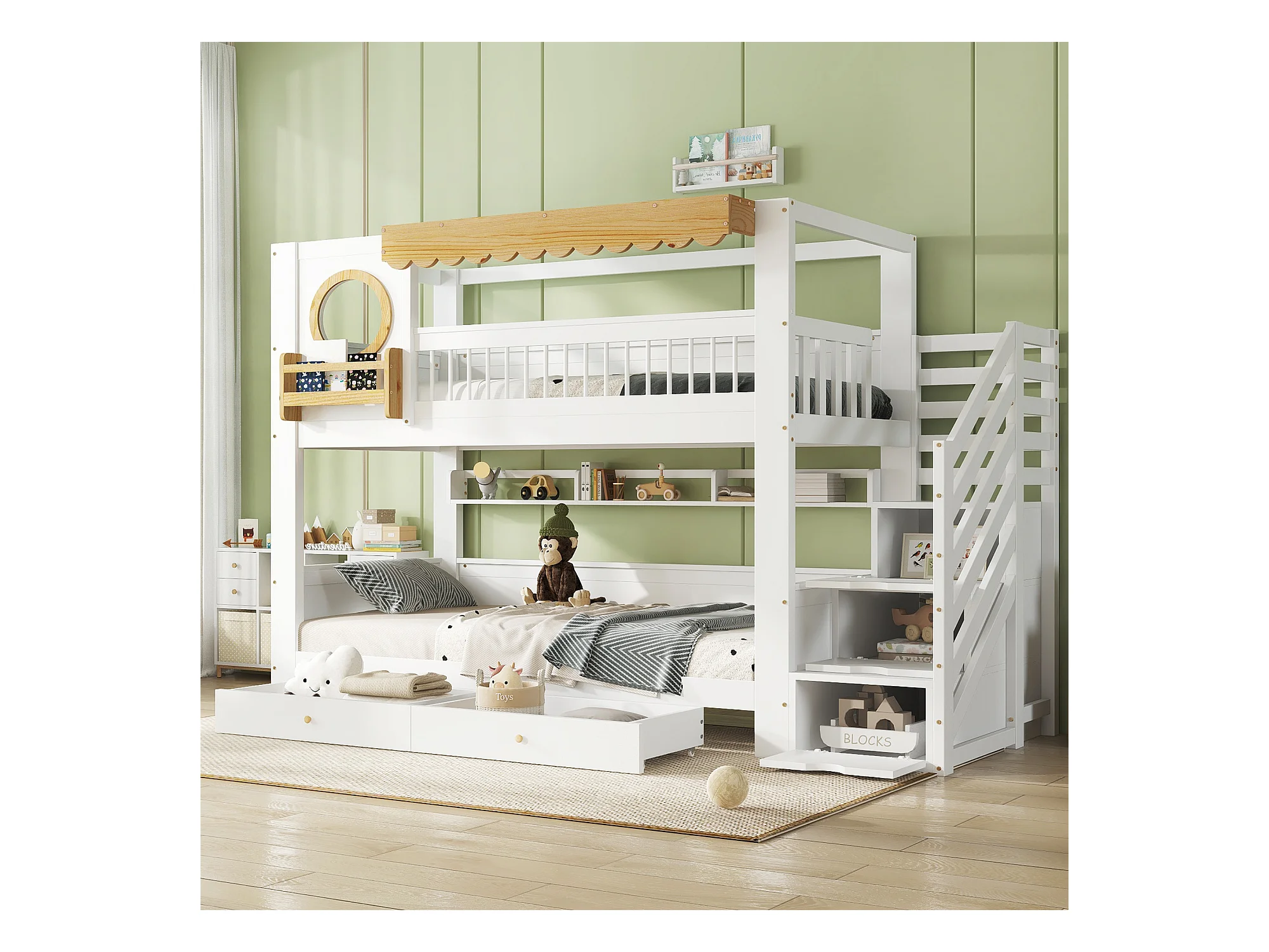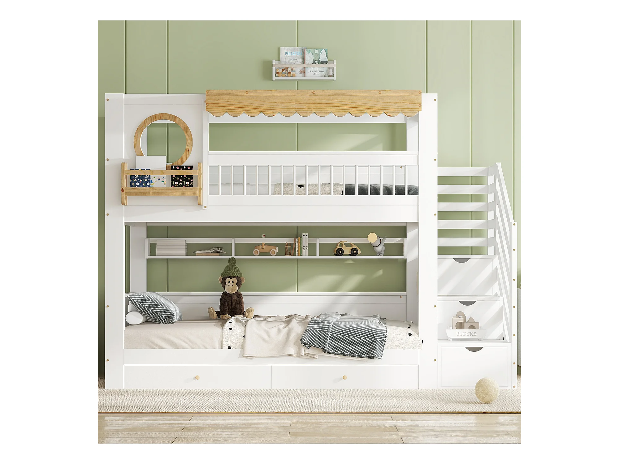 Lit superposés enfant - 2 x 90 x 200 cm - avec 2 tiroirs + escalier de rangement - pin + MDF - blanc + naturel