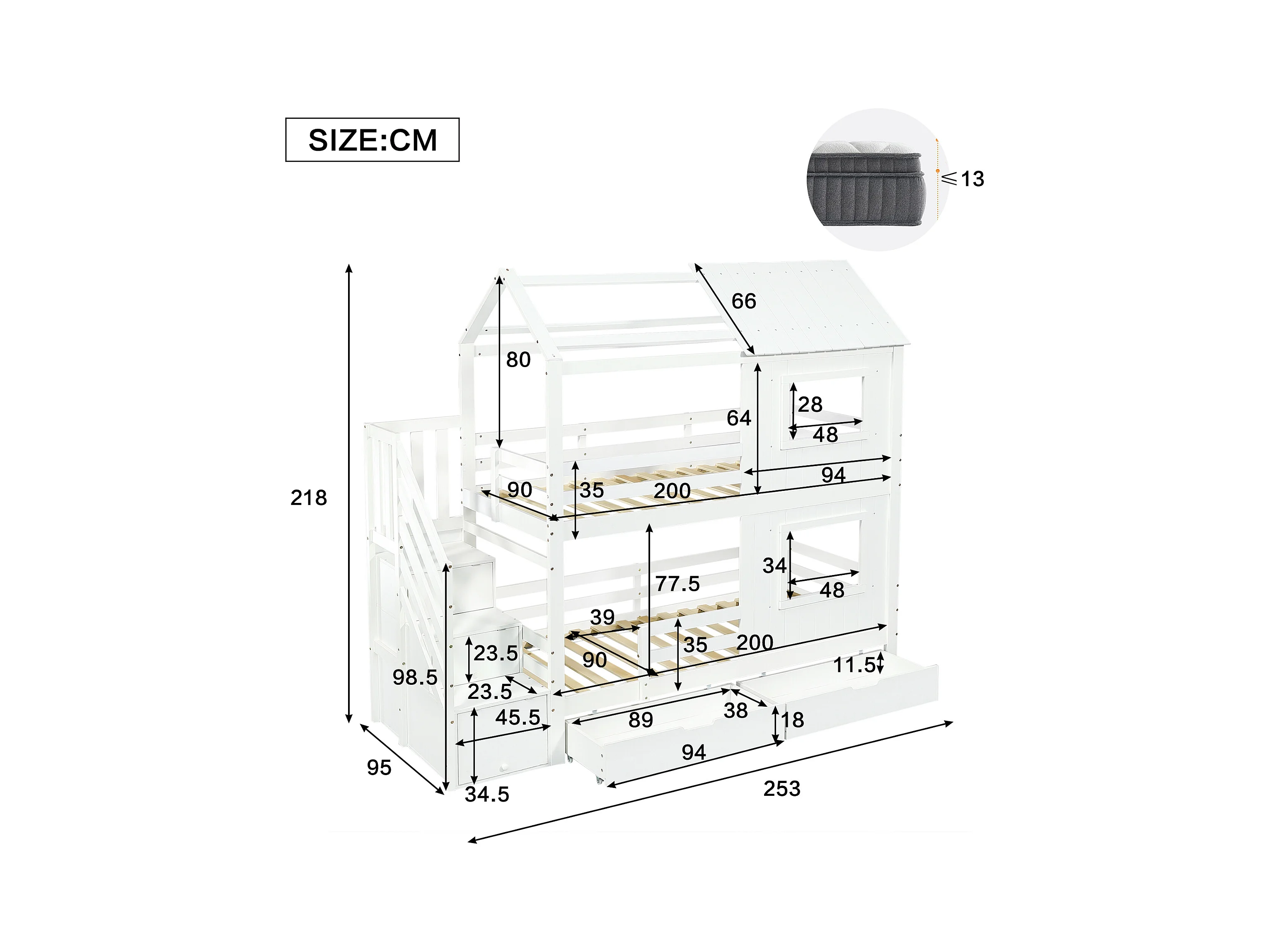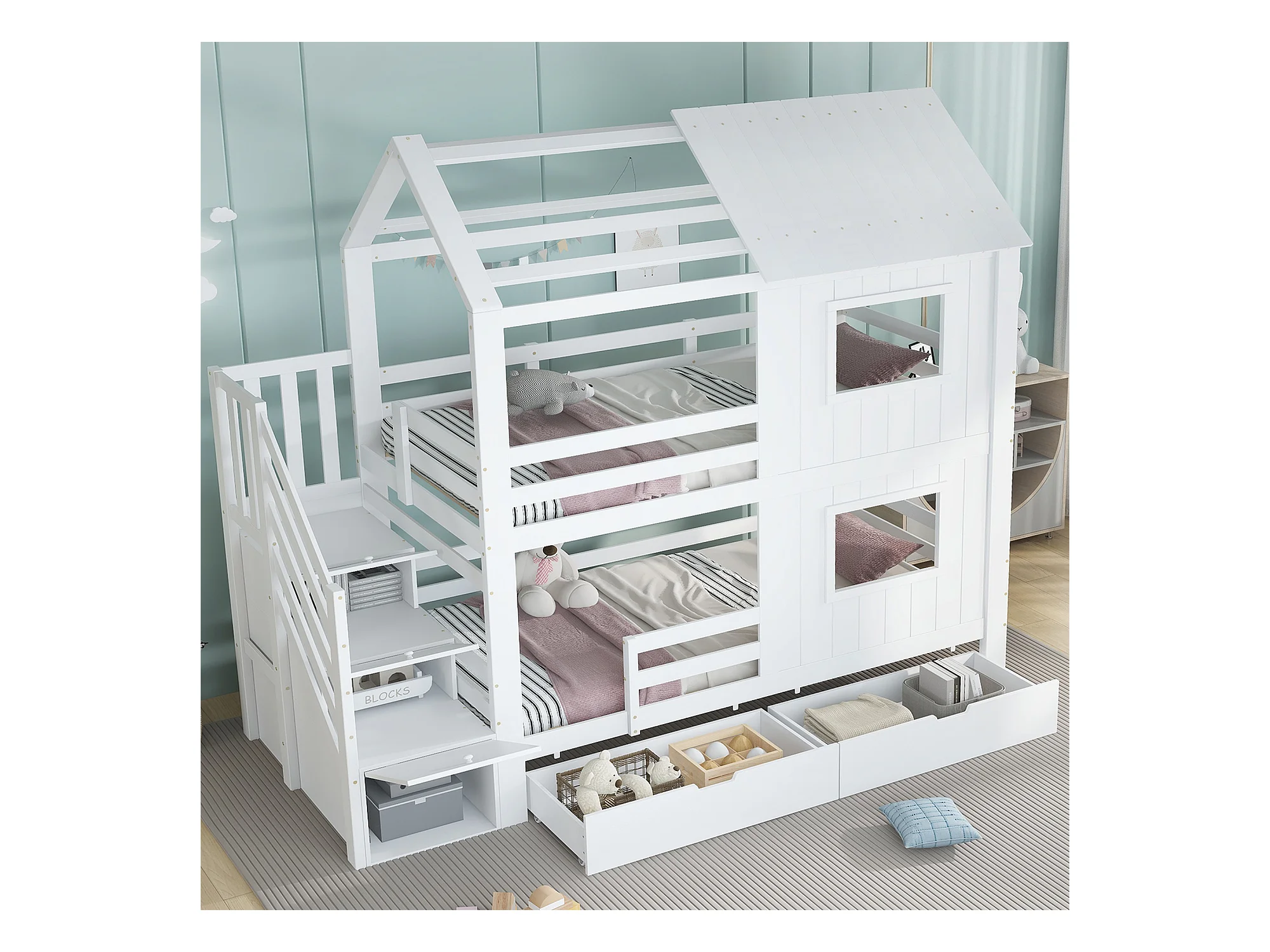 Lit superposés enfant - 2 x 90 x 200 cm - avec escalier de rangement + 2 tiroirs + fenêtres et toit - pin + MDF + contreplaqué - blanc
