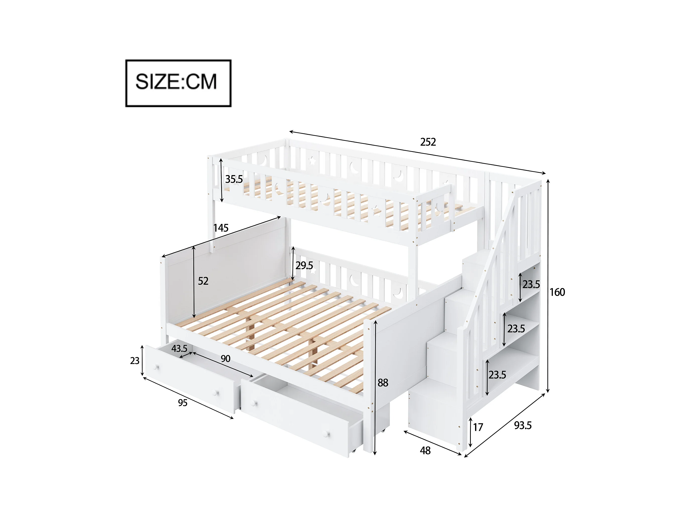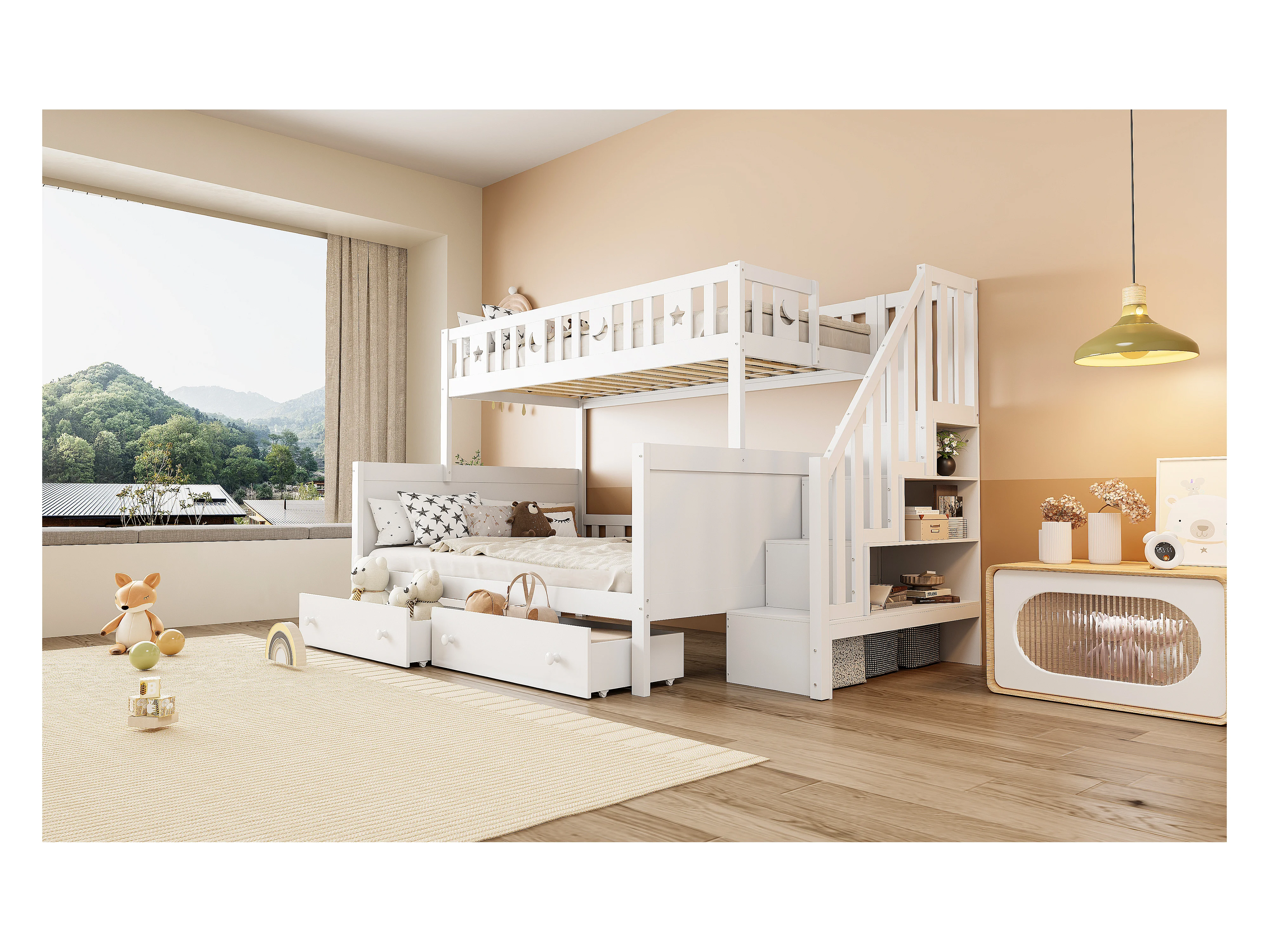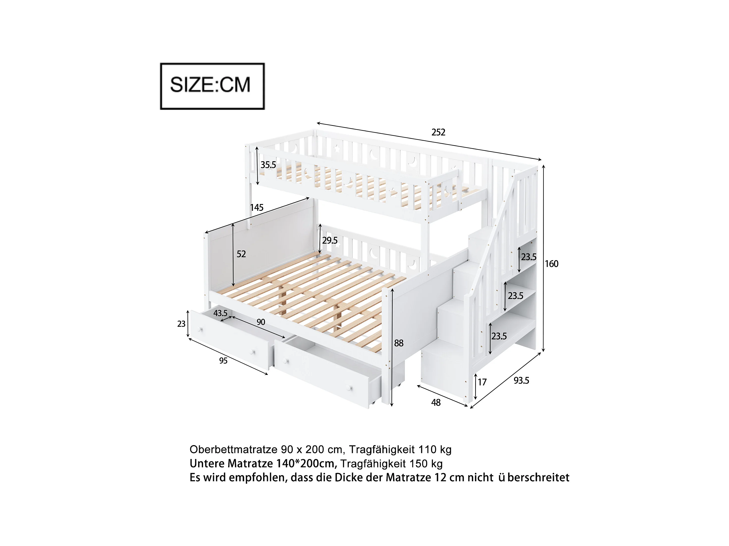 Lit superposés enfant - 90 x 200 + 140 x 200 cm - avec escalier de rangement + 2 tiroirs - bois - blanc