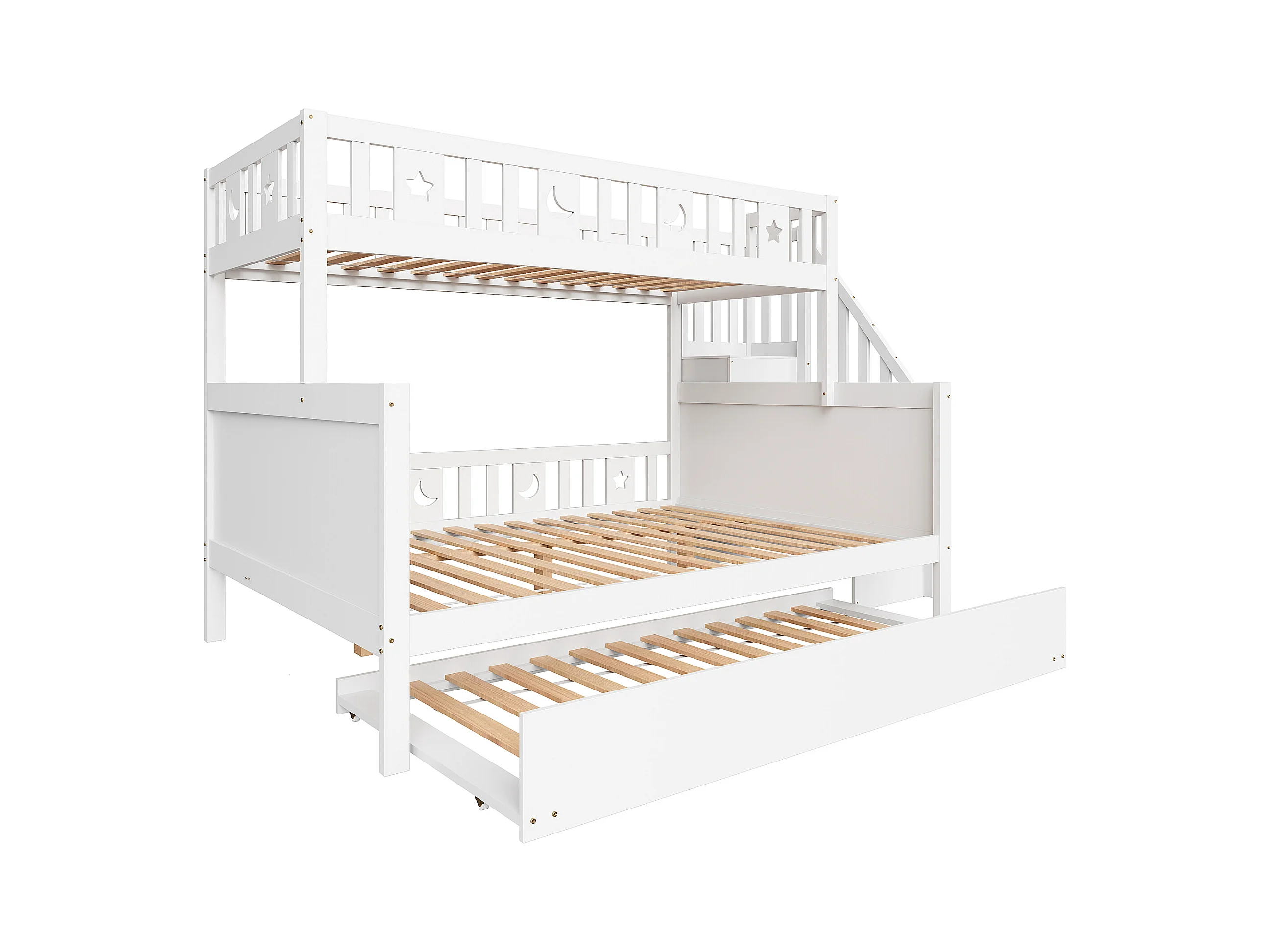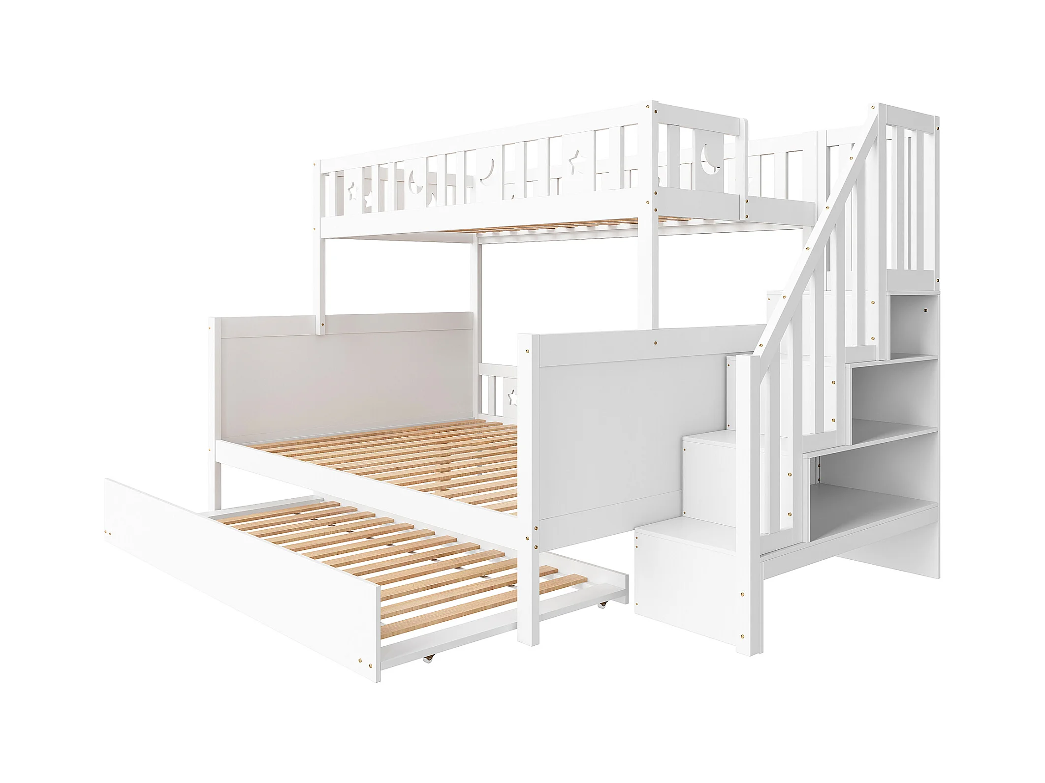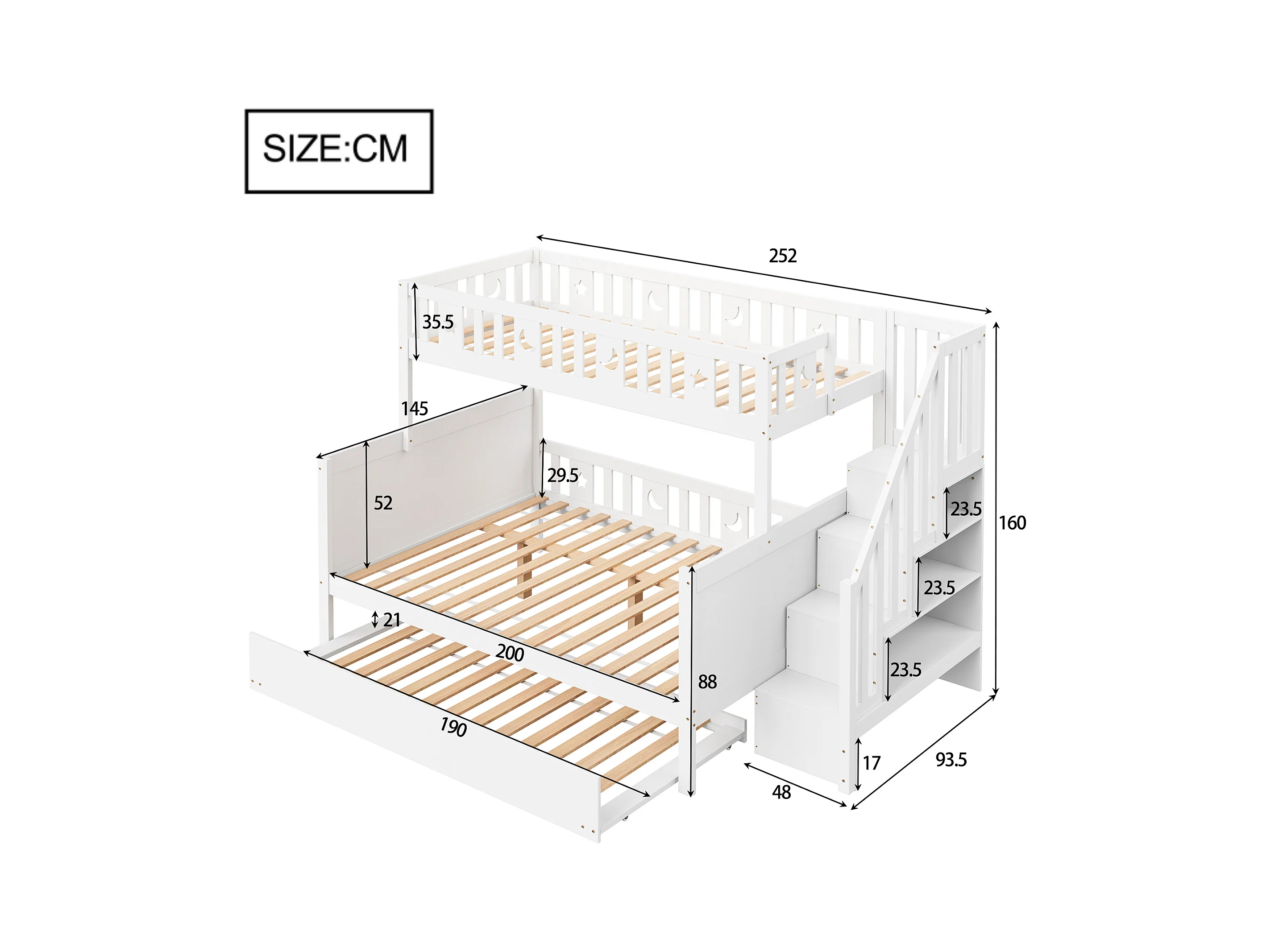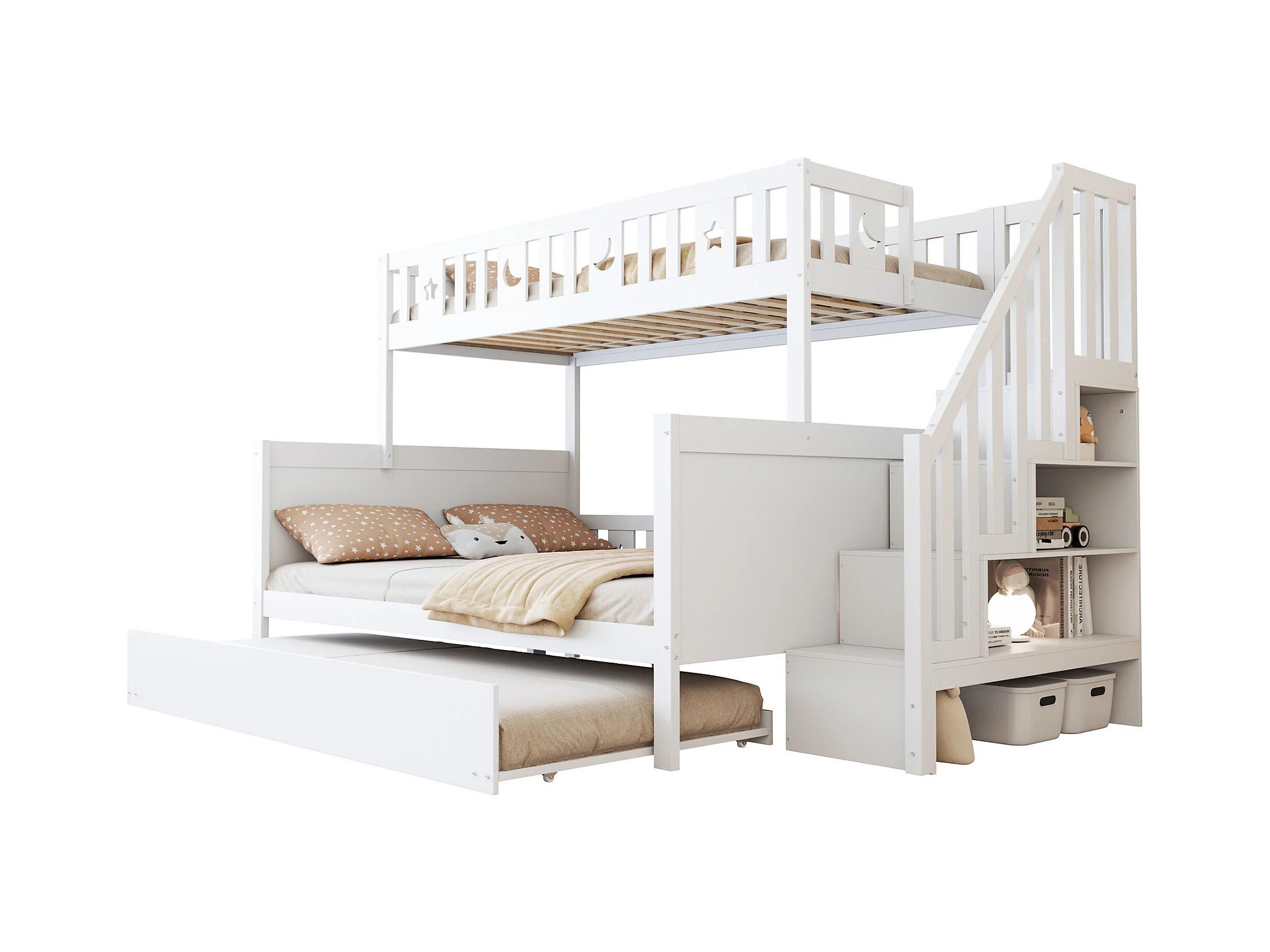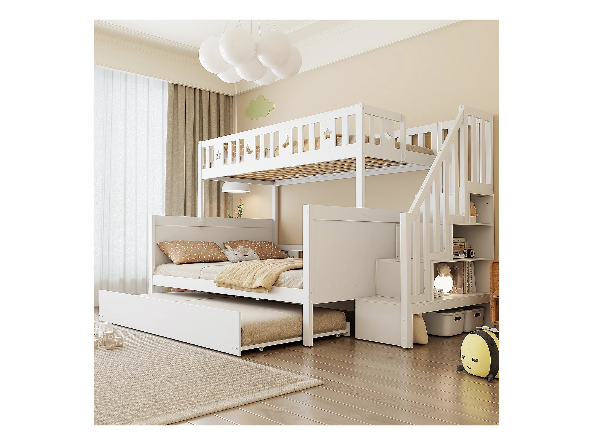 Lit superposés enfant - 90 x 200 + 140 x 200 cm - avec escalier de rangement + lit gigogne - bois - blanc